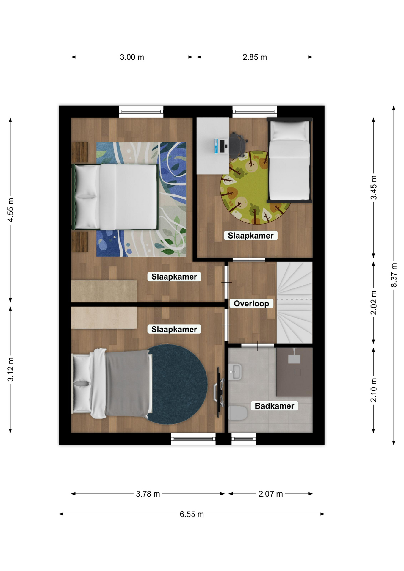 Slaapkamers zijn respectievelijk groot: