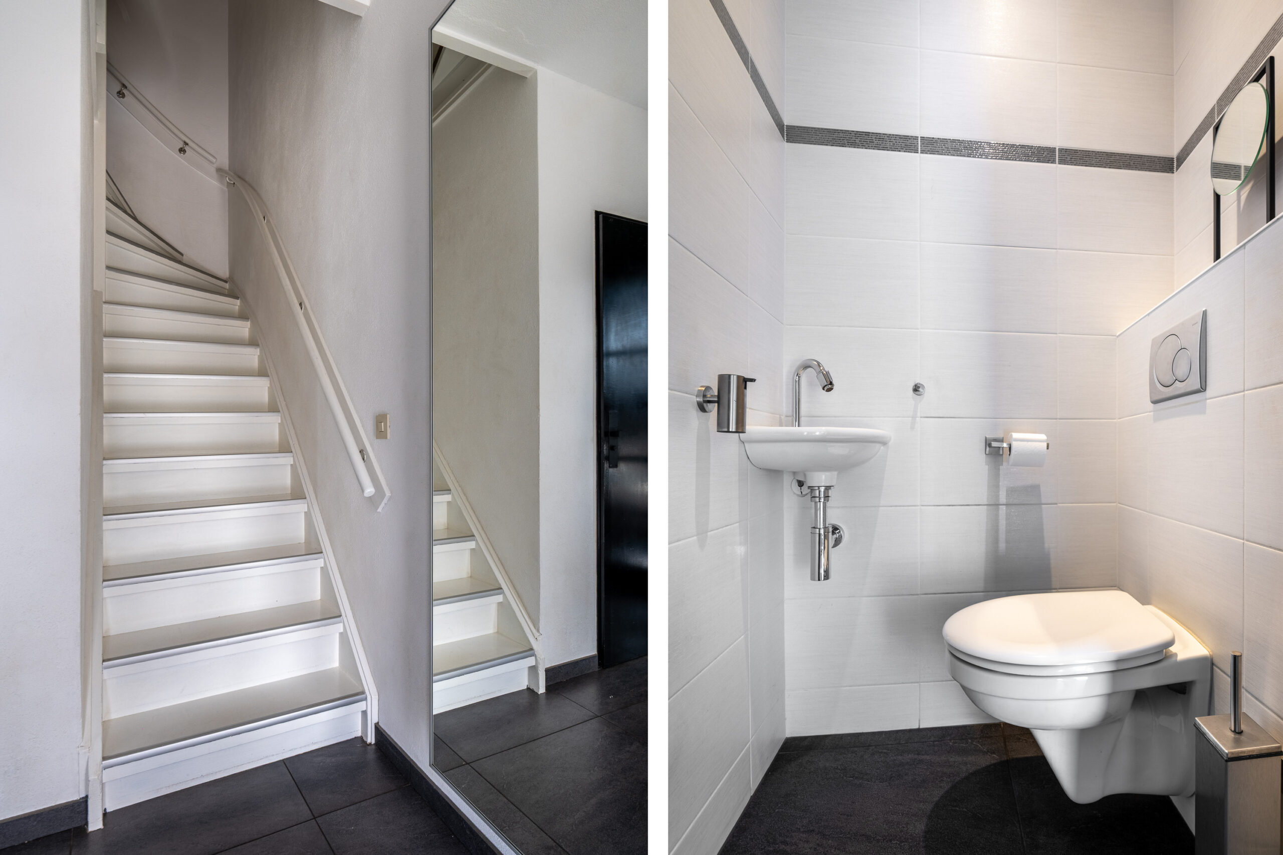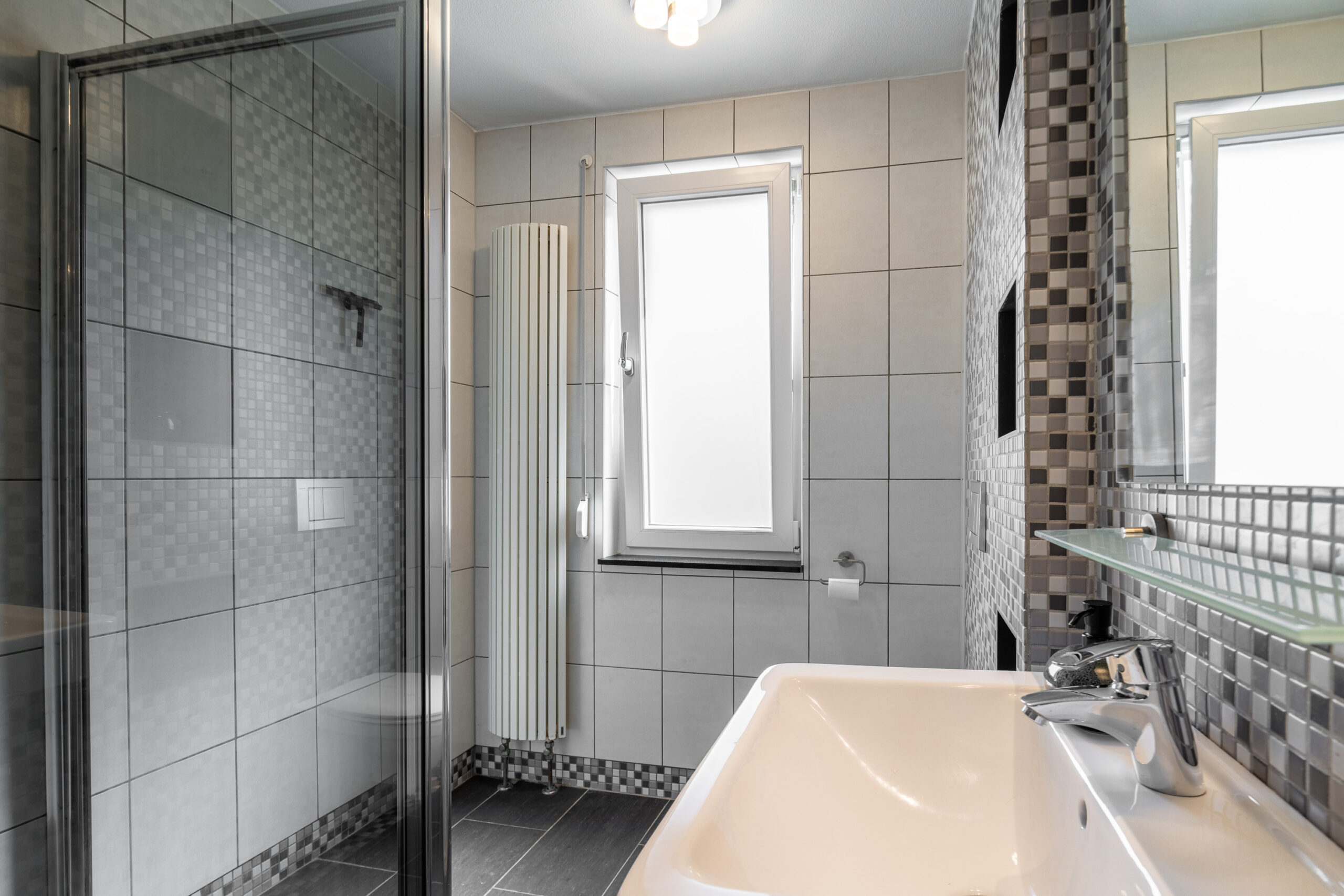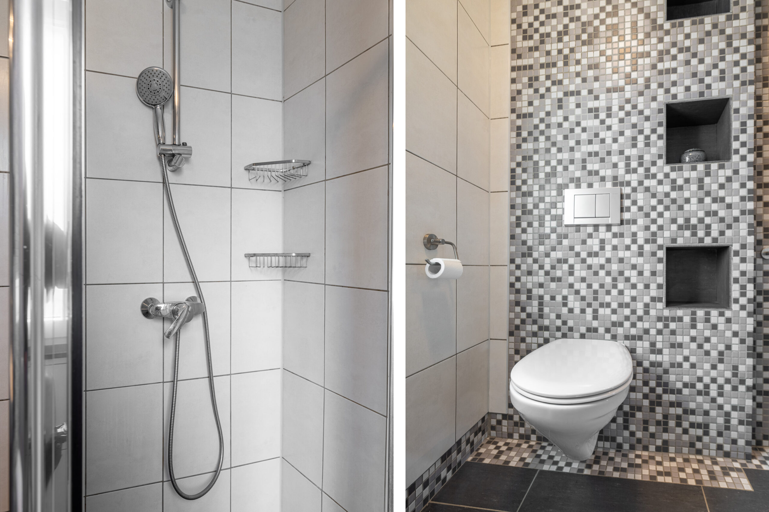 De geheel betegelde badkamer beschikt over een wastafel, tweede vrijhangend toilet, designradiator en een inloopdouche met hardglazen douchewand.