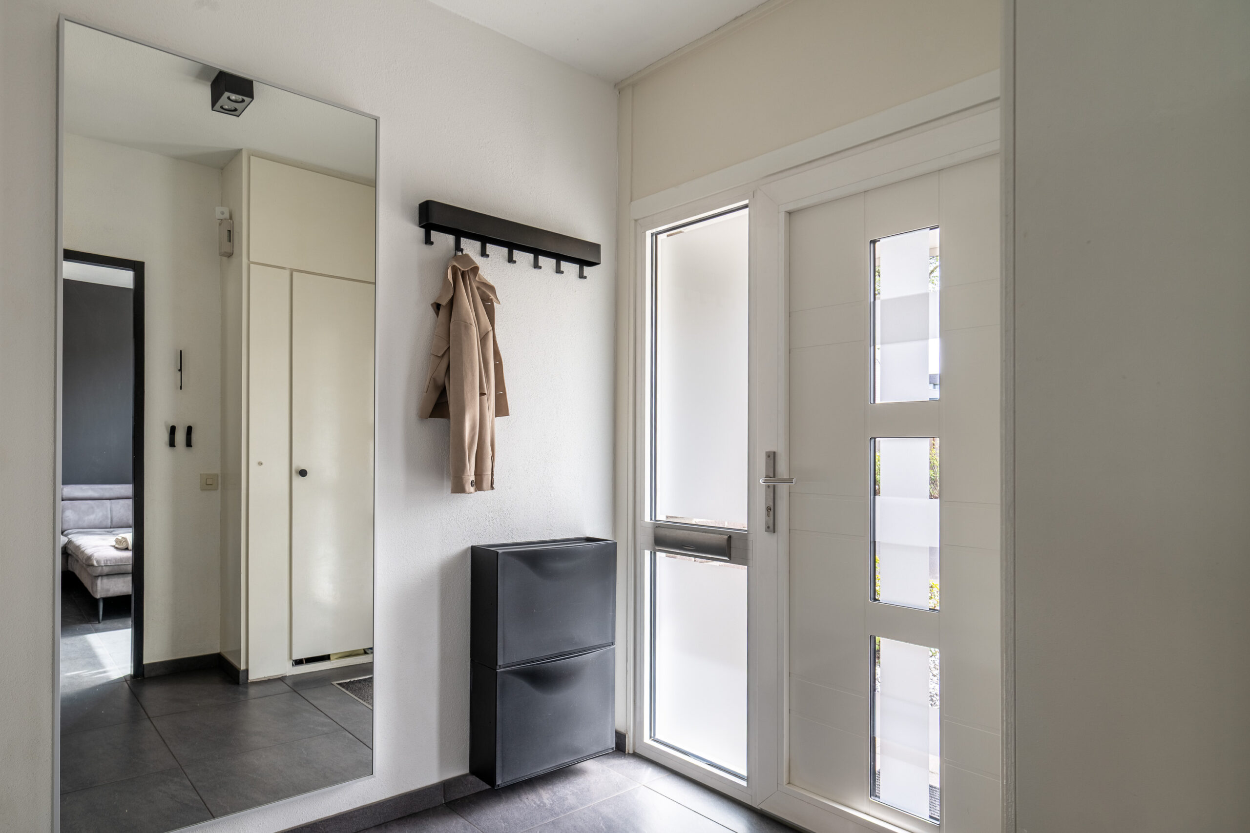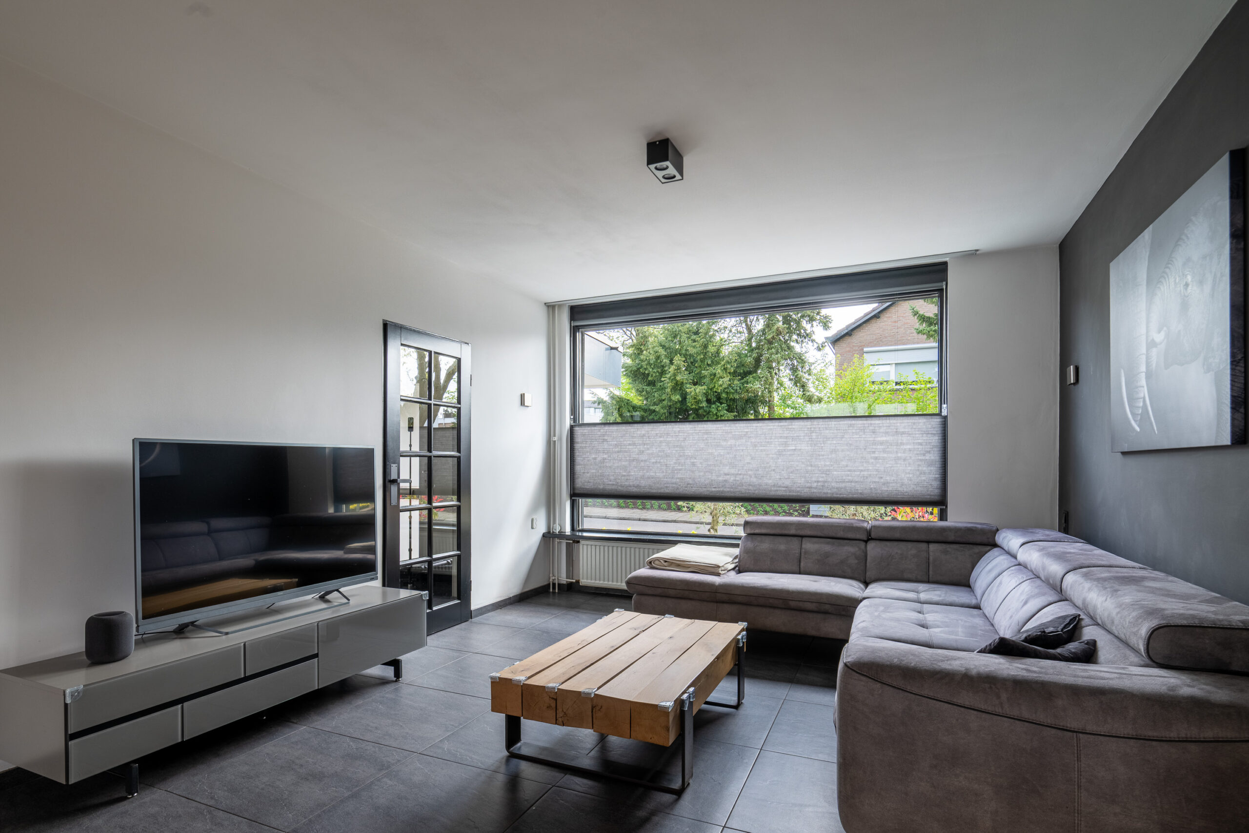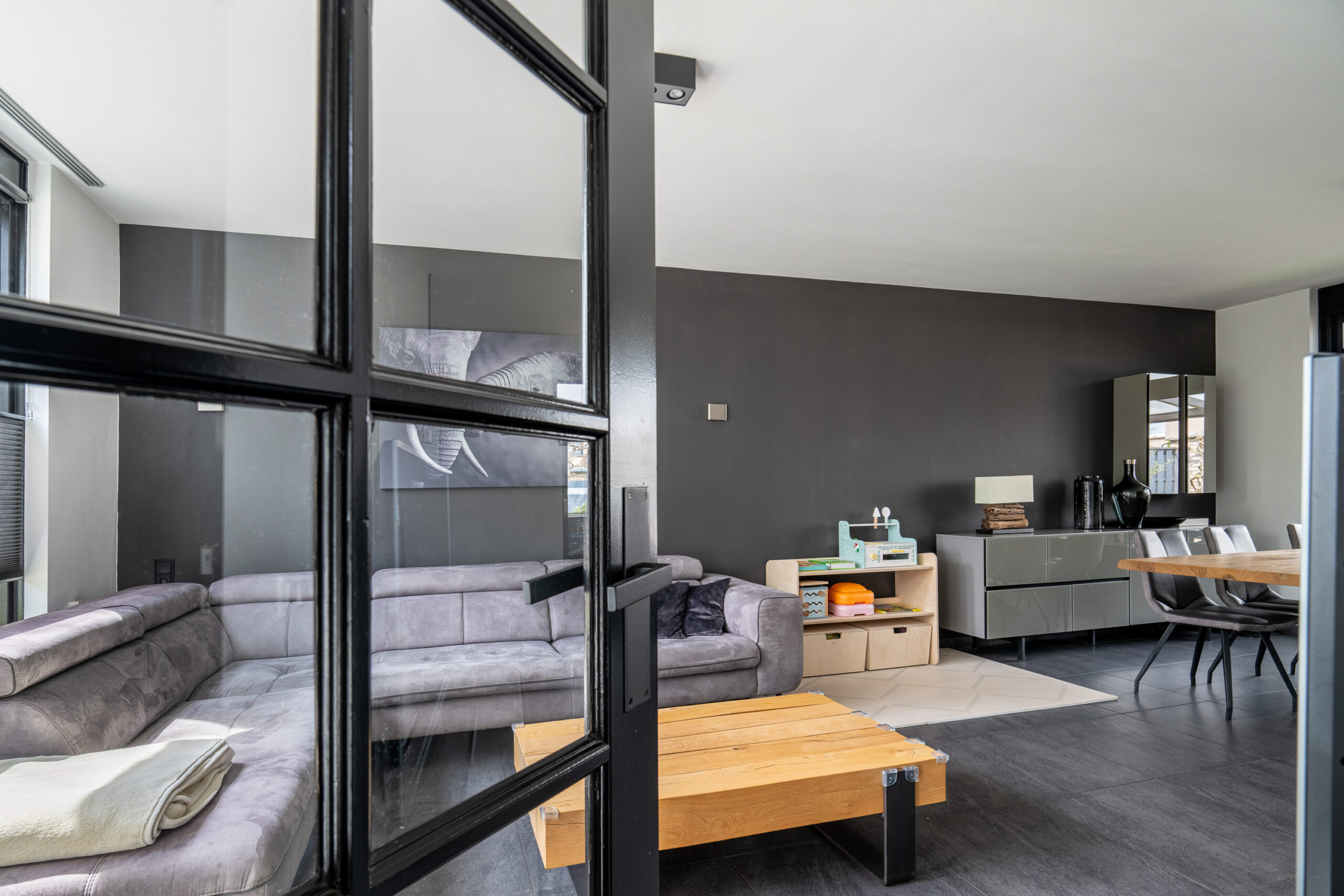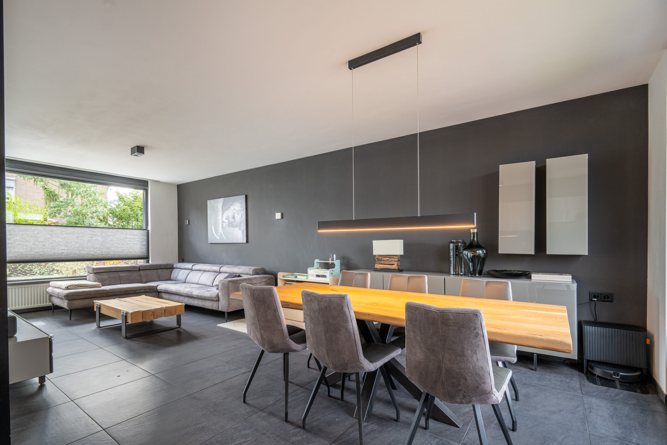 De gehele parterre is afgewerkt met een moderne antracietkleurige plavuizen vloer.