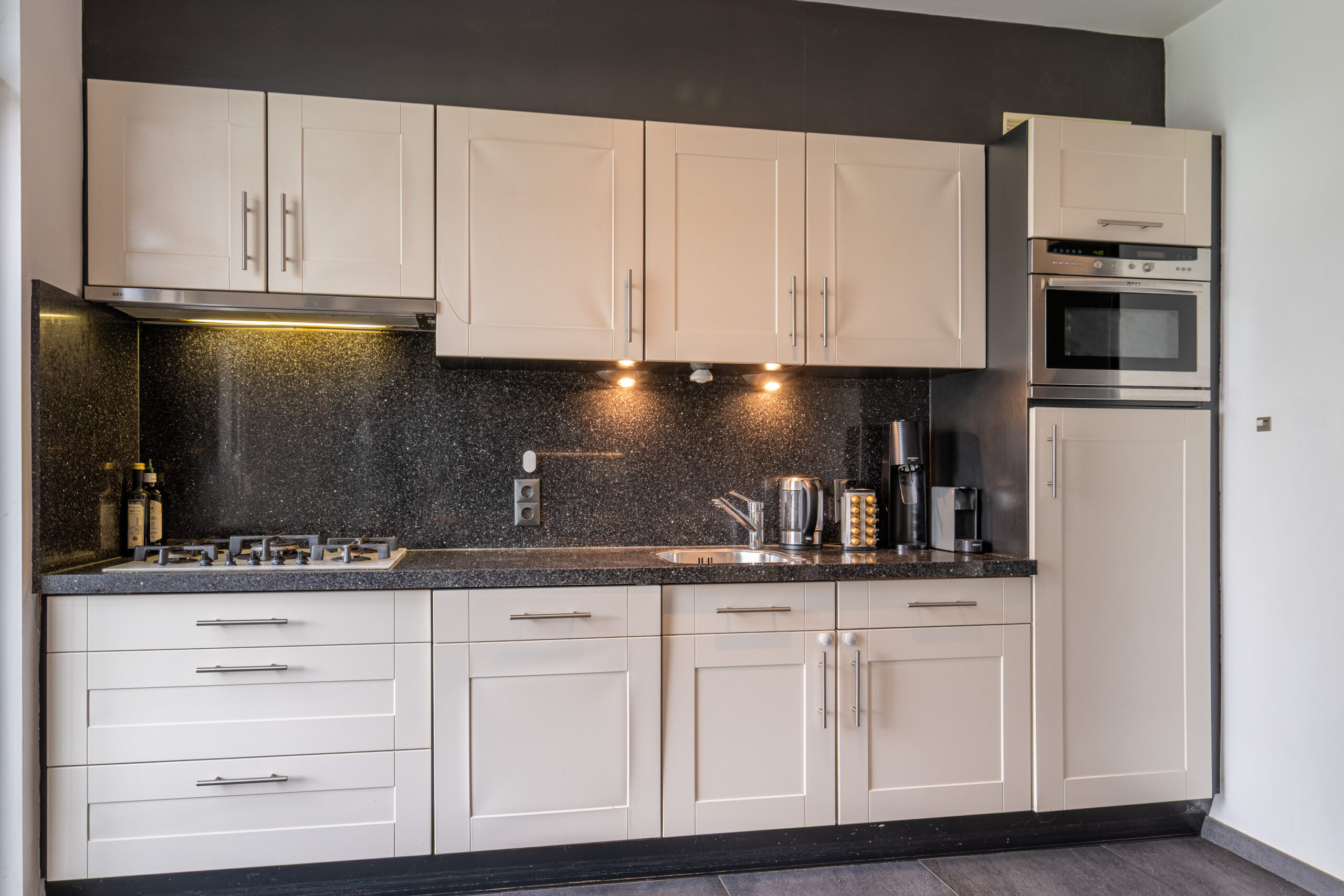De sfeervolle doorzonwoonkamer beschikt over strak gestucte wanden en een prettige lichtinval. Aansluitend bevindt zich de open keuken met witte kunststof installatie, voorzien van een granieten werkblad en achterwand. De keuken is uitgerust met een 5-pits gaskookplaat, vlakscherm-afzuigkap, vaatwasser, koelkast en combimagnetron.