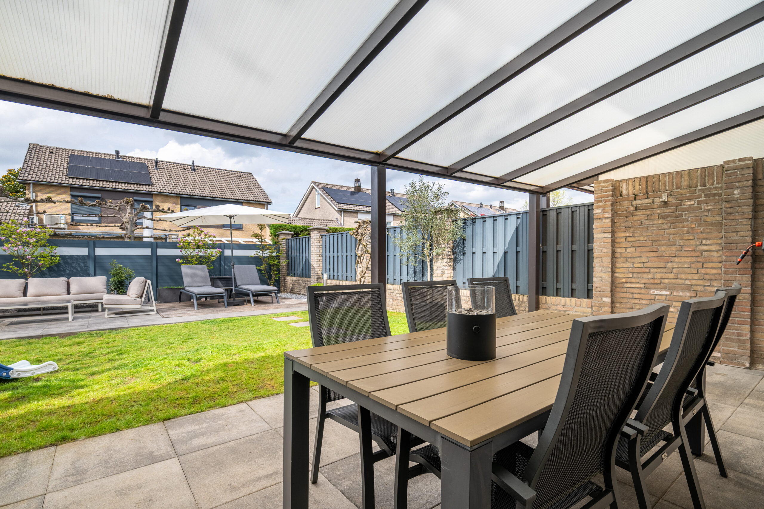 Via zowel de keuken als de garage bereikt u de fraai aangelegde, geheel omsloten en zonnige tuin. De tuin beschikt over diverse terrassen, waarvan één is voorzien van een aluminium overkapping.