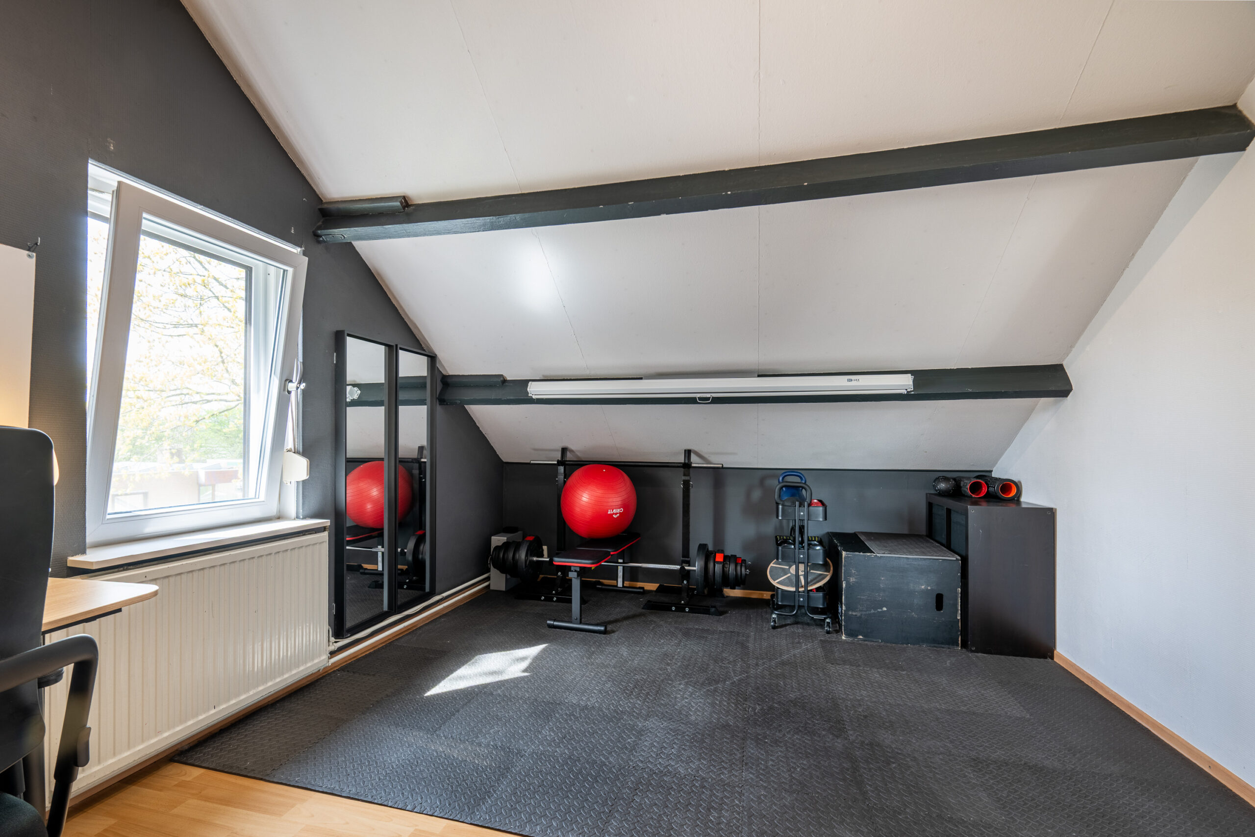 Via een vaste trap bereikt u de geïsoleerde zolderverdieping. Hier bevinden zich een ruime overloop, een separate bergruimte met de combi-cv/HR-ketel van Bosch (2005, eigendom) en een vierde ruime slaap-/hobbykamer, momenteel in gebruik als sport- en werkruimte.