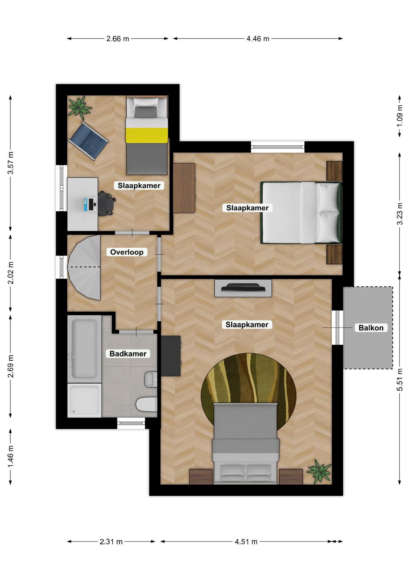 2) 4.46 m x 3.23 m — De middelgrote slaapkamer beschikt over een eigen wastafel, ideaal voor extra gemak.
