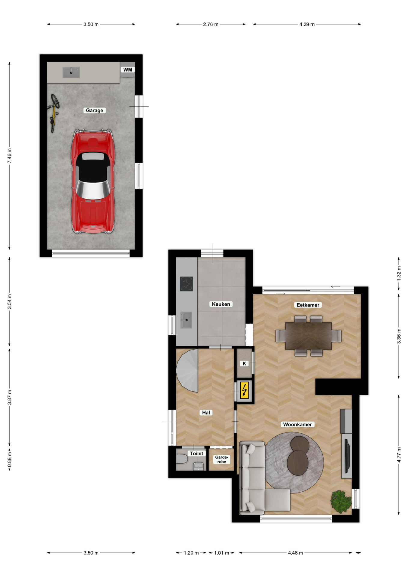 De ruime garage is eveneens een pluspunt: uitgerust met een elektrische sectionaalpoort, wasmachineaansluiting en extra aanrechtunit, biedt deze volop mogelijkheden voor hobby, opslag of het stallen van fietsen en apparatuur.