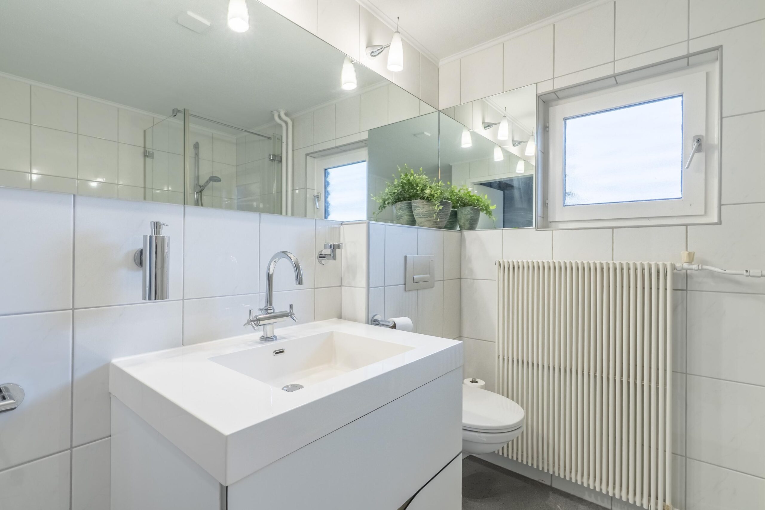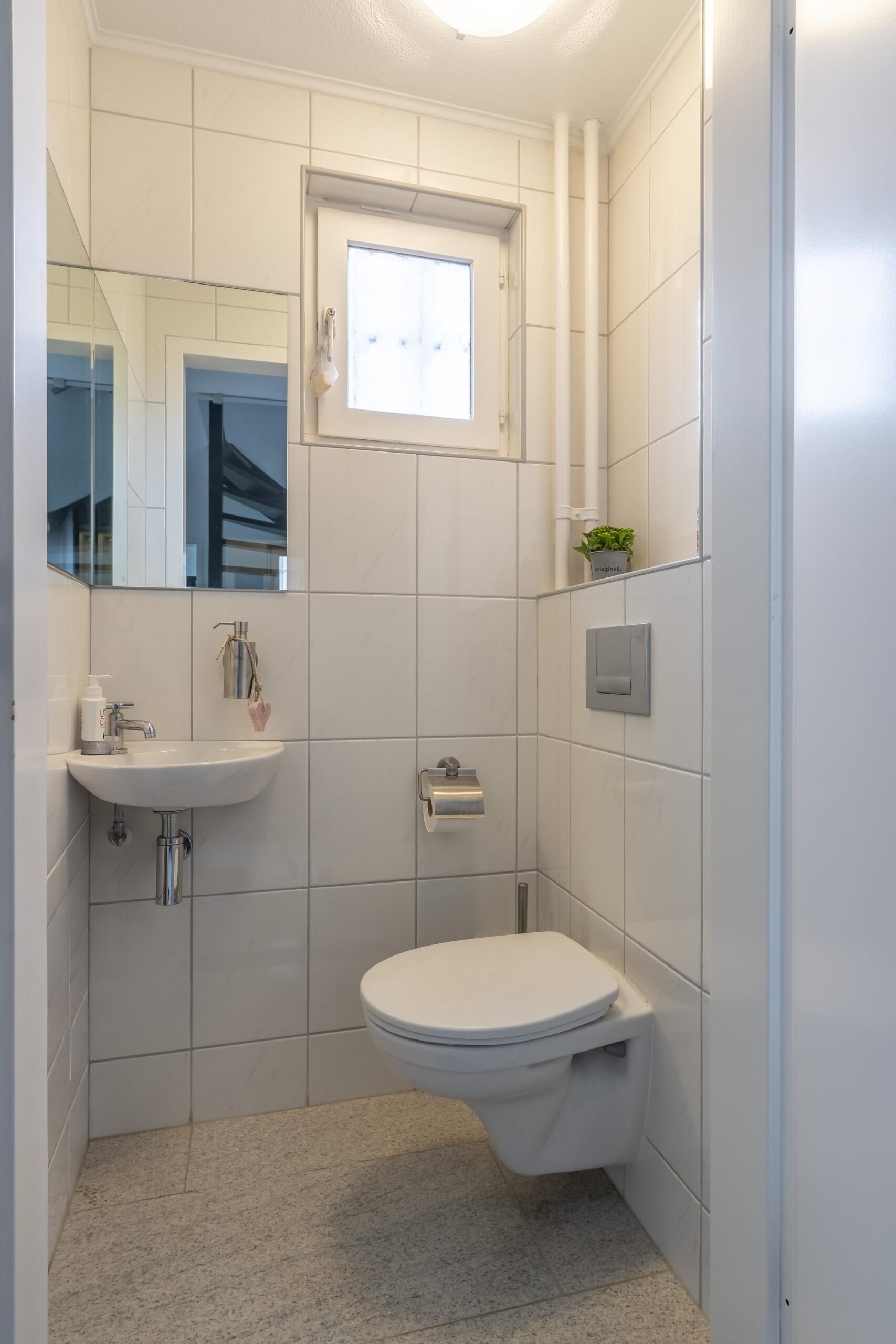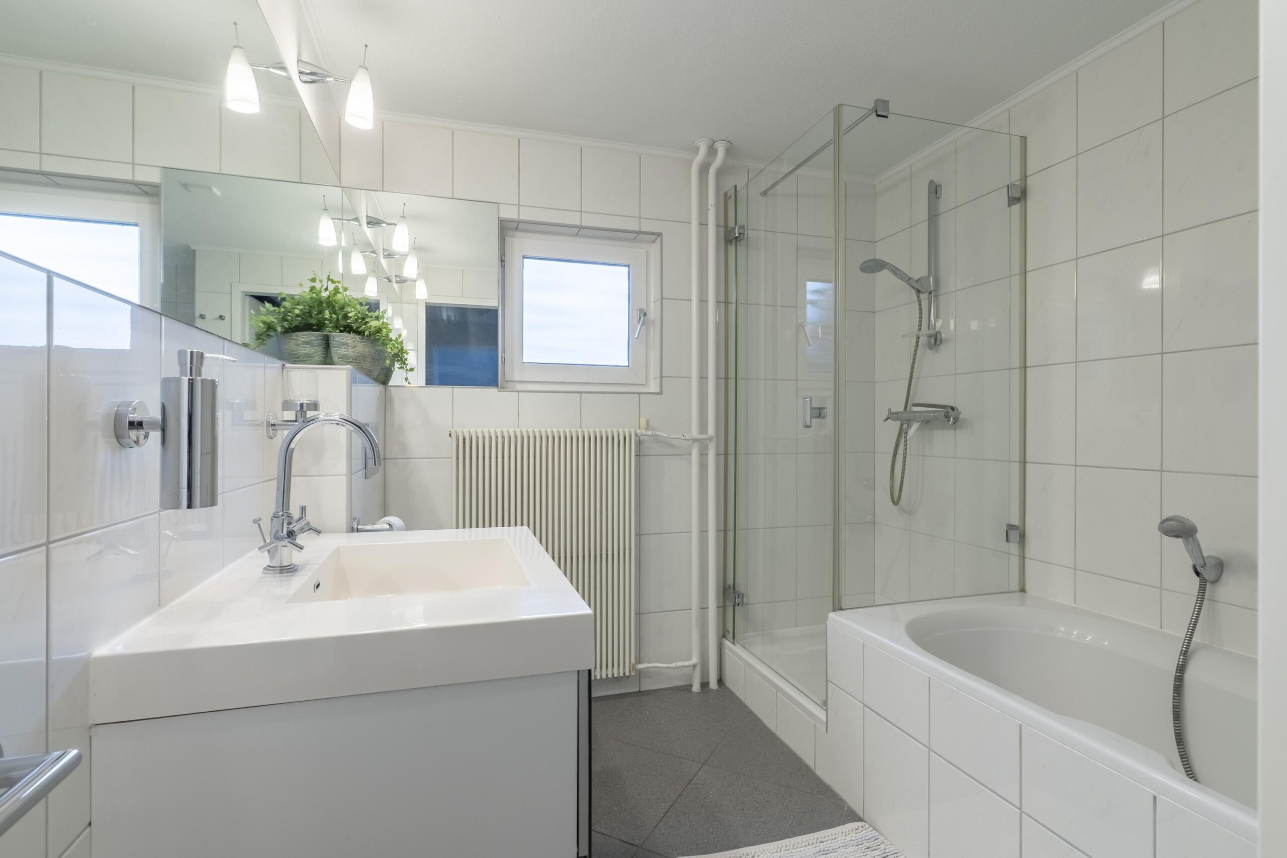 De badkamer is geheel betegeld, bijzonder netjes onderhouden en compleet uitgerust met een tweede vrijhangend toilet, ligbad, douchecabine, wastafel met modern ombouwmeubel en een raam voor natuurlijke ventilatie.
