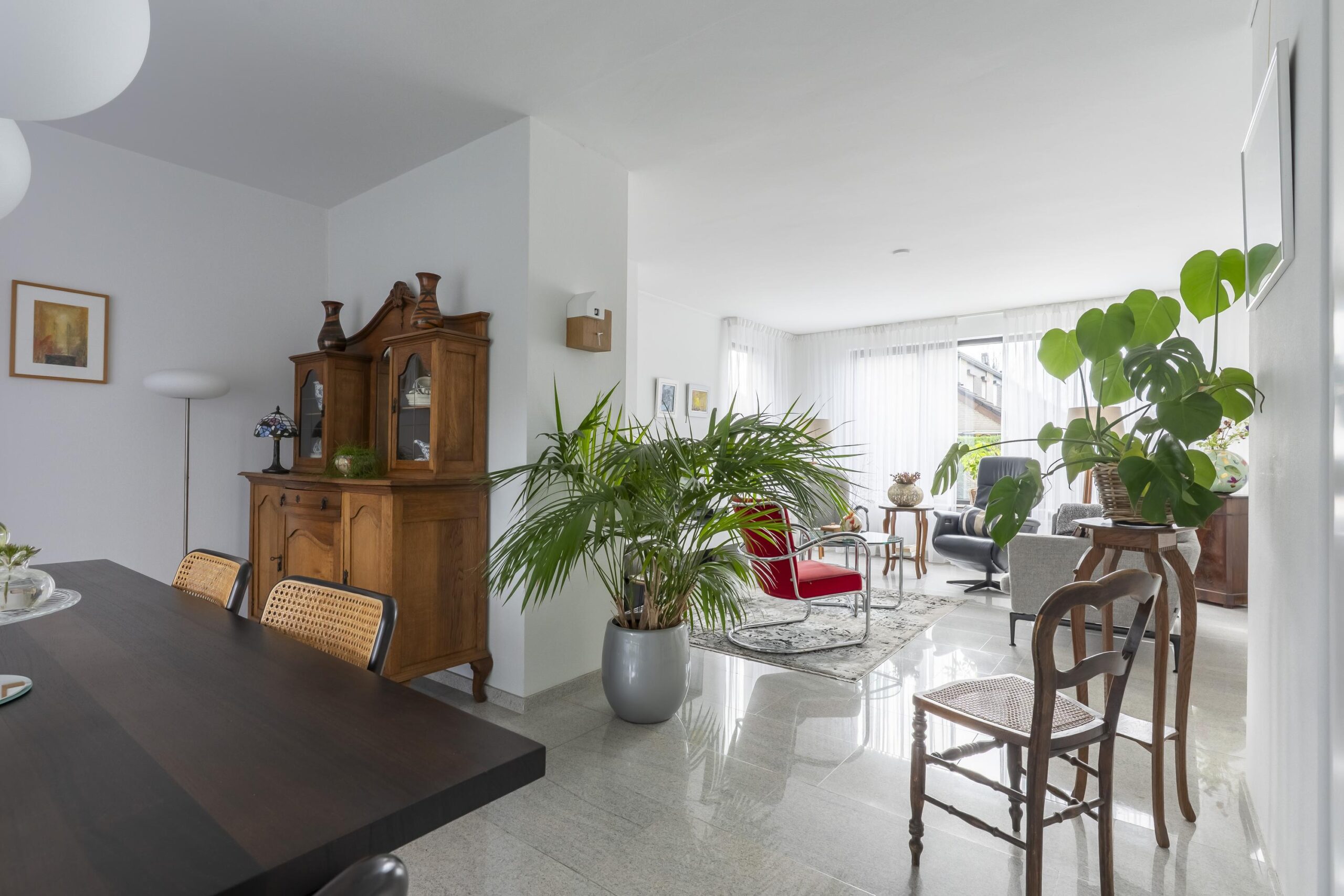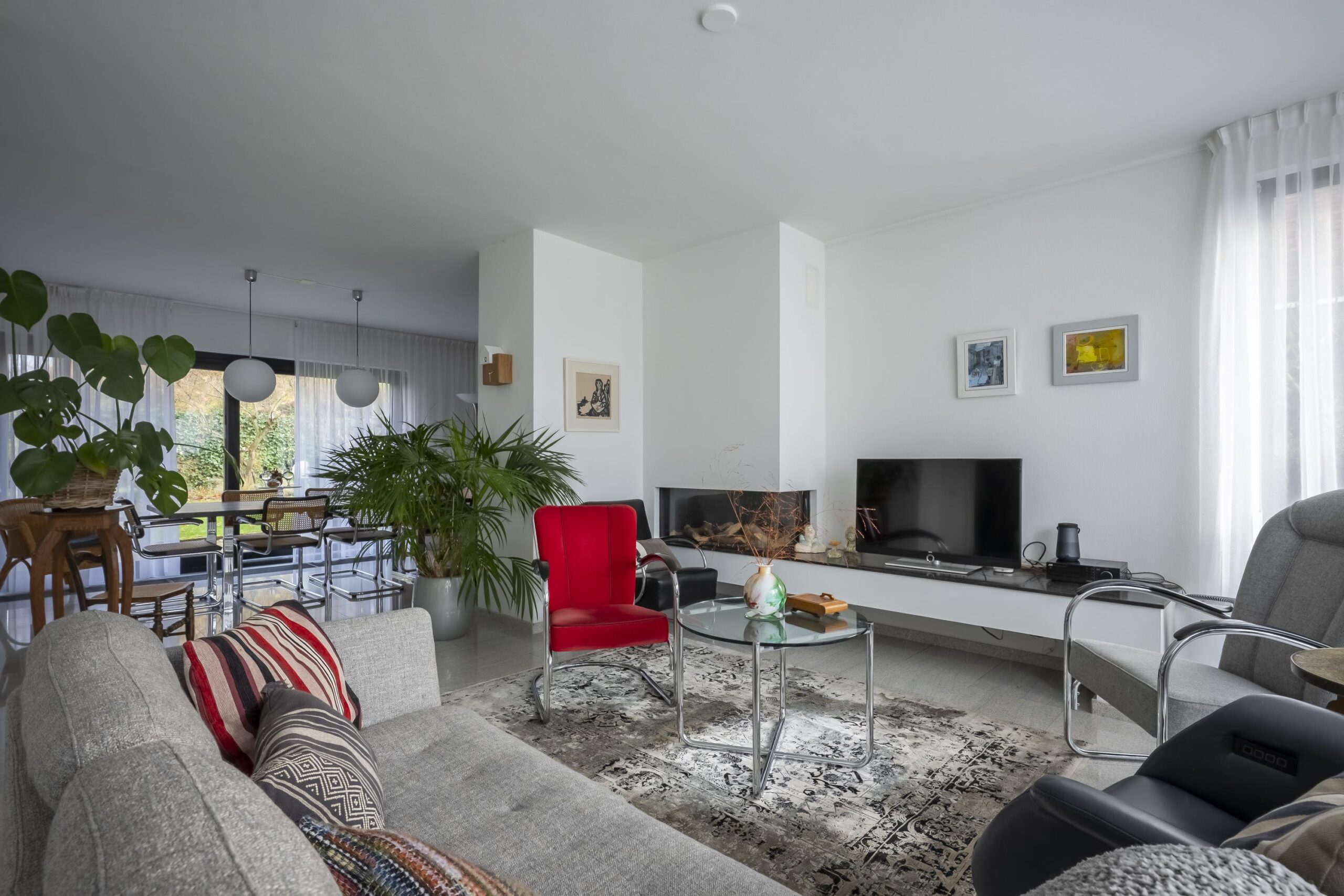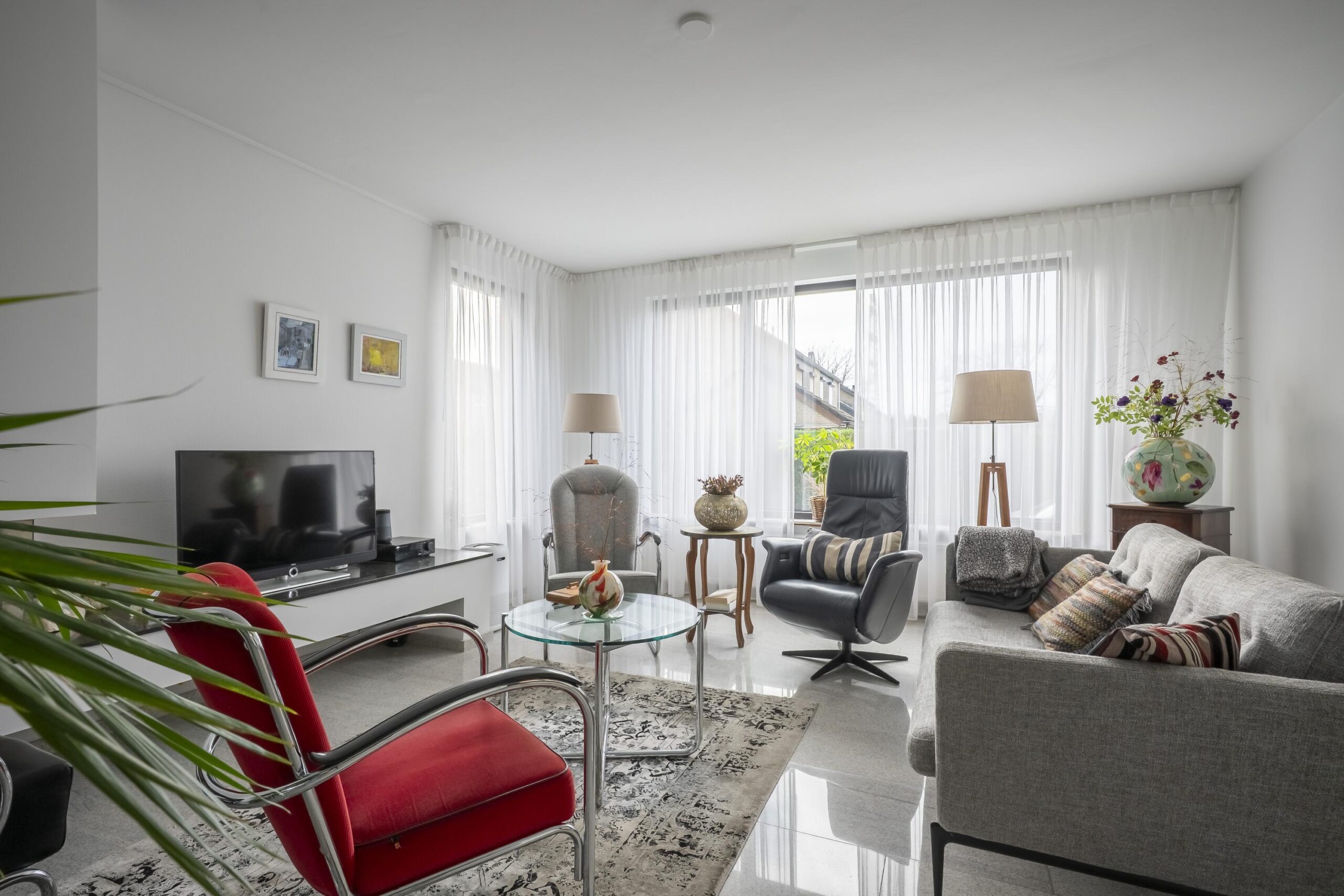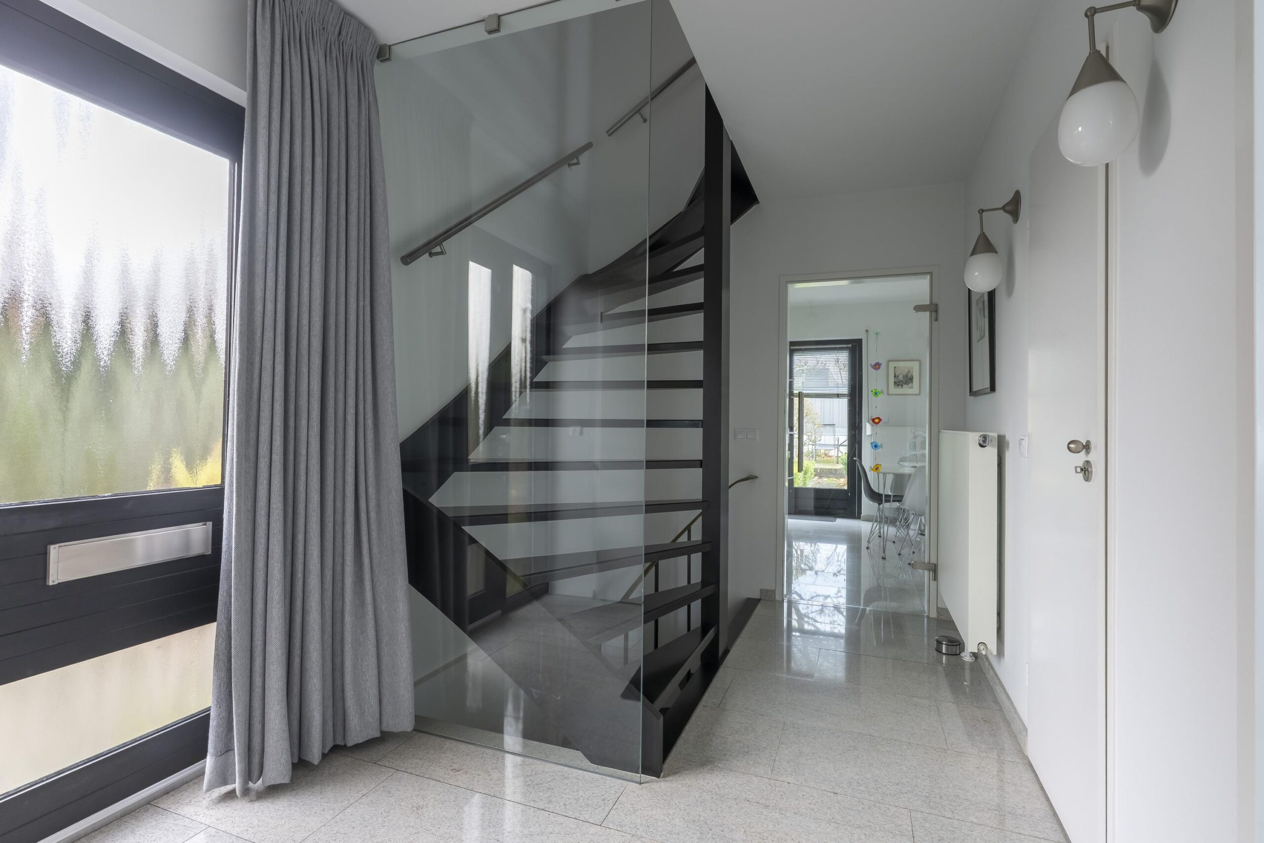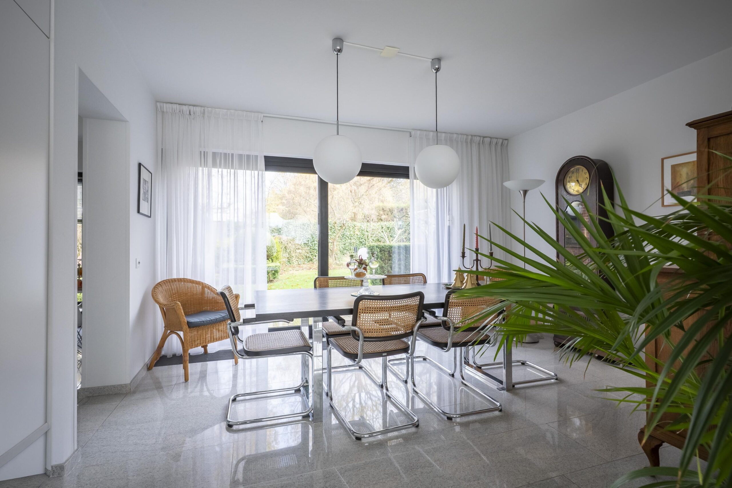 Een glazen deur opent naar de sfeervolle en uitstekend afgewerkte living, waar de royale raampartijen zorgen voor een prachtige lichtinval en een bijzonder aangename leefruimte. Het eetgedeelte is voorzien van een brede hardhouten schuifpui met elektrisch zonnescherm, een moderne inbouwkast én direct tuincontact, waardoor binnen en buiten naadloos in elkaar overlopen.