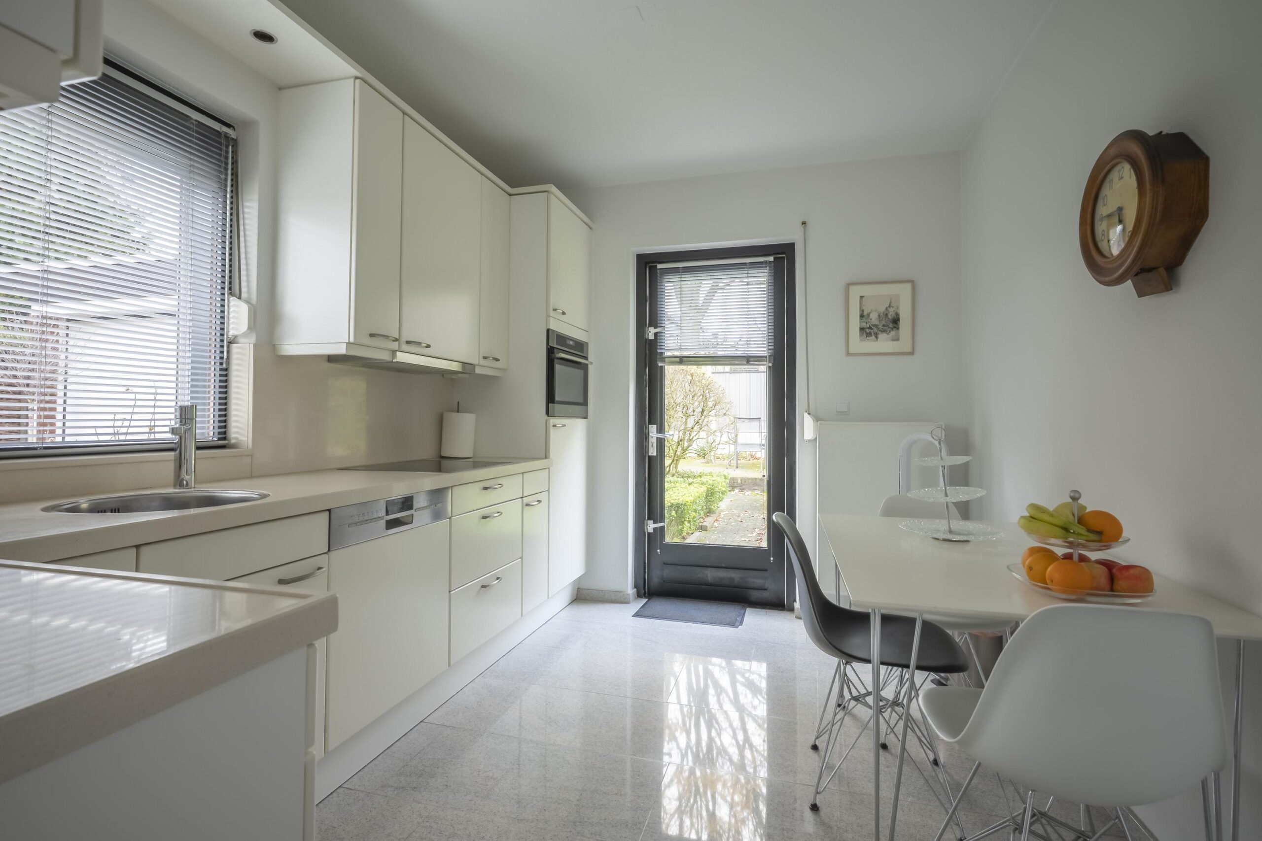 Aan de achterzijde bevindt zich de verzorgde L-vormige keuken, uitgerust met een stijlvol composieten werkblad en diverse inbouwapparatuur zoals een keramische kookplaat, afzuigkap, vaatwasser, combi-oven en koelkast. De gehele parterre is afgewerkt met een doorlopende, moderne en onderhoudsarme granieten vloer, die zorgt voor een luxe en uniforme uitstraling.