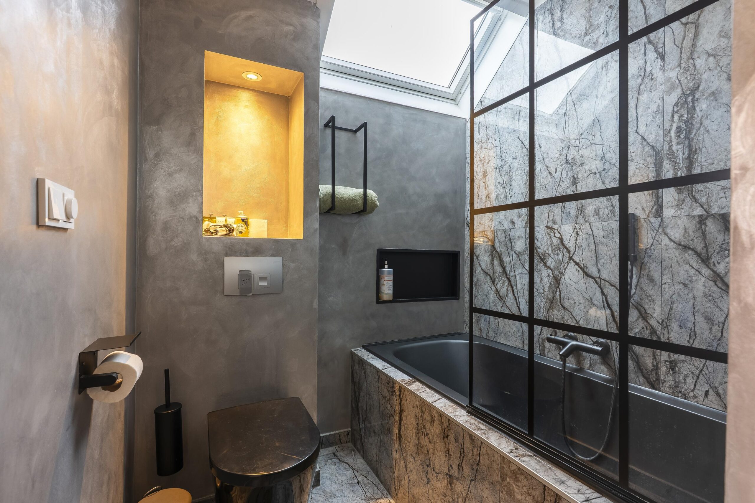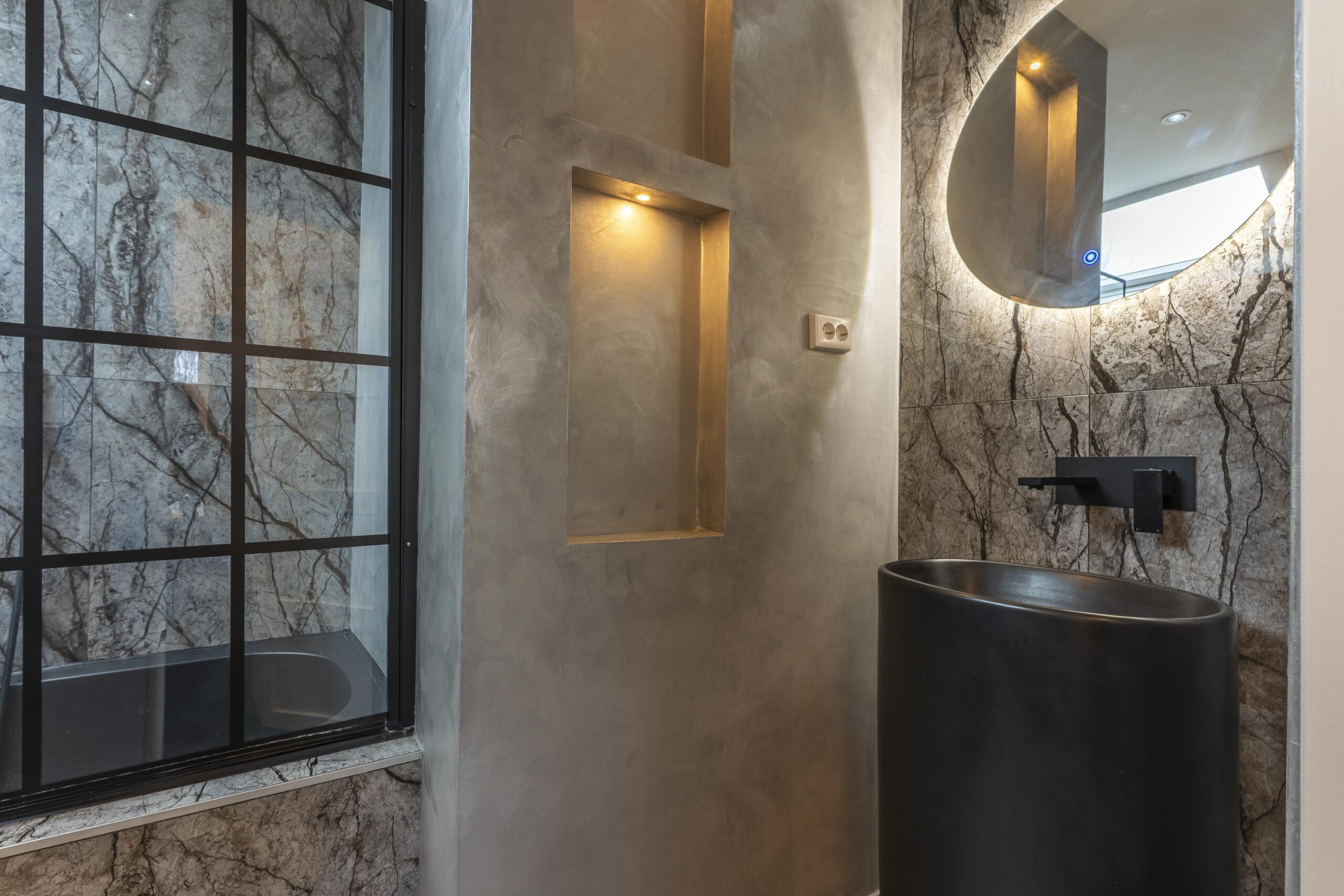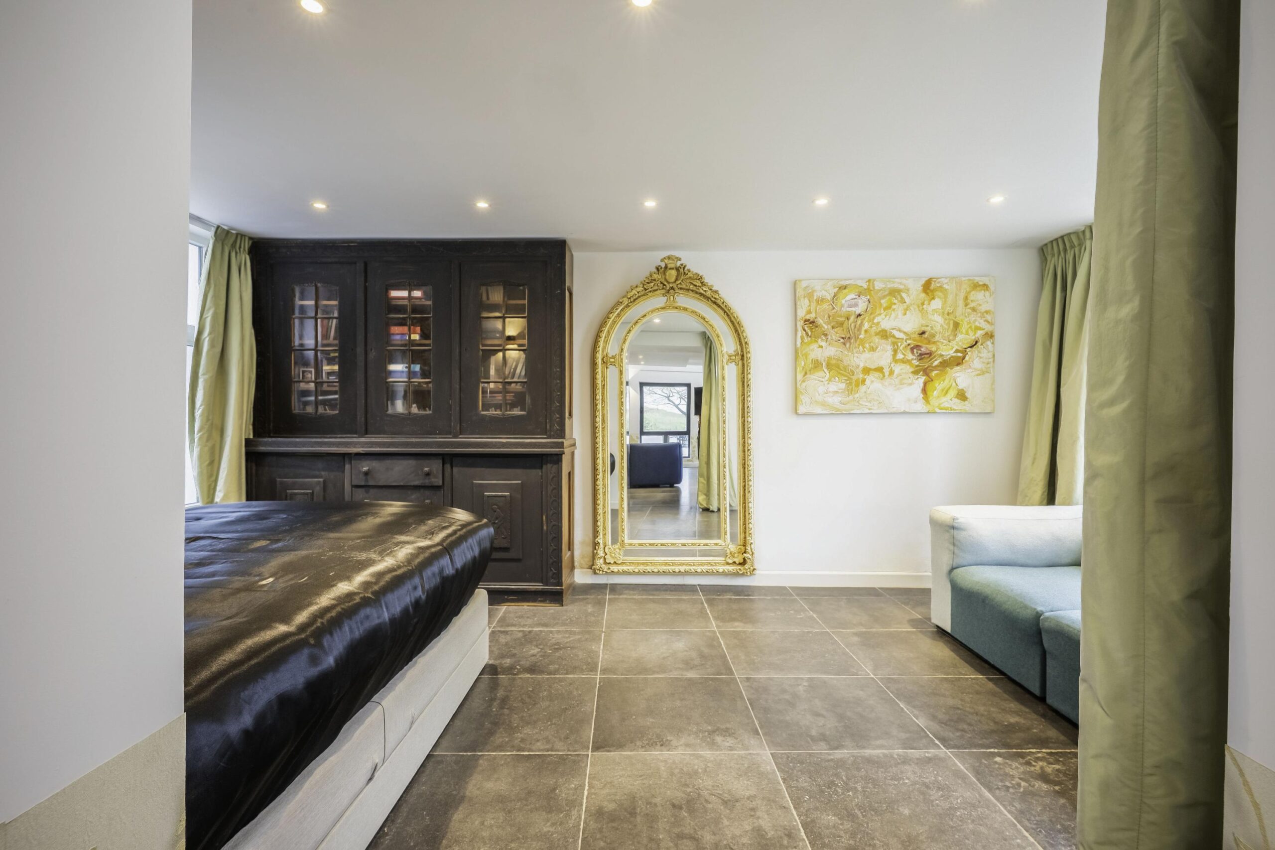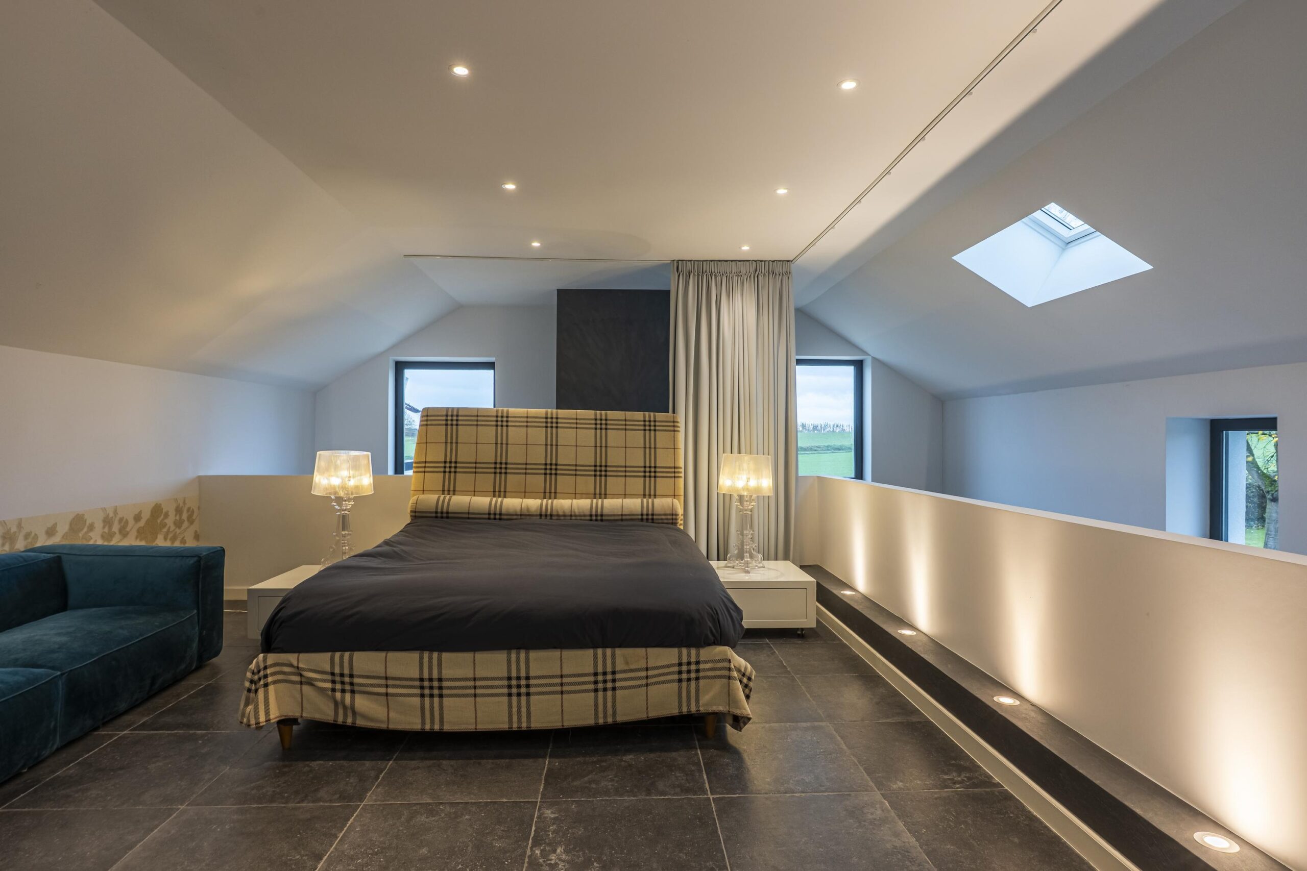 De Master Suite op de eerste verdieping is een oase van rust. De deels opengewerkte vloer-plafondzone creëert een sculpturaal spel van licht en hoogte, waardoor boven- en beneden ramen elkaars licht versterken. De badkamer in betonfresco is modern, helder en zorgvuldig geproportioneerd.