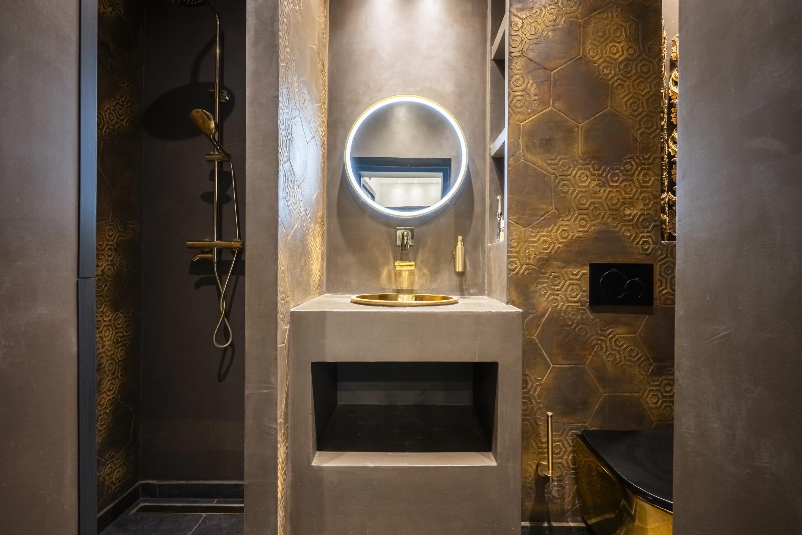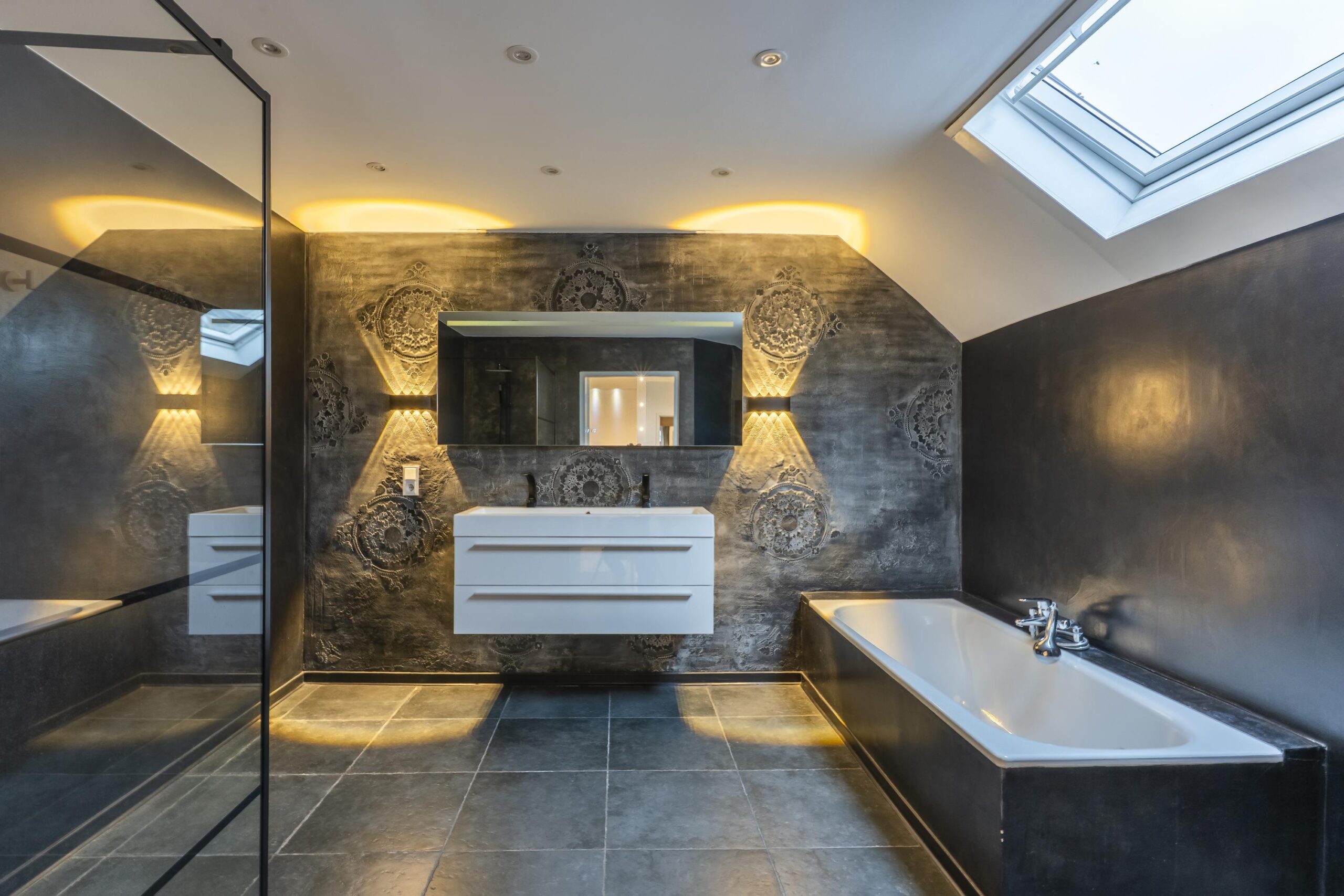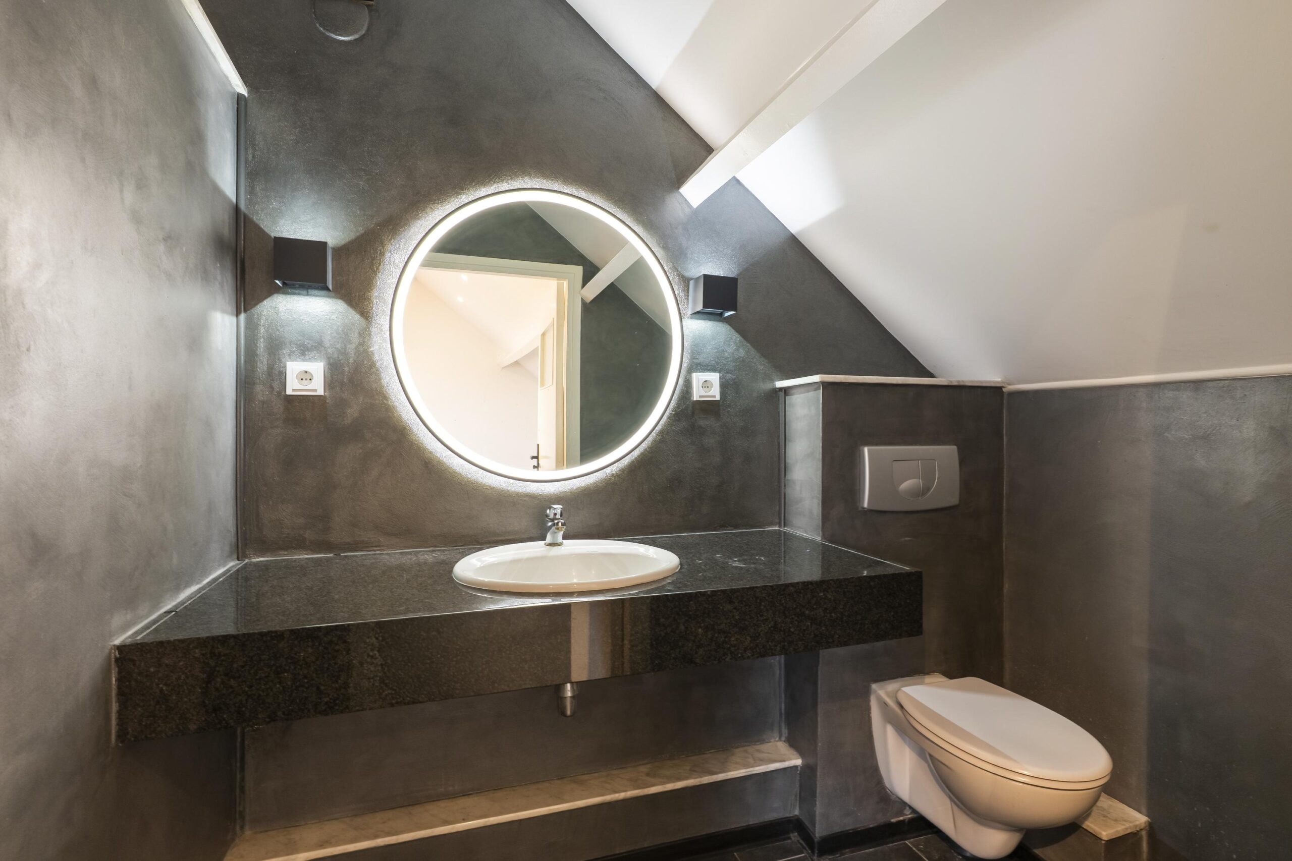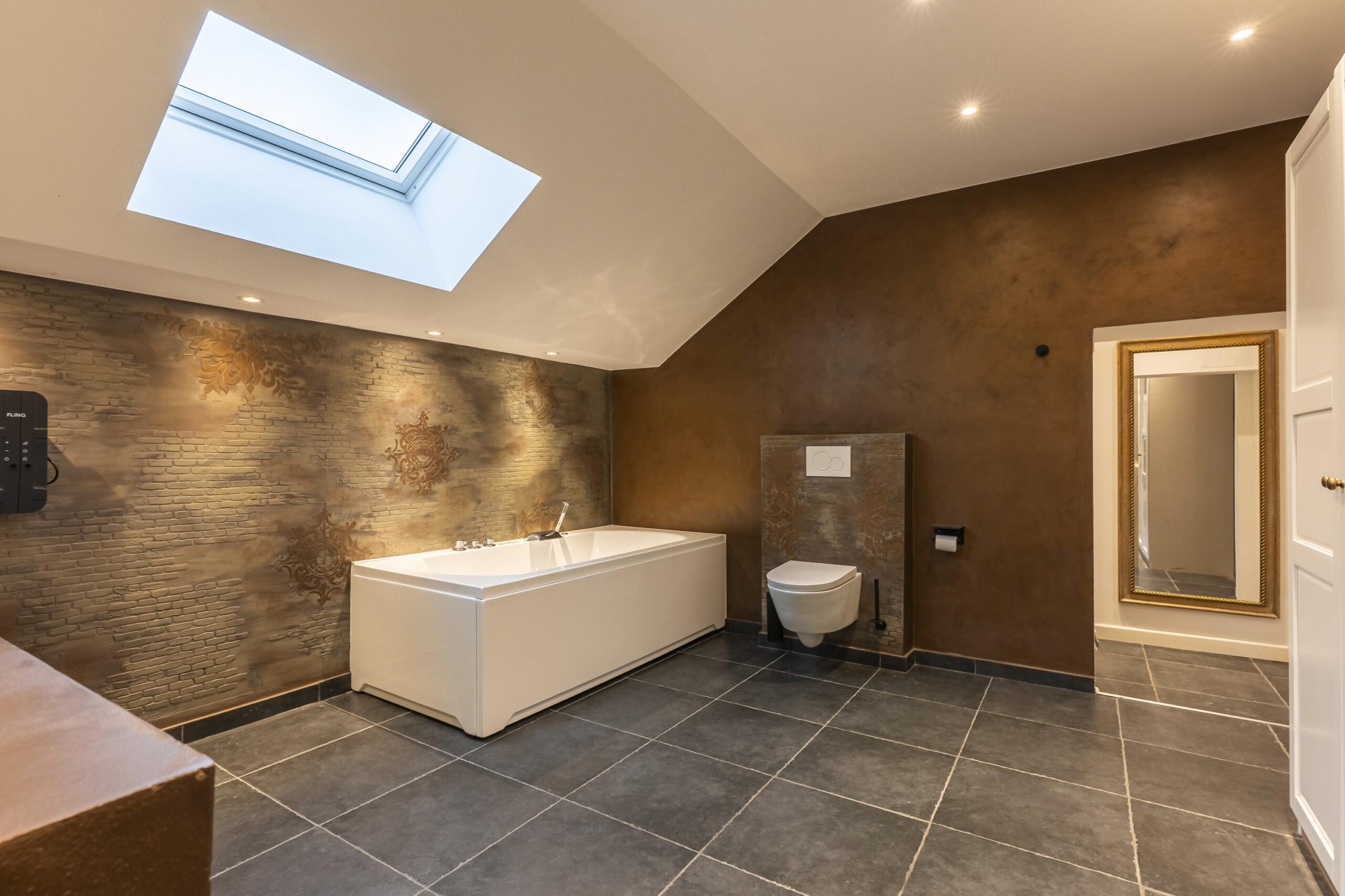 De Master Suite op de eerste verdieping is een oase van rust. De deels opengewerkte vloer-plafondzone creëert een sculpturaal spel van licht en hoogte, waardoor boven- en beneden ramen elkaars licht versterken. De badkamer in betonfresco is modern, helder en zorgvuldig geproportioneerd.