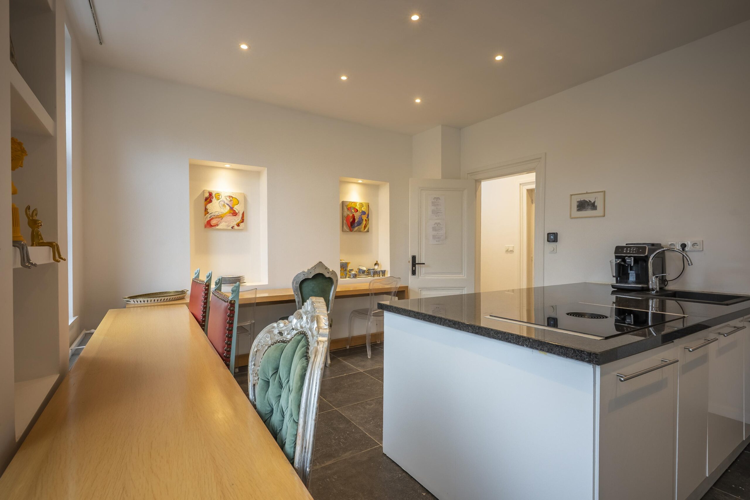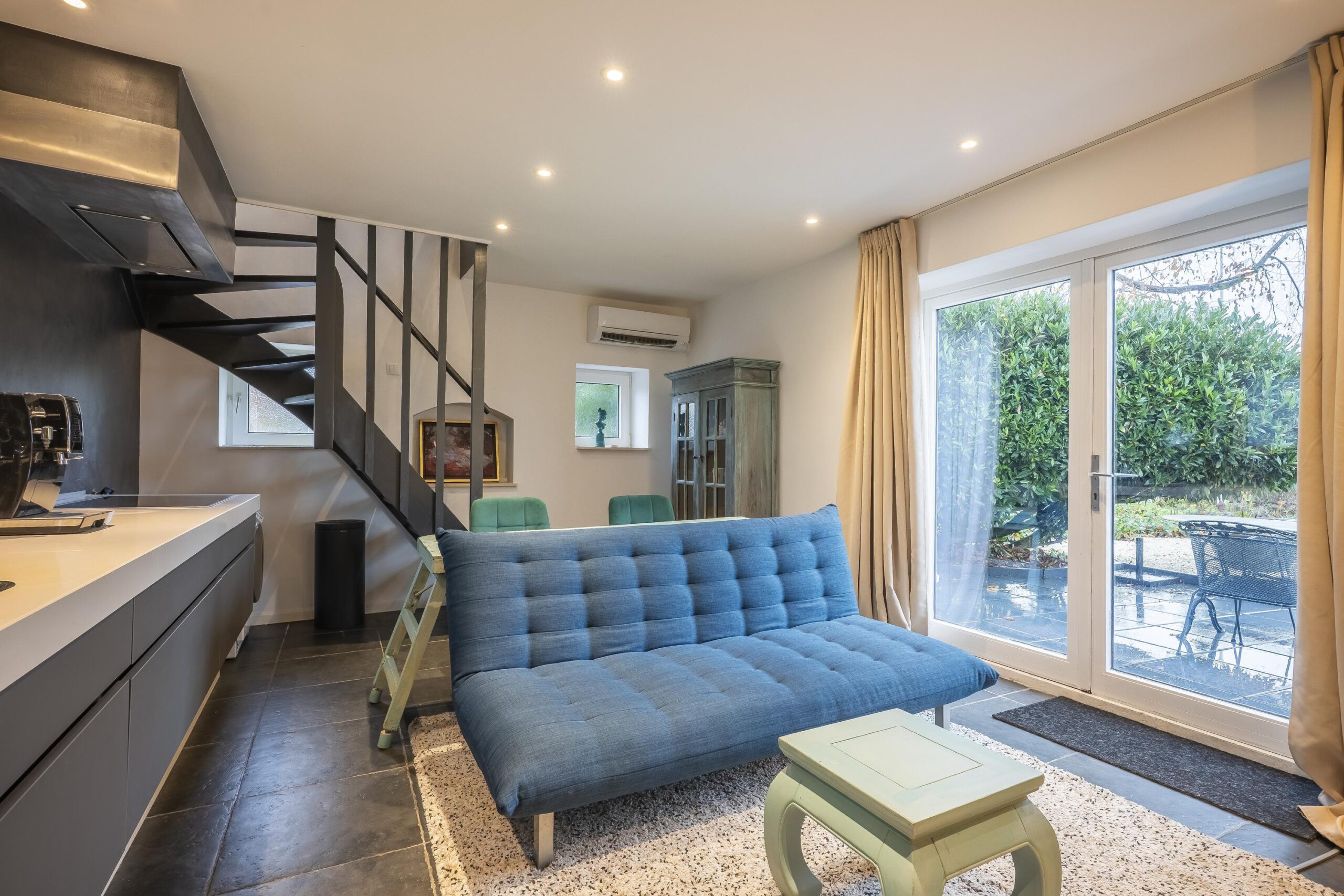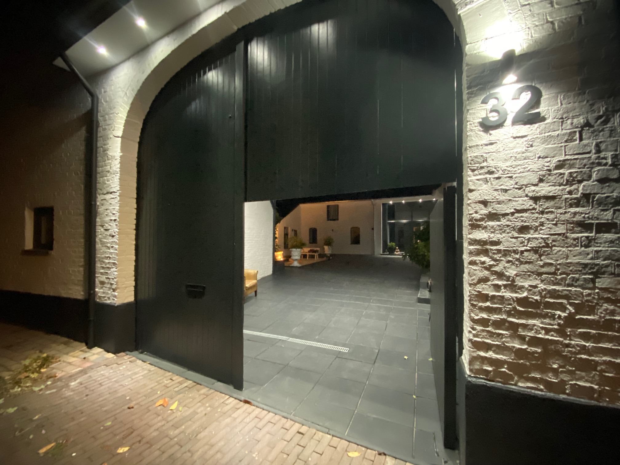 Het hoofdhuis is ontworpen rond licht, rust en een kristalheldere materiaalconsistentie. De ruime leefkeuken – uitgerust met Gaggenau apparatuur – vormt het hart van de woning. De aangrenzende living straalt ingetogen luxe uit, met grote raampartijen, een houtkachel en directe verbinding naar zowel cour als tuin. Grote antracietvloeren lopen door tot buiten, waardoor binnen en buiten naadloos in elkaar overvloeien. Een studeerkamer (of extra slaapkamer) op de begane grond en de elegante Golden Bathroom maken deze woonlaag compleet.