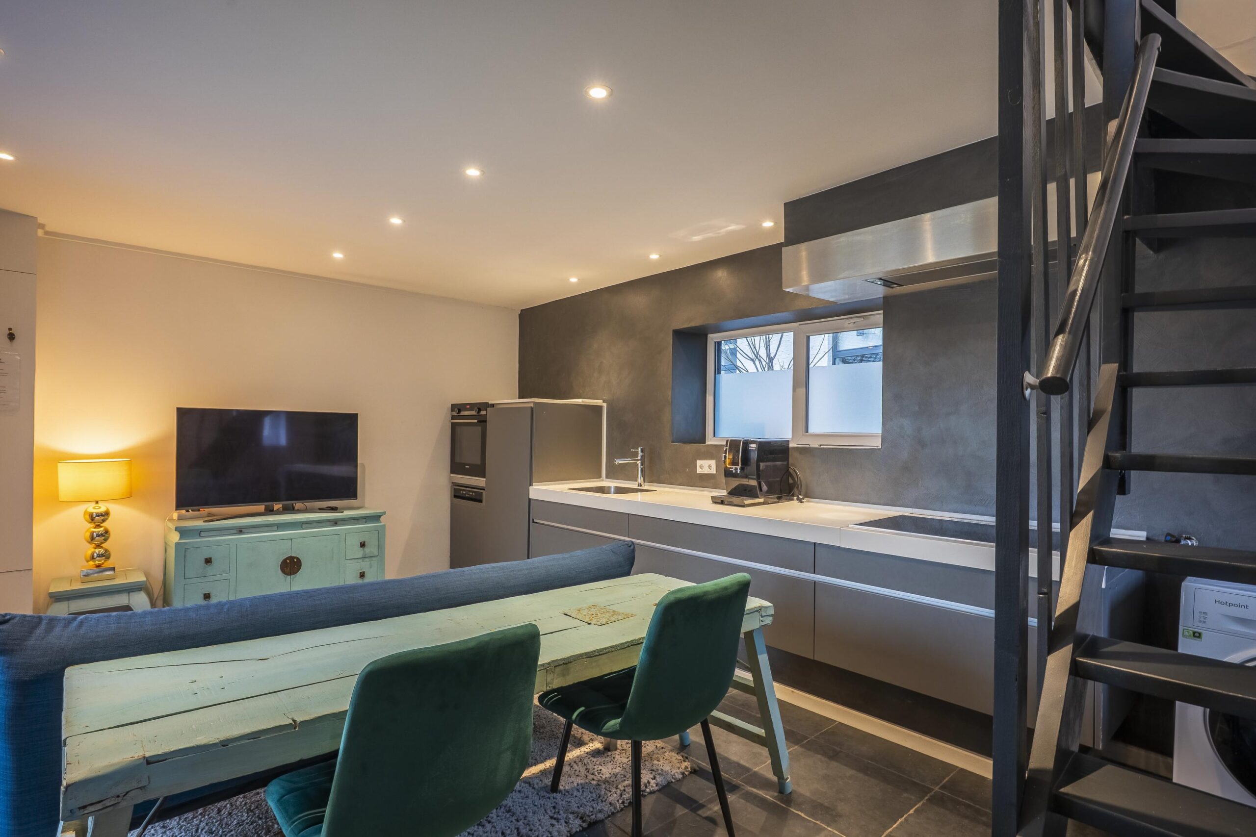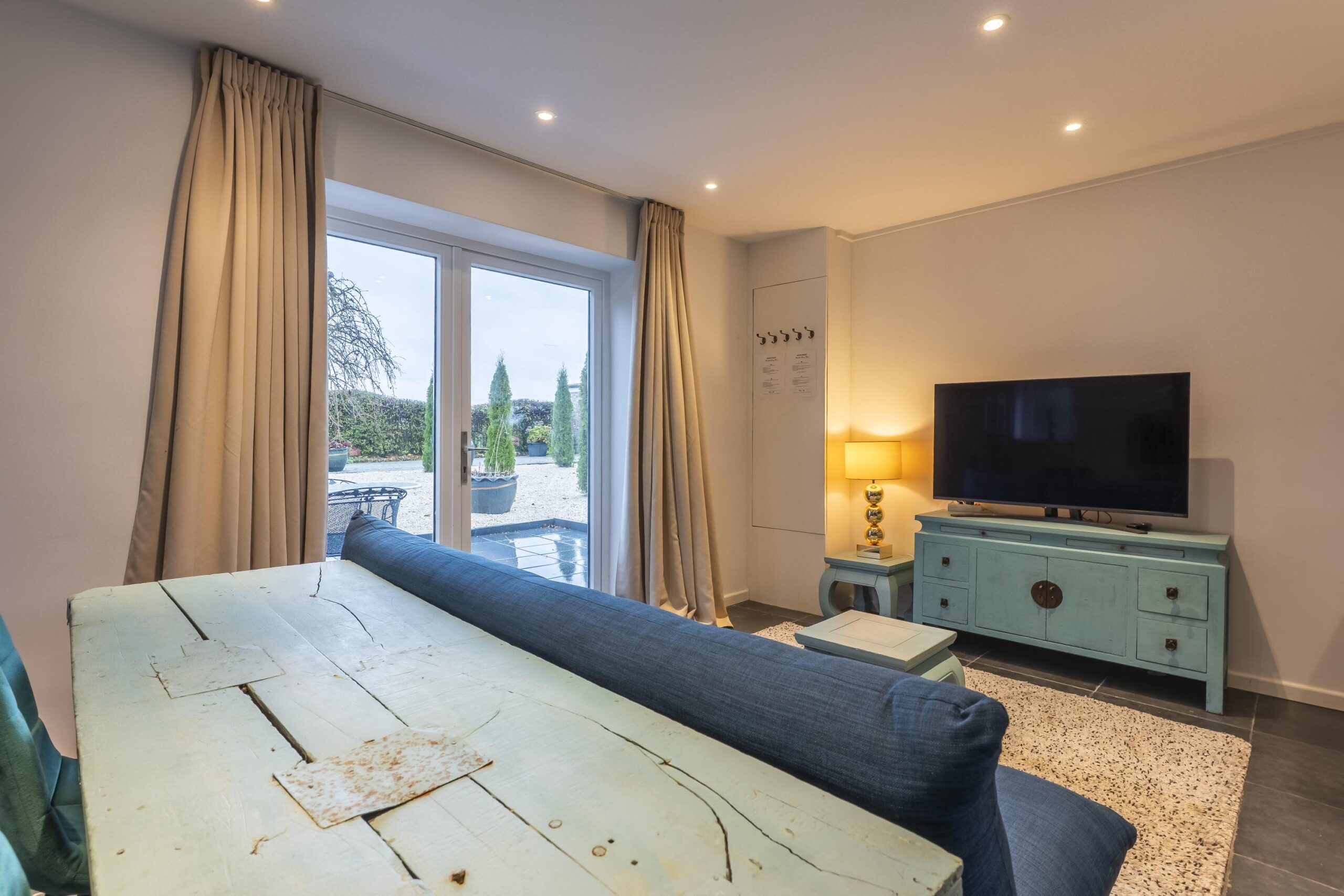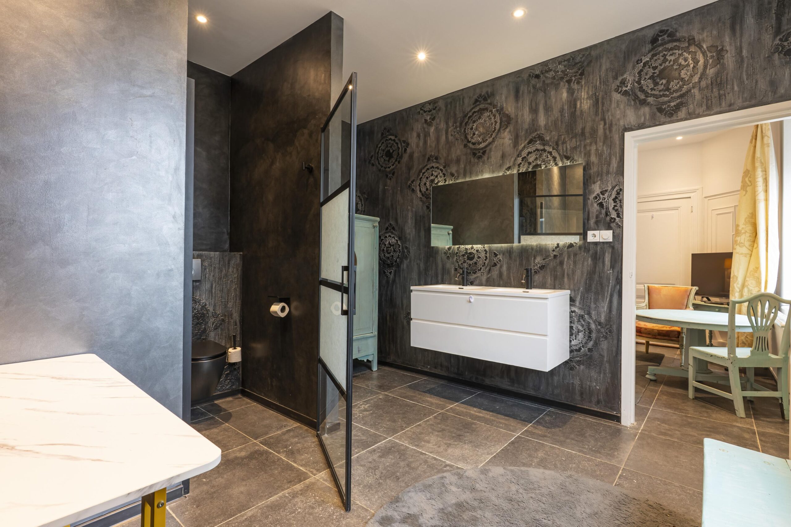 Het hoofdhuis is ontworpen rond licht, rust en een kristalheldere materiaalconsistentie. De ruime leefkeuken – uitgerust met Gaggenau apparatuur – vormt het hart van de woning. De aangrenzende living straalt ingetogen luxe uit, met grote raampartijen, een houtkachel en directe verbinding naar zowel cour als tuin. Grote antracietvloeren lopen door tot buiten, waardoor binnen en buiten naadloos in elkaar overvloeien. Een studeerkamer (of extra slaapkamer) op de begane grond en de elegante Golden Bathroom maken deze woonlaag compleet.