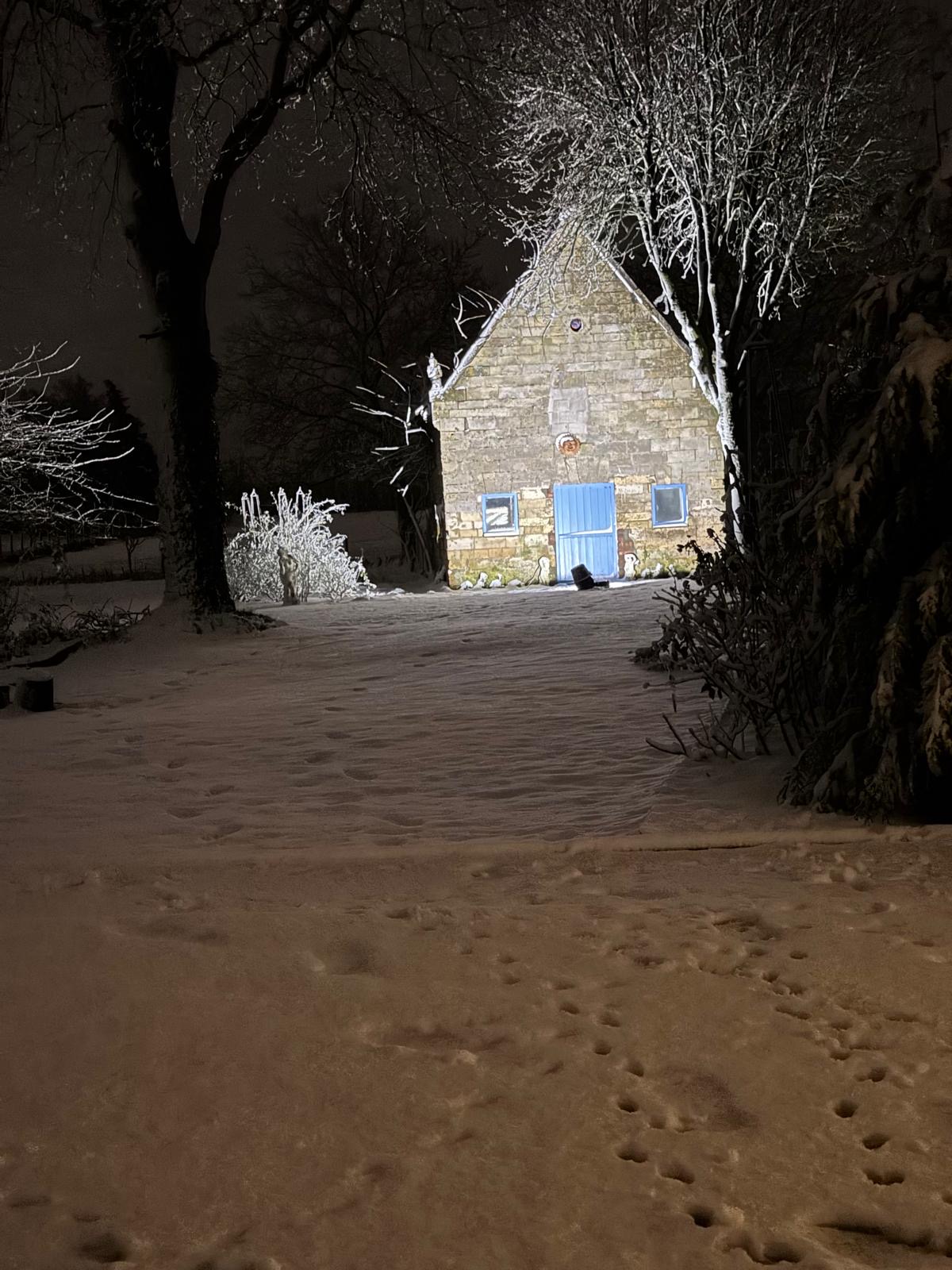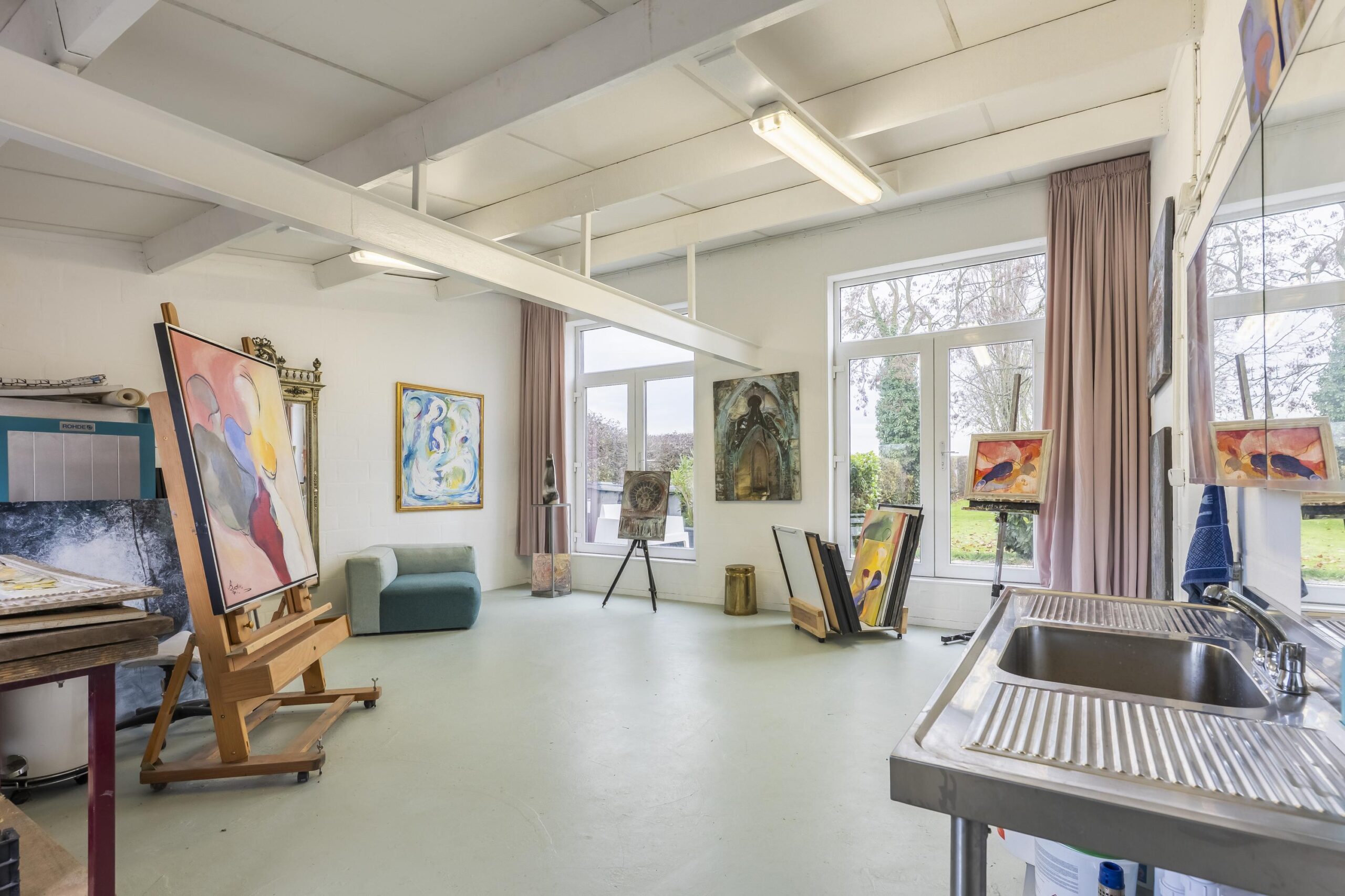 Het atelier, bereikbaar via een eigen toegangsweg met parkeerruimte, biedt hoge ramen met weidse uitzichten over tuin en landschap. Een inspirerende ruimte voor kunst, schrijven, ontwerp, coaching of praktijkvoering, volledig voorzien van aansluitingen.