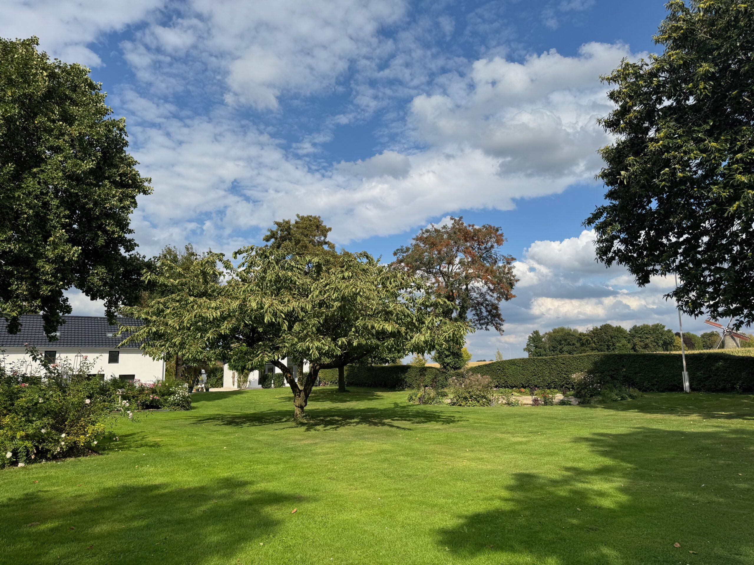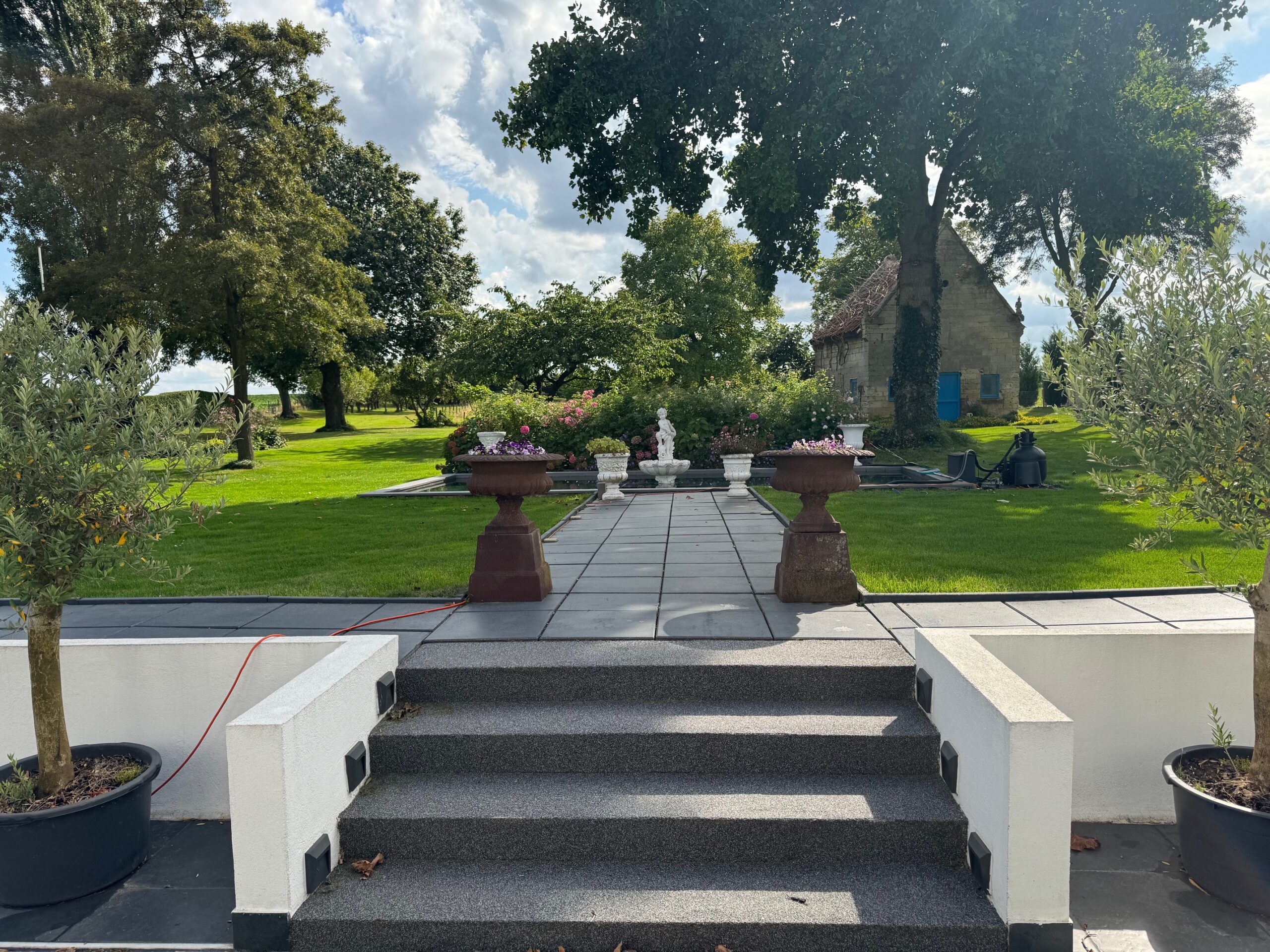 Het domein is volledig omheind en biedt daardoor een gevoel van beslotenheid dat normaal alleen bij grote internationale estates wordt gevonden. Aan één zijde waarborgt een hoge elegante rij groenblijvende coniferen volledige privacy, terwijl de overige zijden openen naar het omliggende landschap. Een lage, golvend gesnoeide heg, die het natuurlijke reliëf volgt, accentueert het vrije, verre uitzicht. Het resultaat is een subtiel samenspel van privacy en openheid – een zeldzame kwaliteit in Nederland.