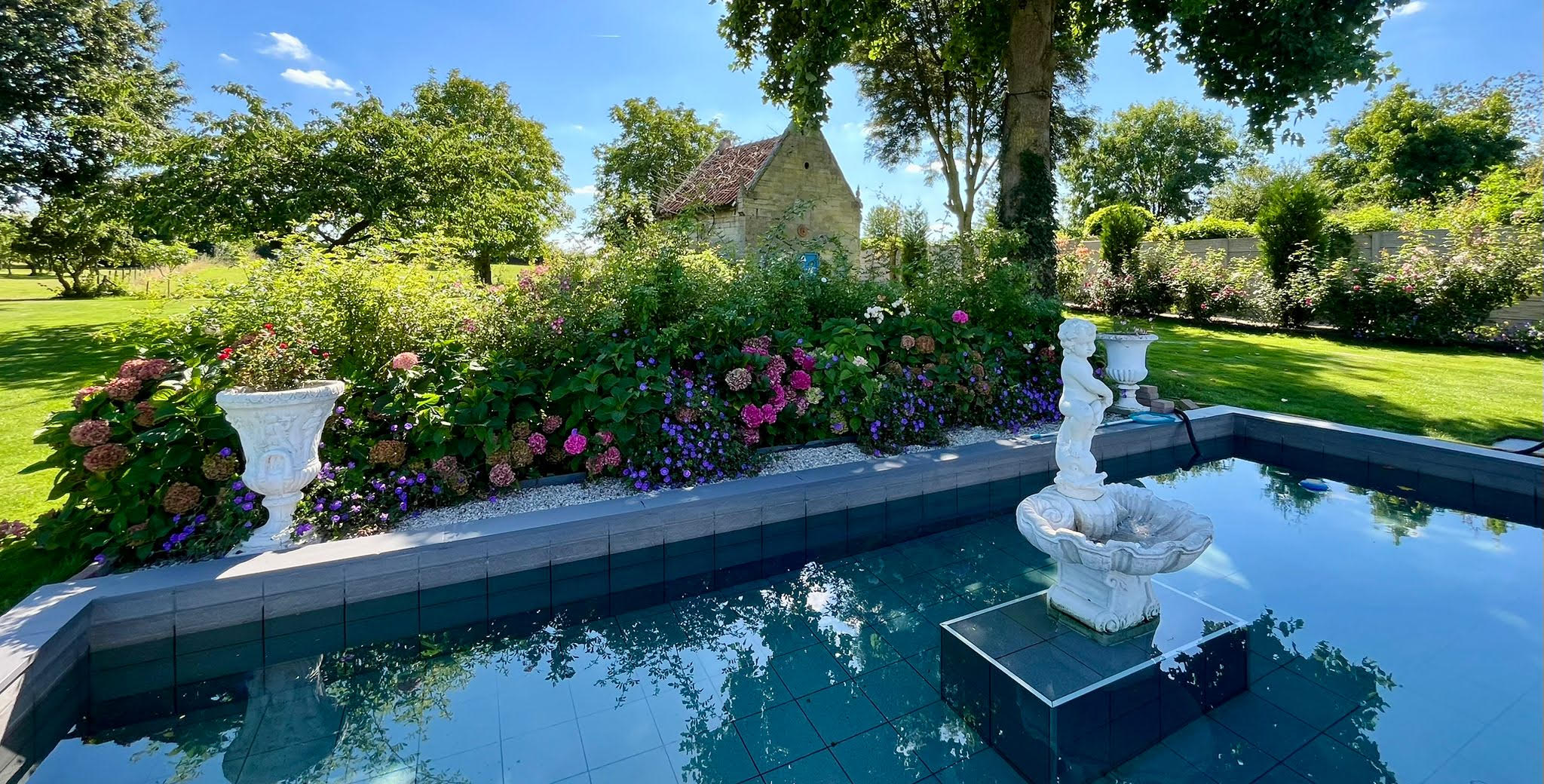 De parkachtige tuin is onder architectuur aangelegd en combineert rust en minimale onderhoudsbehoefte met verfijnde esthetiek.