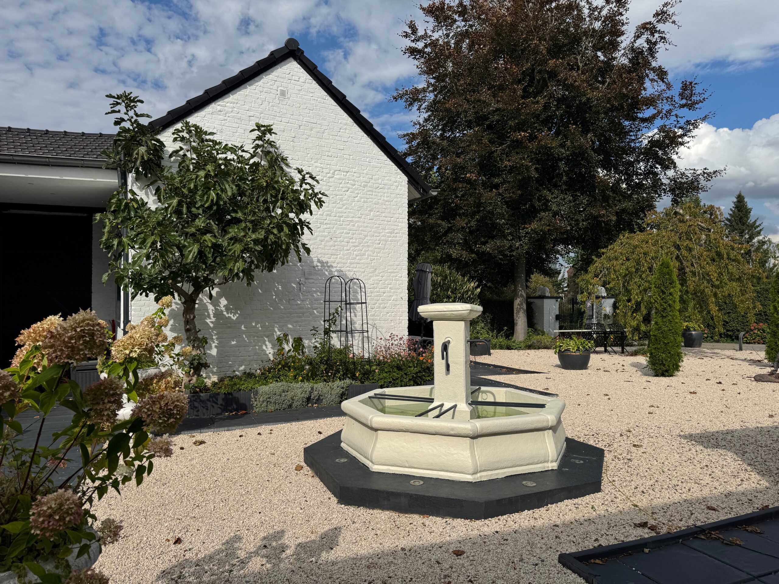 Hoge historische toegangspoorten leiden naar een indrukwekkende cour, volledig betegeld in één verfijnde materiaalcompositie. Châteaugrind, een grote Franse fontein en zichtlijnen naar de Van Tienhovenmolen (als enige in Nederland opgetrokken uit mergelsteen) geven de ruimte een stille grandeur. De cour vormt het serene middelpunt van het landgoed: een besloten plek waar licht, symmetrie en stilte samenkomen.
