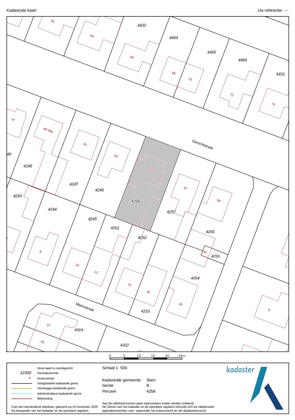 De woning is gelegen in de Gerichtstraat in de wijk Kerensheide, een mooie locatie nabij natuurgebied “de Lendjwaer” en nabij het “Steinerbos”. Stein is een gemeente met een hoog voorzieningsniveau met o.a. scholen, winkels, speeltuin, zwembad, openbaar vervoer en een rijk verenigingsleven. De locatie is gunstig gelegen ten opzicht van uitvalswegen richting de autosnelweg A2 (richting Eindhoven) en A79 (richting Heerlen en Aken) en België.