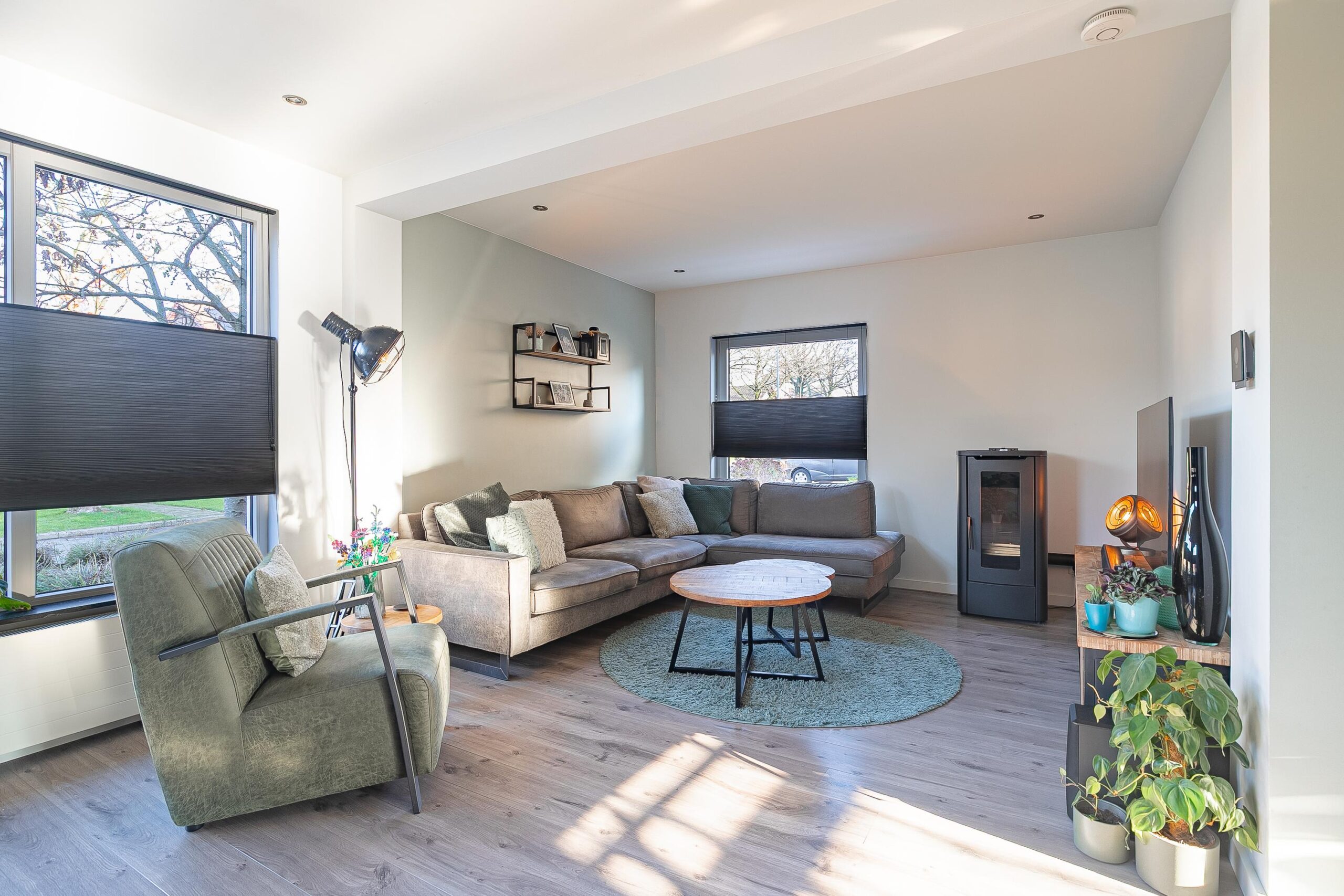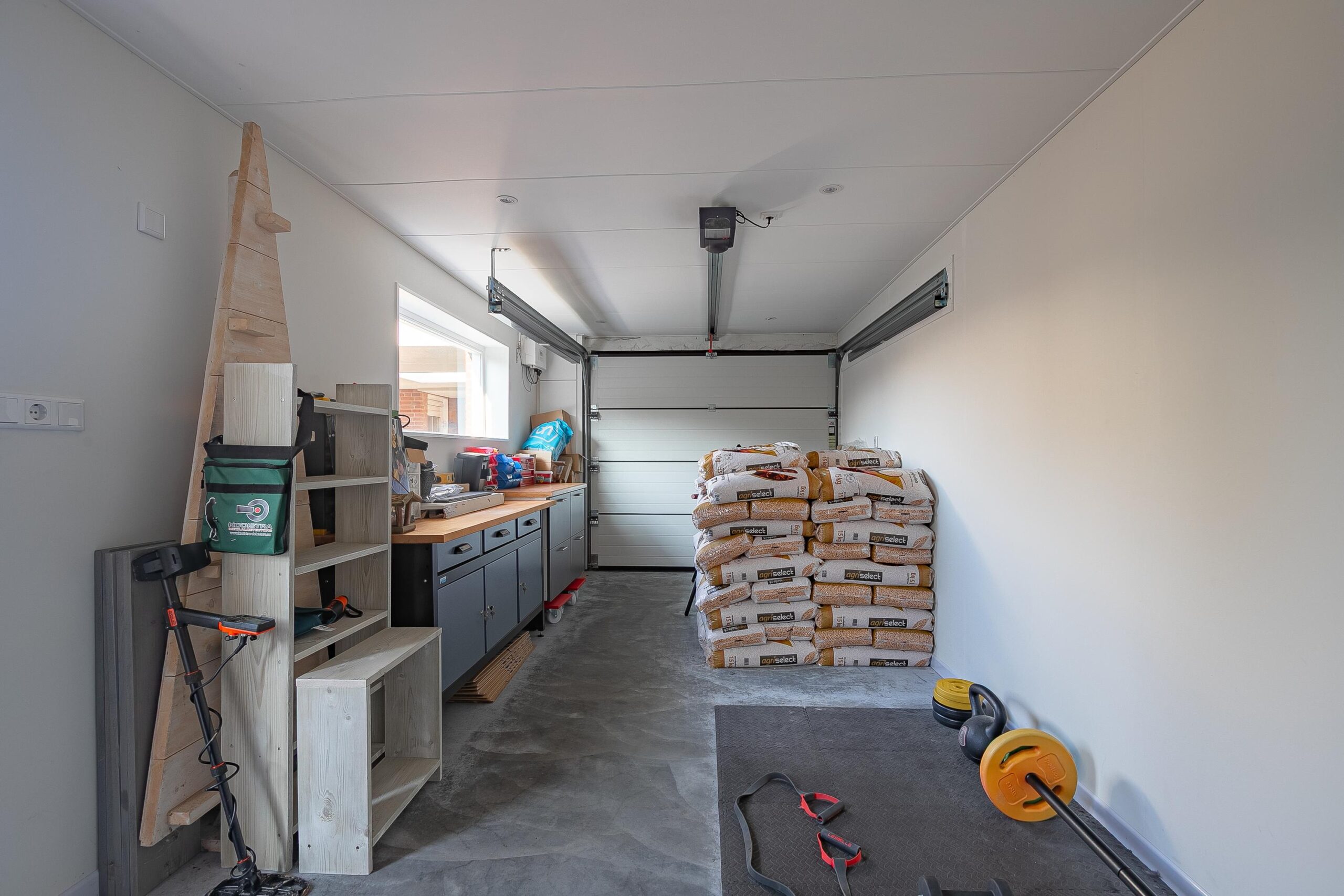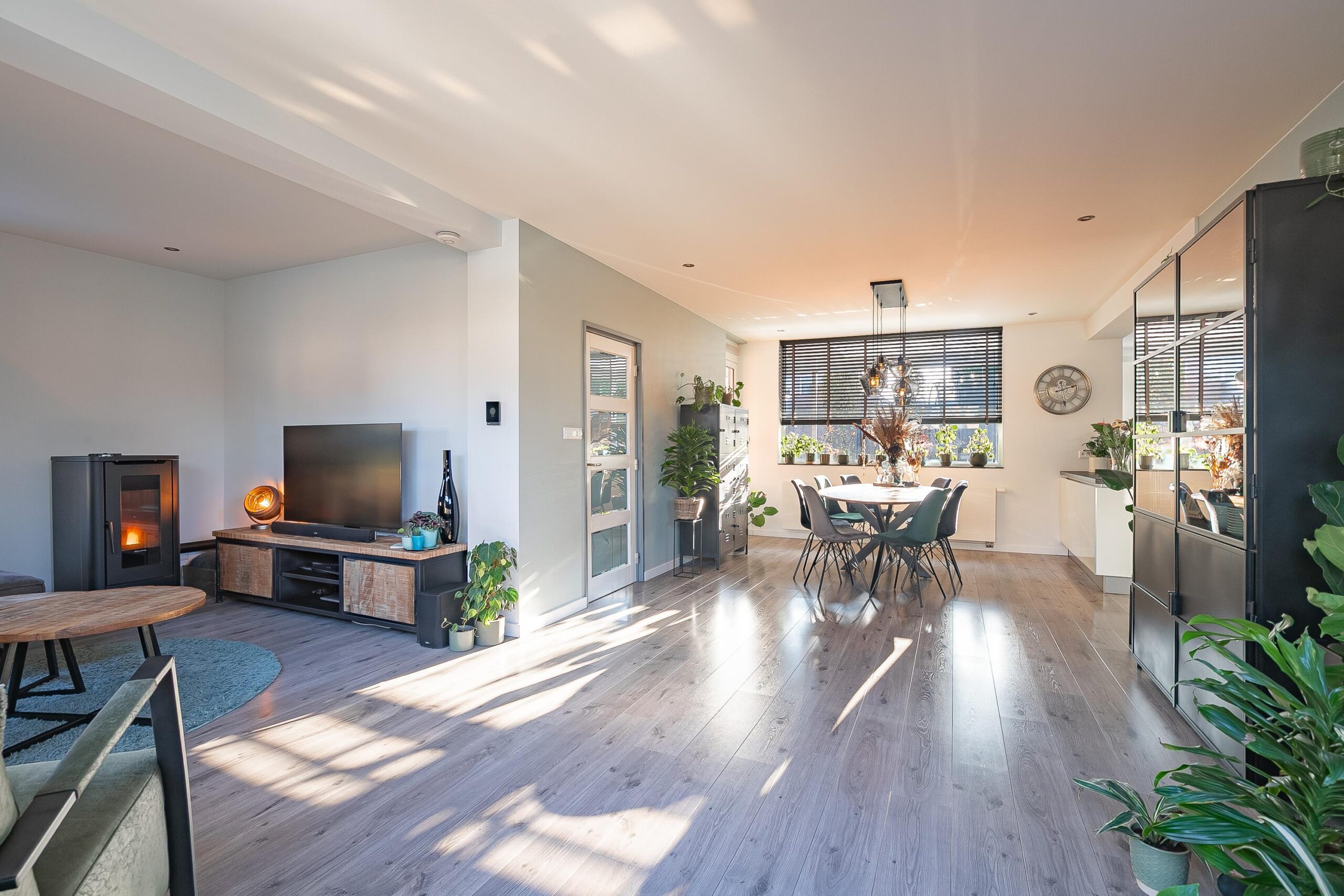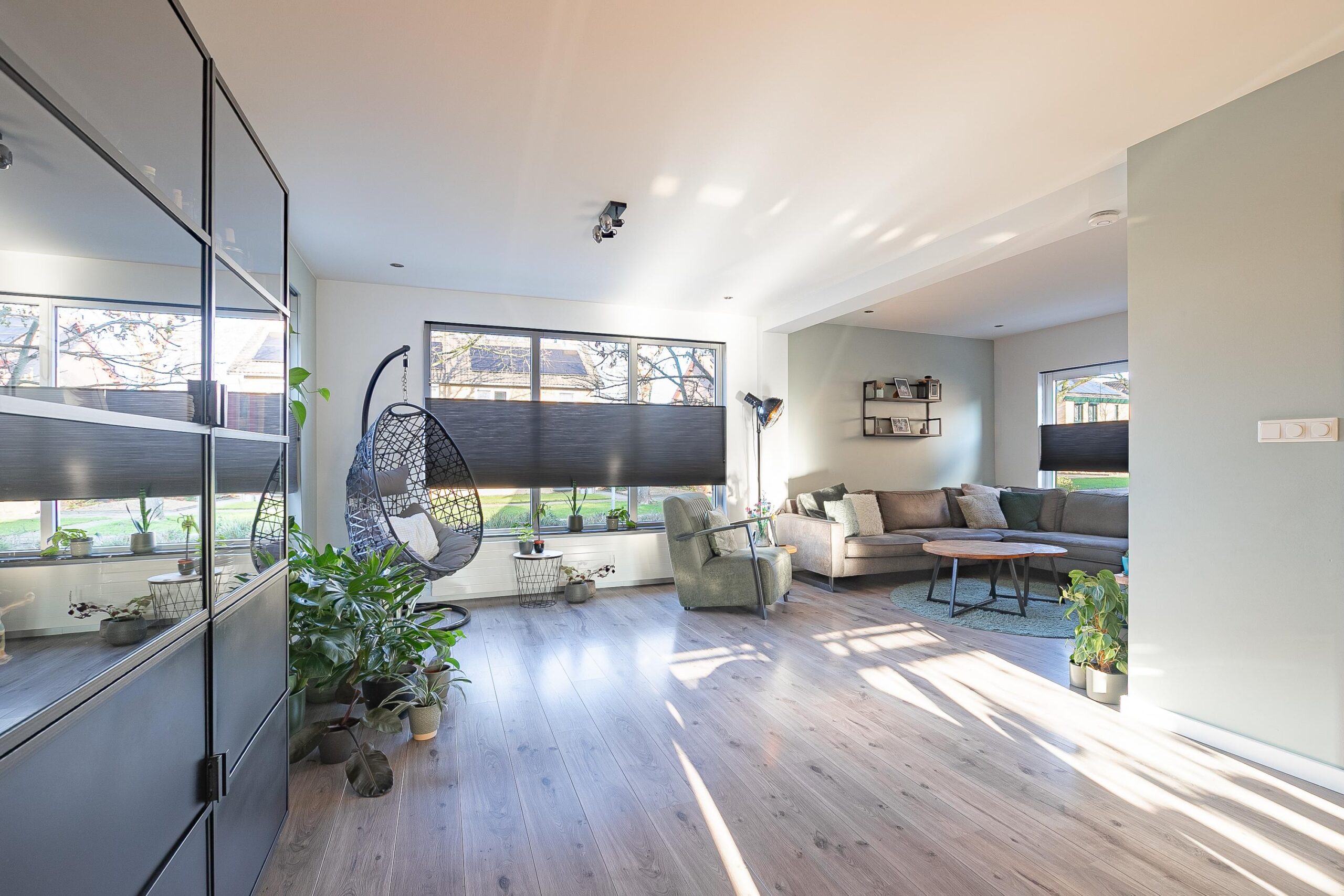 Hal met meterkast (vernieuwde meterkast met 14 groepen en 4 aardlekschakelaars), garderobekast en modern toilet met wandcloset en fonteintje. L-vormige woonkamer (ca. 43.8m²) met veel lichtinval, laminaatvloer en Pelletkachel (ter overname). In de aanbouw gerealiseerde keuken (ca. 12.6 m²) met moderne aanrechtcombinatie incl. schiereiland voorzien van de volgende apparatuur: inductiekookplaten, combimagnetron, oven, koelkast, vaatwasser, spoelbak, afzuigkap en massief granieten aanrechtblad. Bijkeuken (ca. 6.2m²) met witgoedaansluitingen. Aan de achterzijde van de woning is een ruim overdekt terras (ca. 32.3m²). Mooi afgewerkte garage (ca. 17.5m²) met elektrische sectionaalpoort, een nette betonvloer en strak gestucte, geïsoleerde wanden en plafond. De garage is momenteel in gebruik als fitnessruimte. Aan de linkerzijde van de woning is een ruime oprit die geschikt is voor het parkeren van meerdere auto’s. Aan de rechterzijde van de woning is een tweede oprit. De opritten bieden dus ruimte voor plek vier auto’s. Achter de garage is een berging (ca. 15m²) o.a. in gebruik als fietsenberging. De op het zuidwesten georiënteerde achtertuin is ongeveer 25 meter diep, geheel omsloten en biedt ruim voldoende privacy.