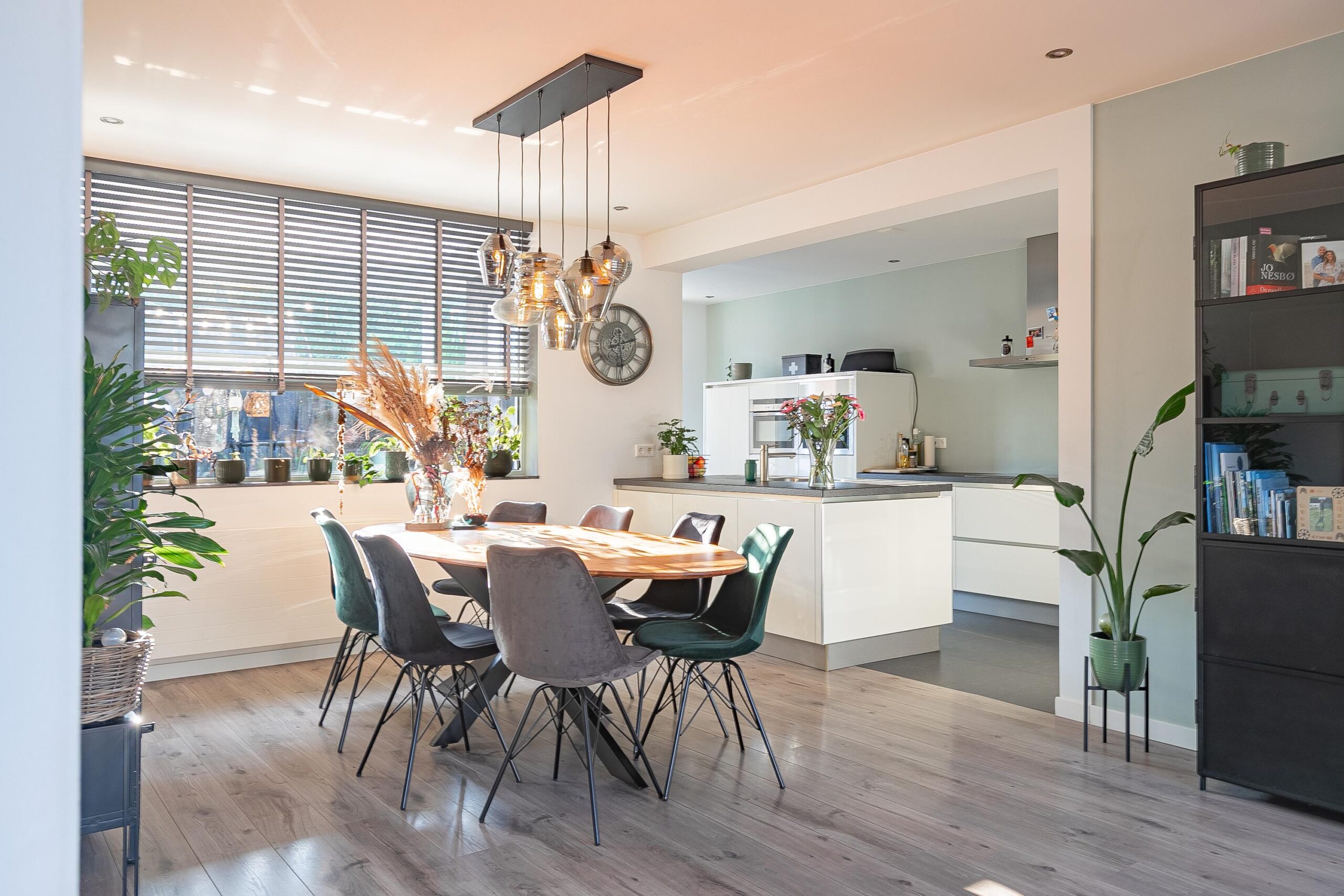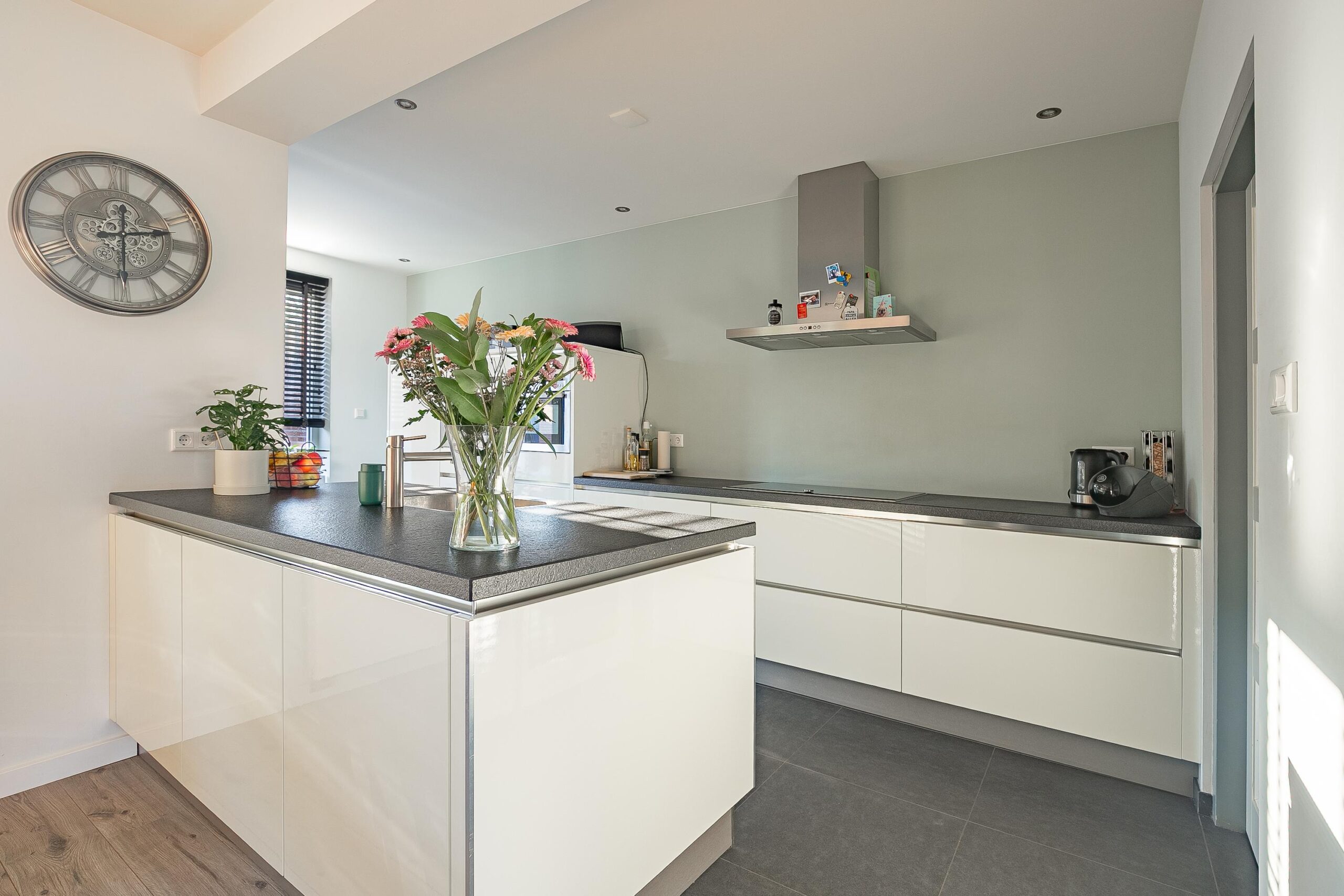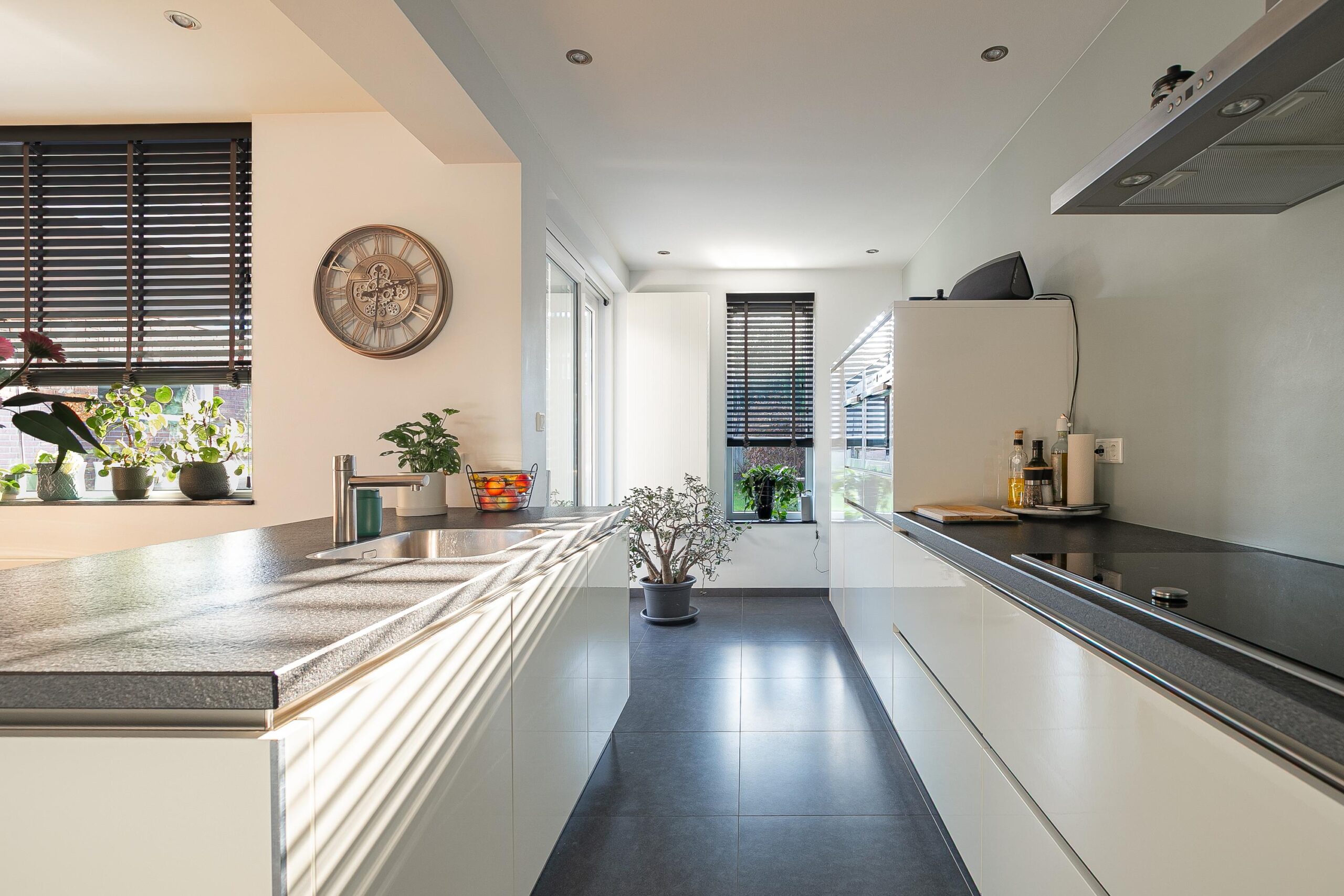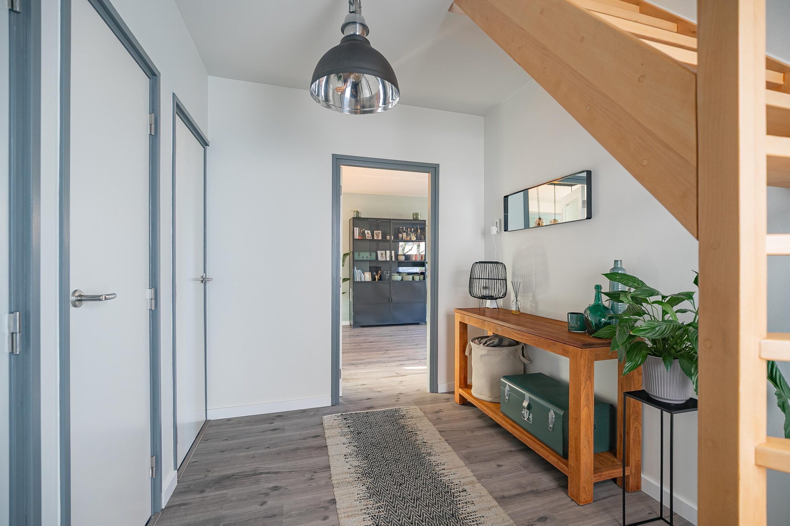 Hal met meterkast (vernieuwde meterkast met 14 groepen en 4 aardlekschakelaars), garderobekast en modern toilet met wandcloset en fonteintje. L-vormige woonkamer (ca. 43.8m²) met veel lichtinval, laminaatvloer en Pelletkachel (ter overname). In de aanbouw gerealiseerde keuken (ca. 12.6 m²) met moderne aanrechtcombinatie incl. schiereiland voorzien van de volgende apparatuur: inductiekookplaten, combimagnetron, oven, koelkast, vaatwasser, spoelbak, afzuigkap en massief granieten aanrechtblad. Bijkeuken (ca. 6.2m²) met witgoedaansluitingen. Aan de achterzijde van de woning is een ruim overdekt terras (ca. 32.3m²). Mooi afgewerkte garage (ca. 17.5m²) met elektrische sectionaalpoort, een nette betonvloer en strak gestucte, geïsoleerde wanden en plafond. De garage is momenteel in gebruik als fitnessruimte. Aan de linkerzijde van de woning is een ruime oprit die geschikt is voor het parkeren van meerdere auto’s. Aan de rechterzijde van de woning is een tweede oprit. De opritten bieden dus ruimte voor plek vier auto’s. Achter de garage is een berging (ca. 15m²) o.a. in gebruik als fietsenberging. De op het zuidwesten georiënteerde achtertuin is ongeveer 25 meter diep, geheel omsloten en biedt ruim voldoende privacy.