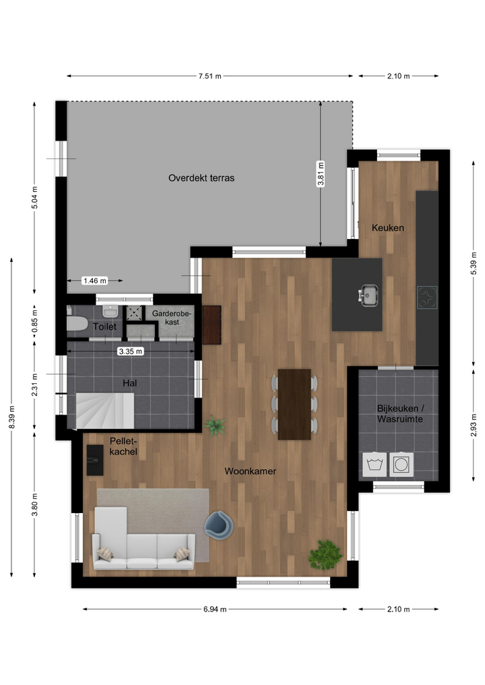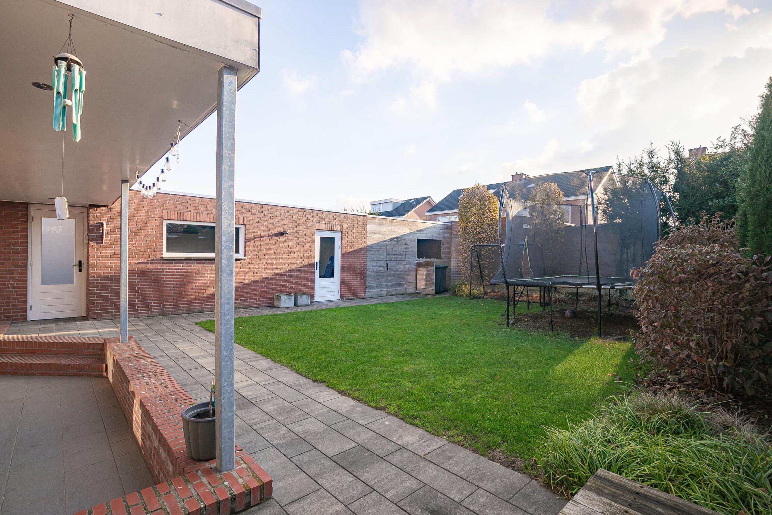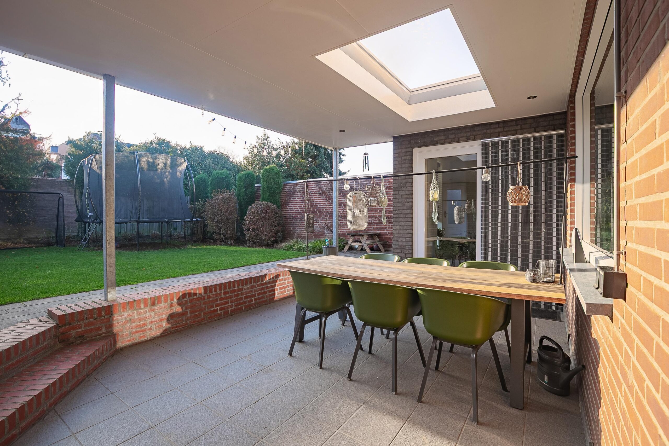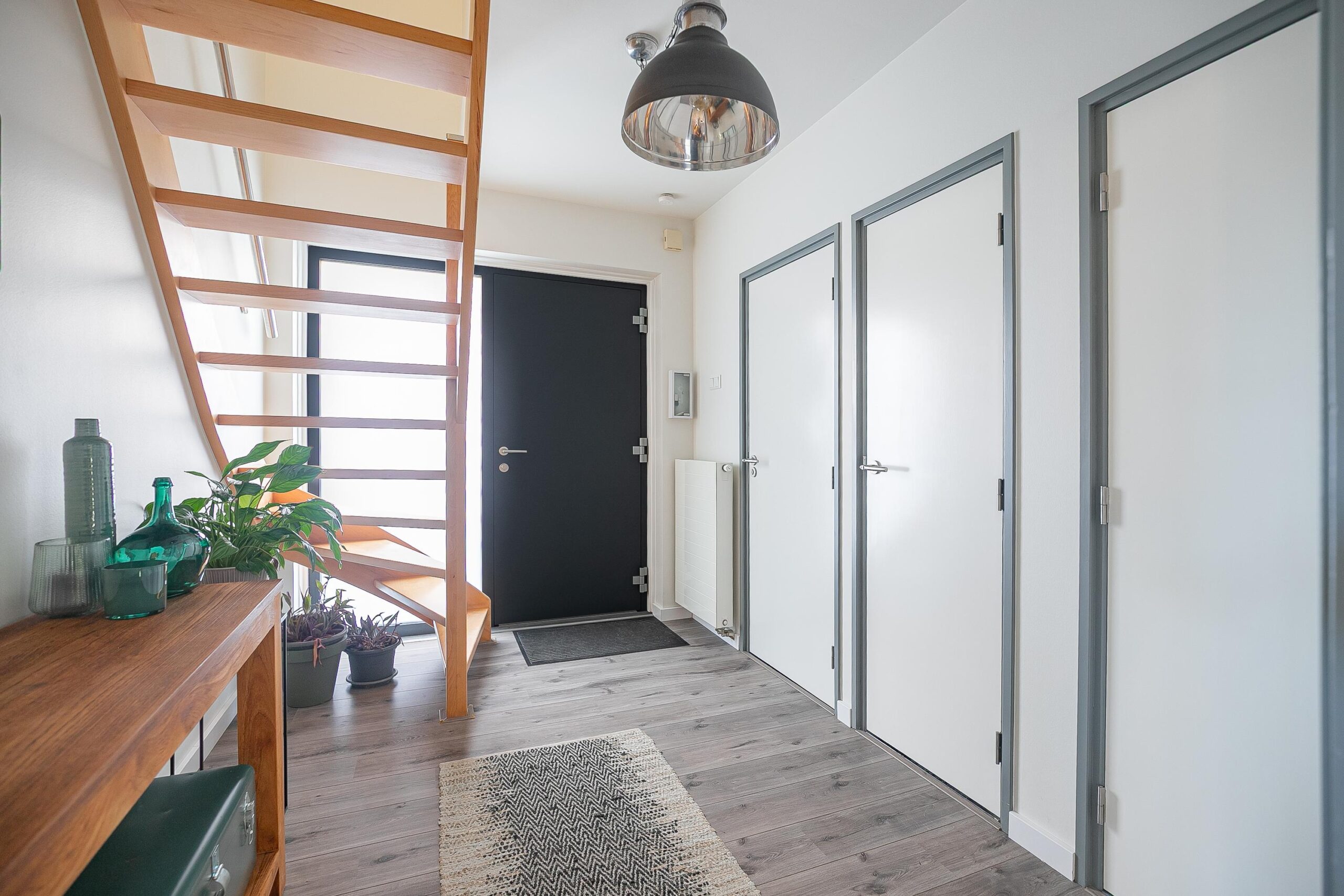 Hal met meterkast (vernieuwde meterkast met 14 groepen en 4 aardlekschakelaars), garderobekast en modern toilet met wandcloset en fonteintje. L-vormige woonkamer (ca. 43.8m²) met veel lichtinval, laminaatvloer en Pelletkachel (ter overname). In de aanbouw gerealiseerde keuken (ca. 12.6 m²) met moderne aanrechtcombinatie incl. schiereiland voorzien van de volgende apparatuur: inductiekookplaten, combimagnetron, oven, koelkast, vaatwasser, spoelbak, afzuigkap en massief granieten aanrechtblad. Bijkeuken (ca. 6.2m²) met witgoedaansluitingen. Aan de achterzijde van de woning is een ruim overdekt terras (ca. 32.3m²). Mooi afgewerkte garage (ca. 17.5m²) met elektrische sectionaalpoort, een nette betonvloer en strak gestucte, geïsoleerde wanden en plafond. De garage is momenteel in gebruik als fitnessruimte. Aan de linkerzijde van de woning is een ruime oprit die geschikt is voor het parkeren van meerdere auto’s. Aan de rechterzijde van de woning is een tweede oprit. De opritten bieden dus ruimte voor plek vier auto’s. Achter de garage is een berging (ca. 15m²) o.a. in gebruik als fietsenberging. De op het zuidwesten georiënteerde achtertuin is ongeveer 25 meter diep, geheel omsloten en biedt ruim voldoende privacy.