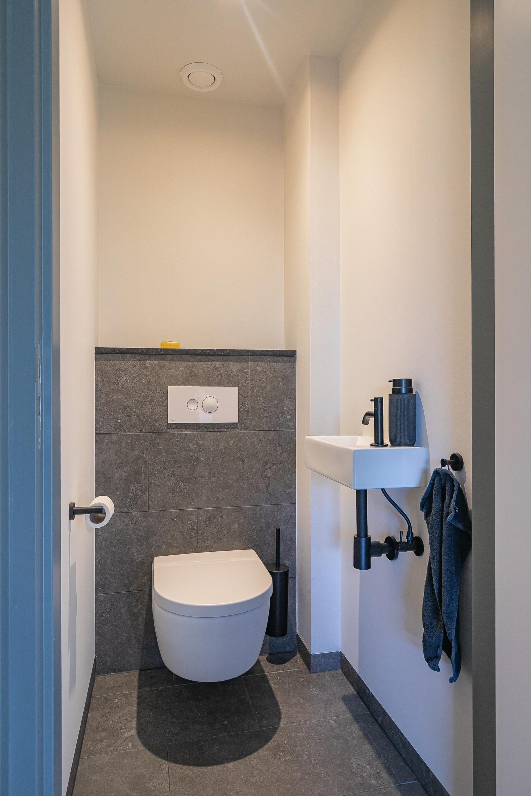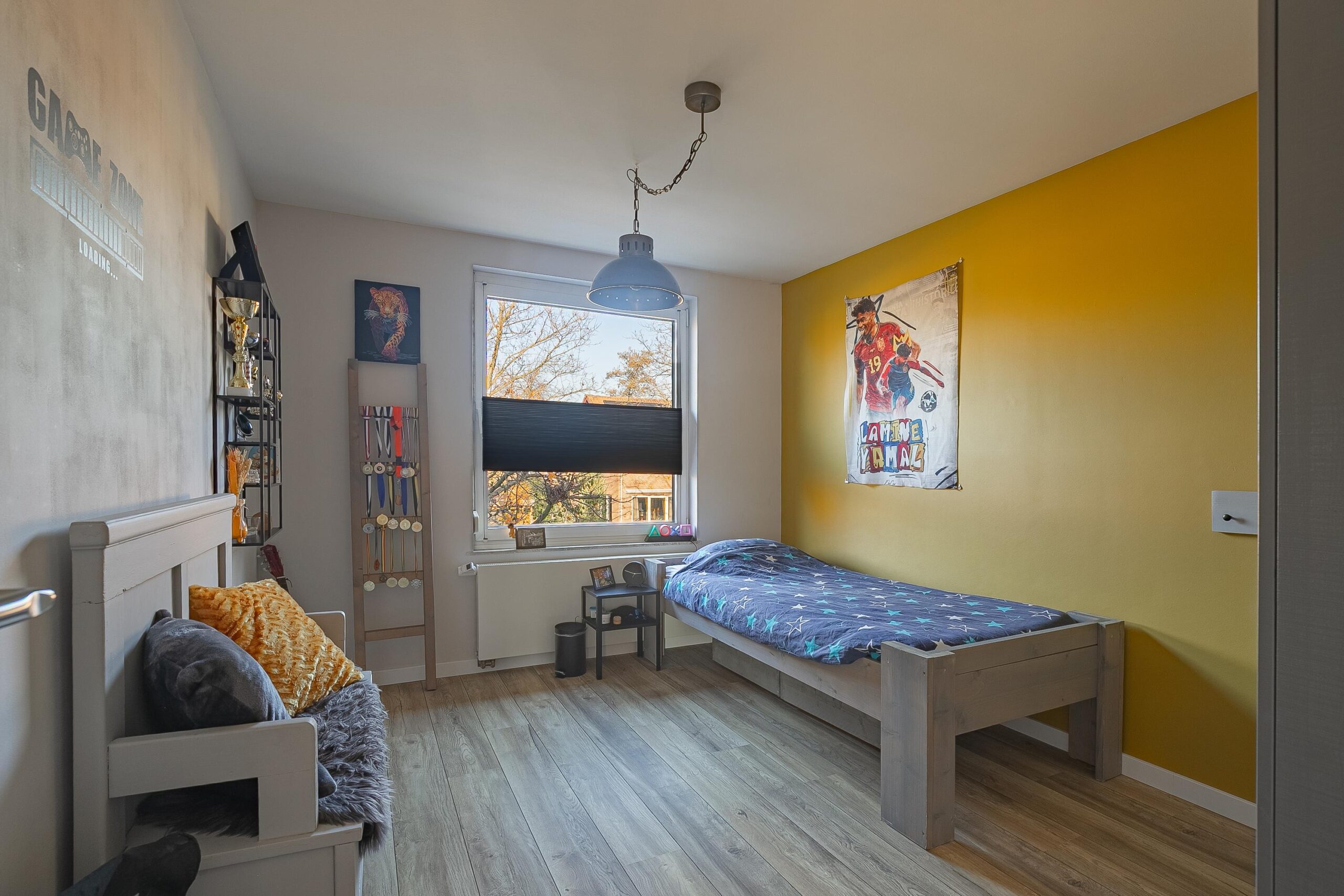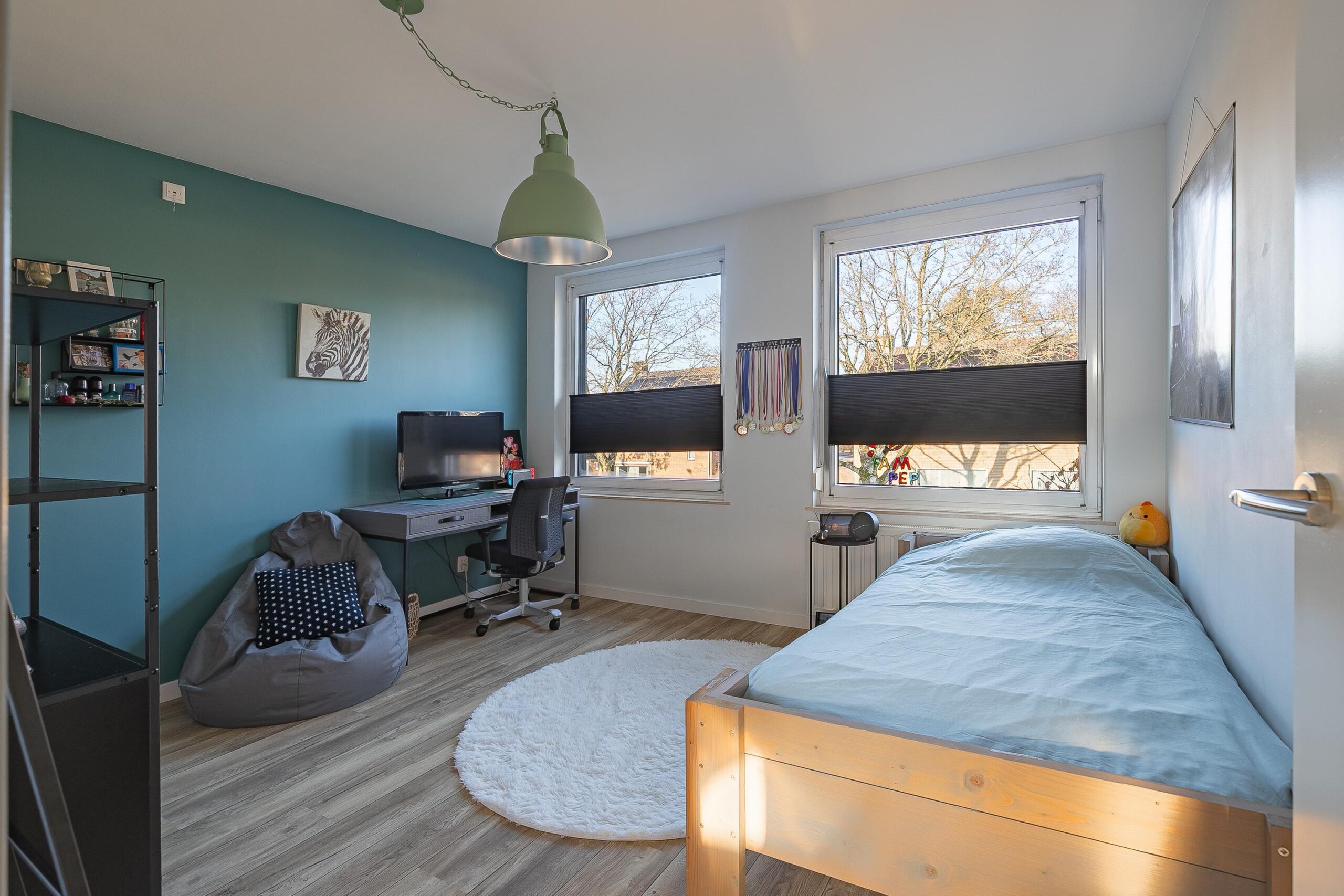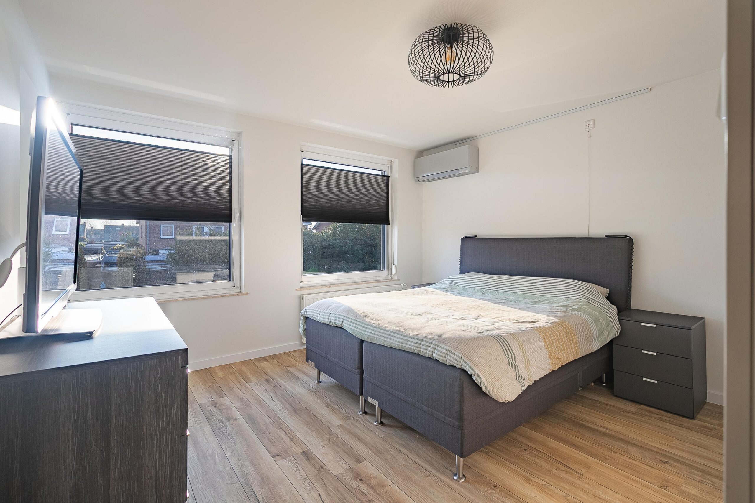 Ruime overloop met modern (separaat) toilet met wandcloset en wastafeltje. Drie ruime slaapkamers (resp. ca. 15.1m², 12.5m² en 11.4m²), allen voorzien van laminaatvloeren. De ouderslaapkamer is voorzien van een airco, afgewerkt met een moderne, op maat gemaakte kastenwand en heeft een eigen (en-suite) badkamer (ca. 5.4m²) met inloopdouche en badmeubel met wastafel. Ten behoeve van de twee overige slaapkamers is op deze verdieping een tweede badkamer (ca. 3.7m²) met inloopdouche en badmeubel met wastafel. Beide badkamers en het toilet op de eerste verdieping zijn voorzien van aangename vloerverwarming. Op de tweede slaapkamer is een bergkast (onder de trap naar zolder).