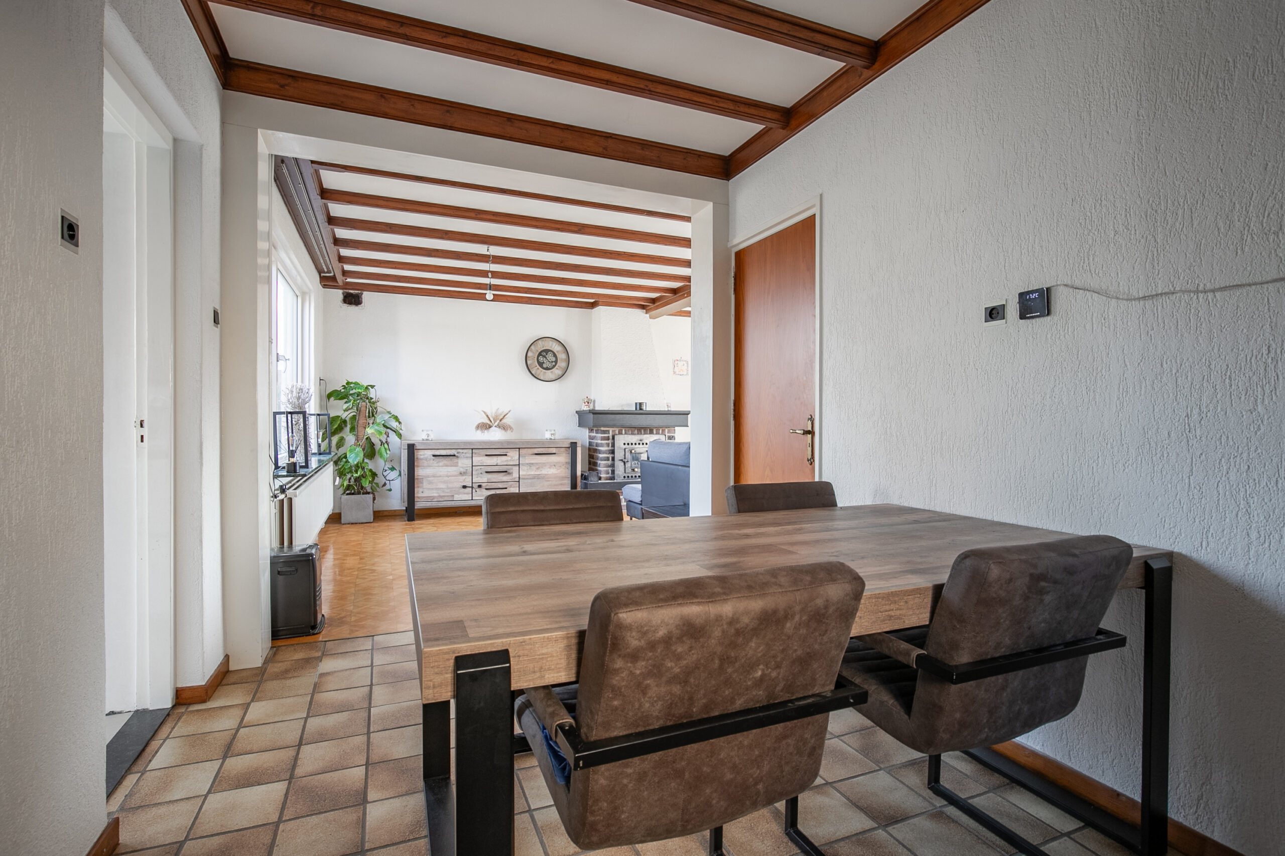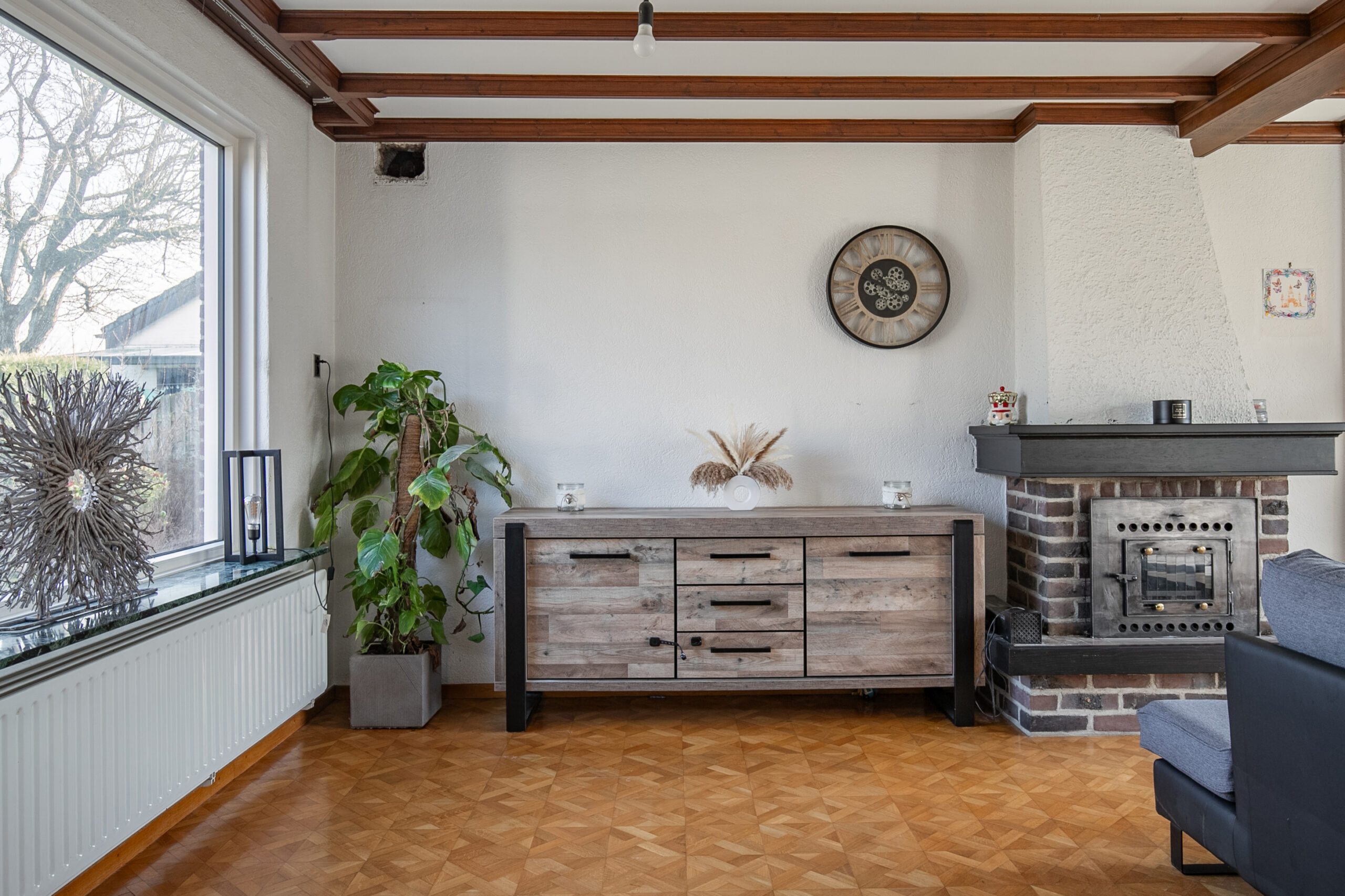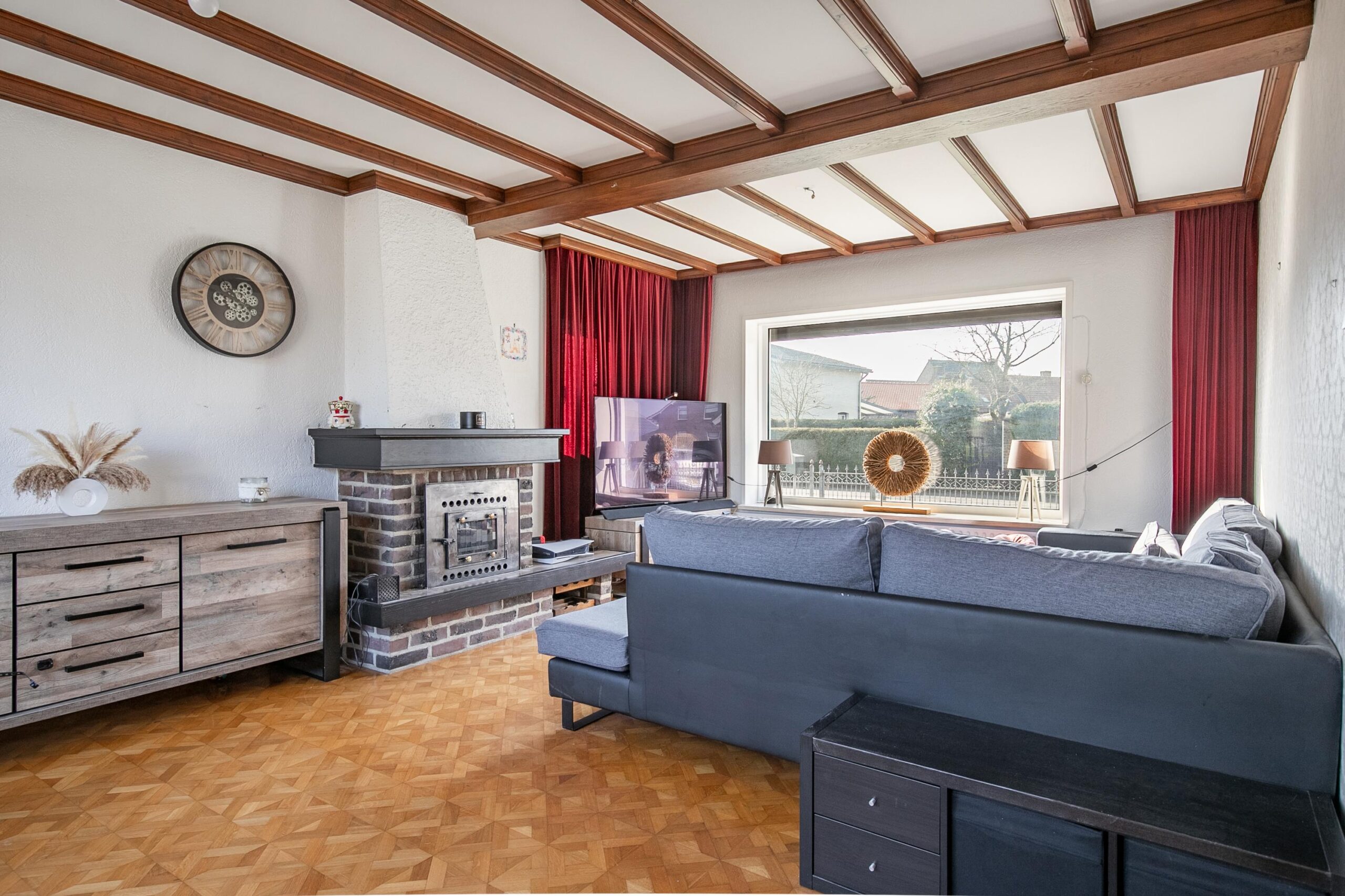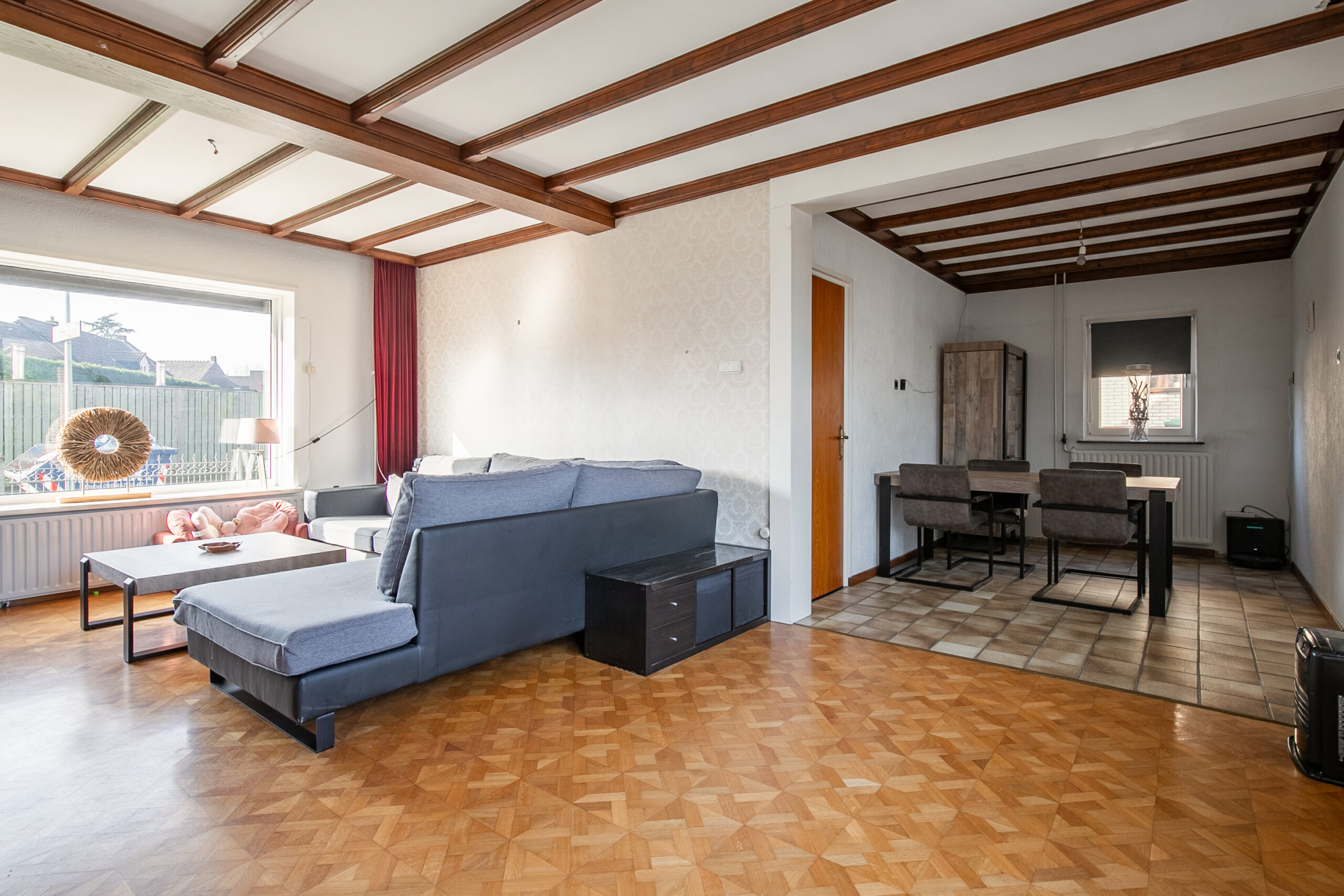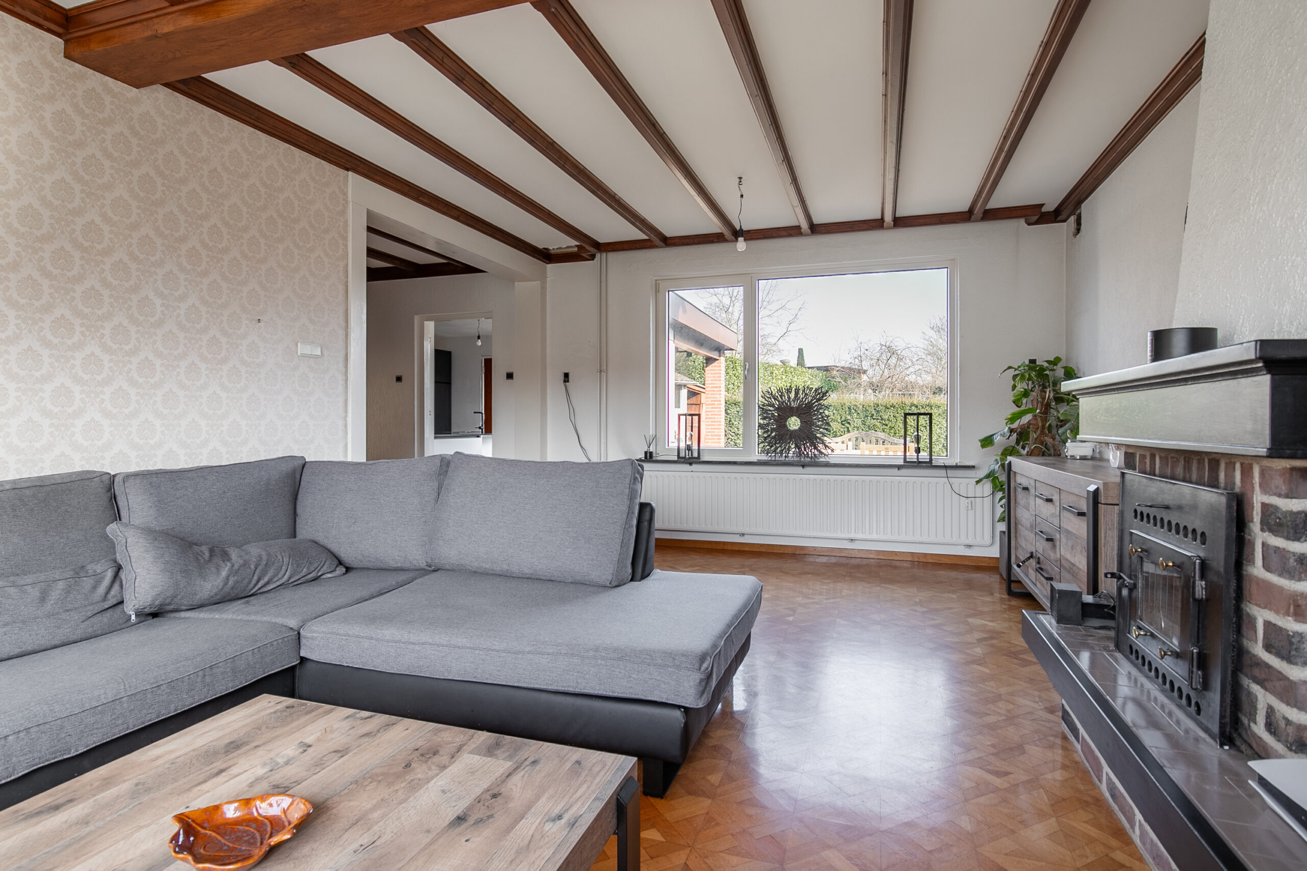 De woonkamer is nog niet aangepakt en heeft een meer gedateerde uitstraling. Hier vind je de originele tegelvloer en parketvloer, evenals de bestaande haard (niet functionerend). Dankzij de grote raampartijen is de ruimte heerlijk licht en vormt deze een prachtige basis om geheel naar eigen smaak te moderniseren.