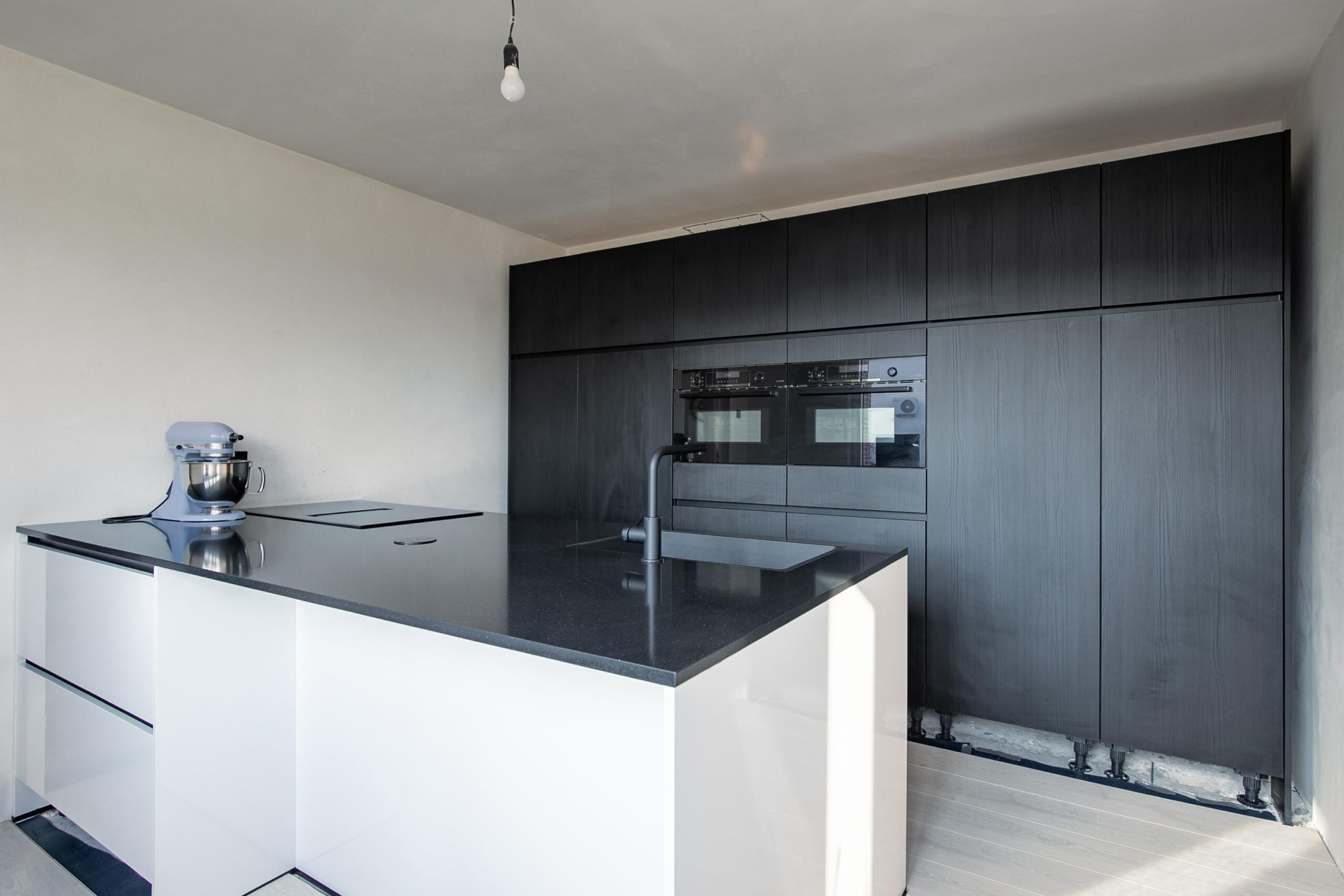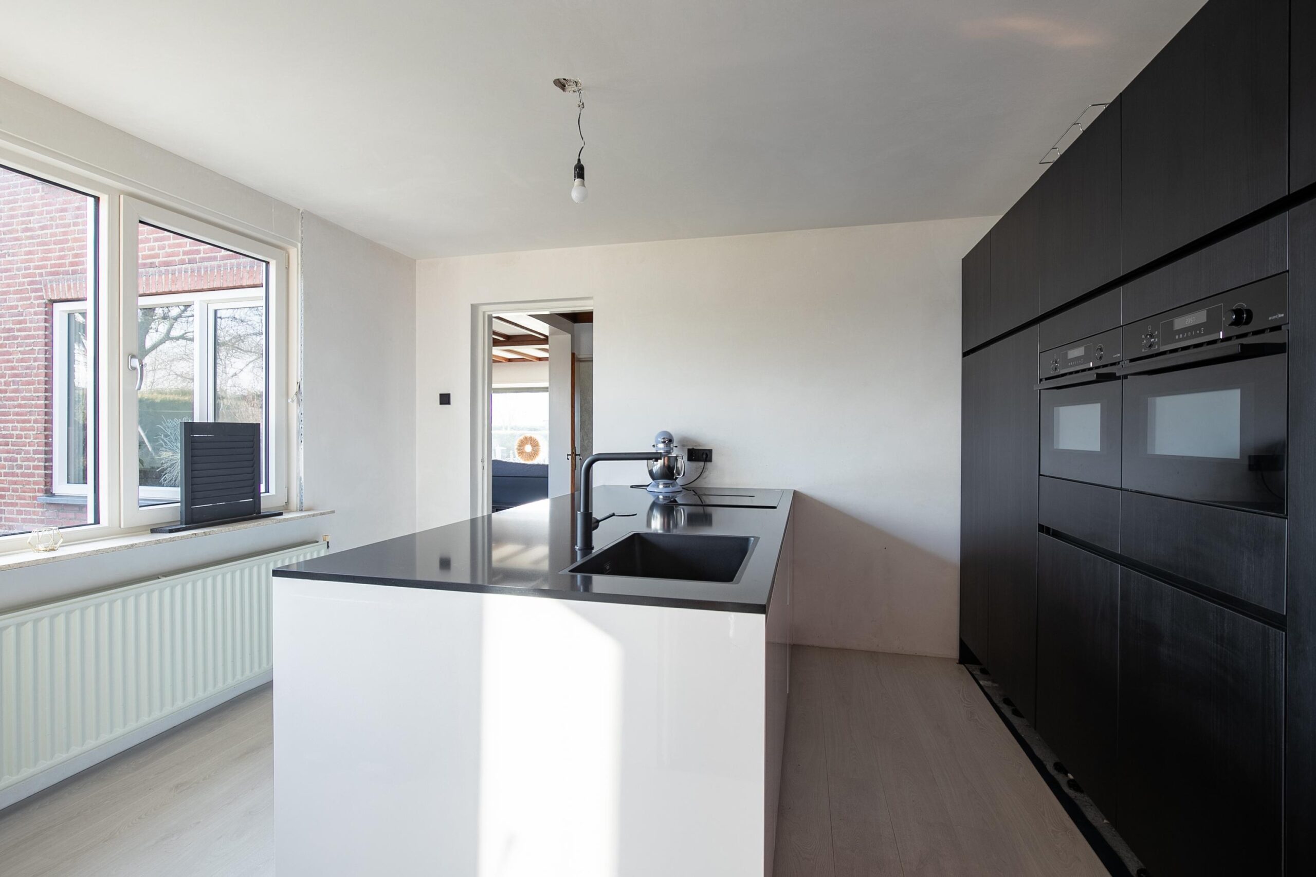 Vanuit de woonkamer loop je direct door naar de volledig gemoderniseerde keuken; dé eyecatcher van het huis. Het schiereiland met grote kastenwand geeft de ruimte een luxe en eigentijdse uitstraling. De keuken is voorzien van alle moderne gemakken, waaronder twee ovens, een grote spoelbak met designkraan, een inductiekookplaat met geïntegreerde afzuiging, een ruime koelkast en vriezer en een vaatwasser. Op de vloer ligt een moderne laminaatvloer die het geheel strak afwerkt.