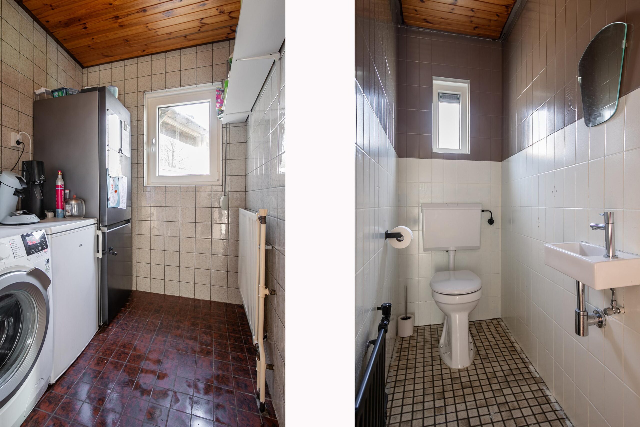 Achter de keuken bevindt zich een portaaltje met het gastentoilet (met fonteintje) en de bijkeuken met witgoedaansluitingen. Deze ruimtes zijn nog gedateerd, maar netjes onderhouden. Vanuit het portaaltje is er een overdekte toegang tot de tuin én toegang tot de inpandige, ruime garage met aansluitende berging.