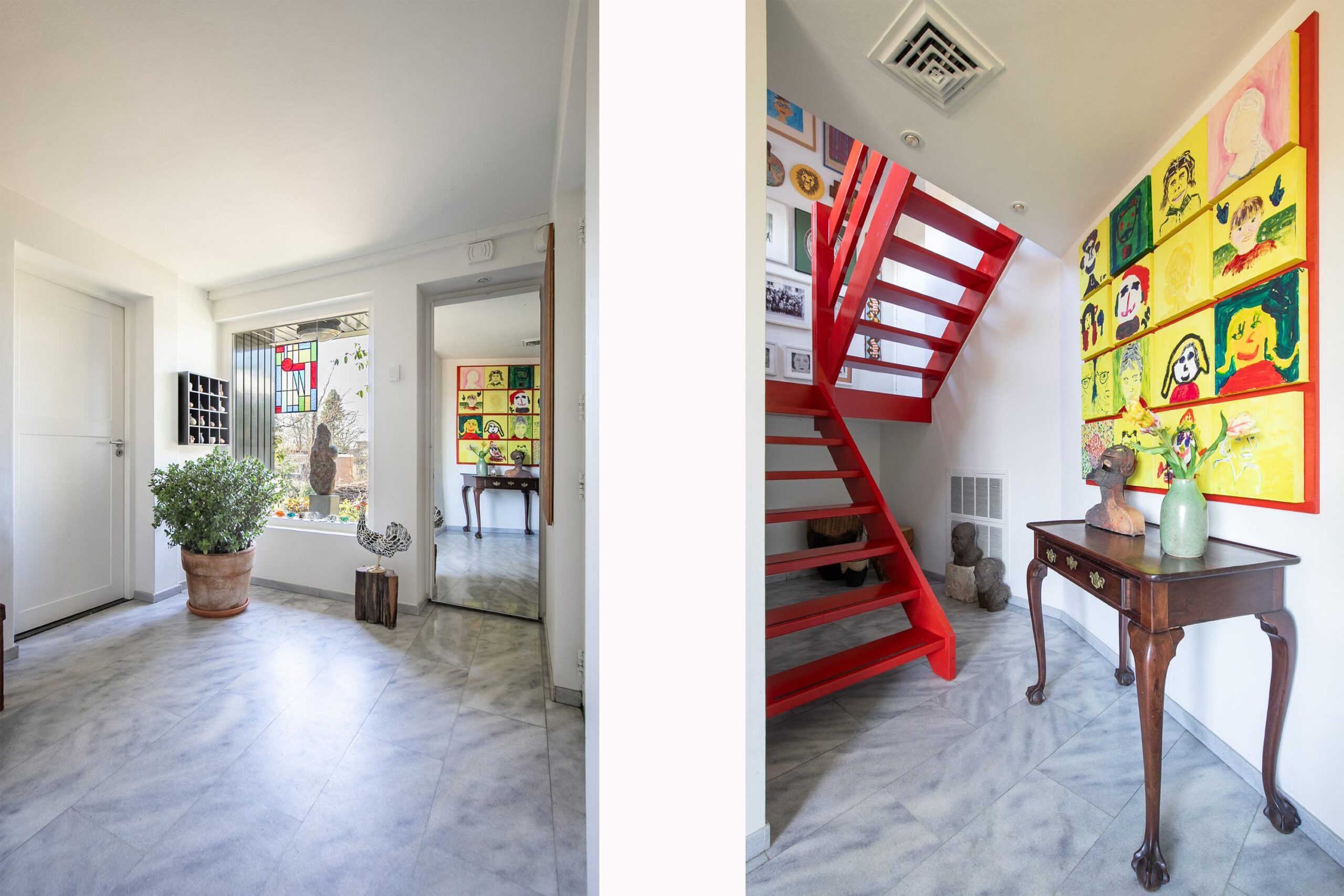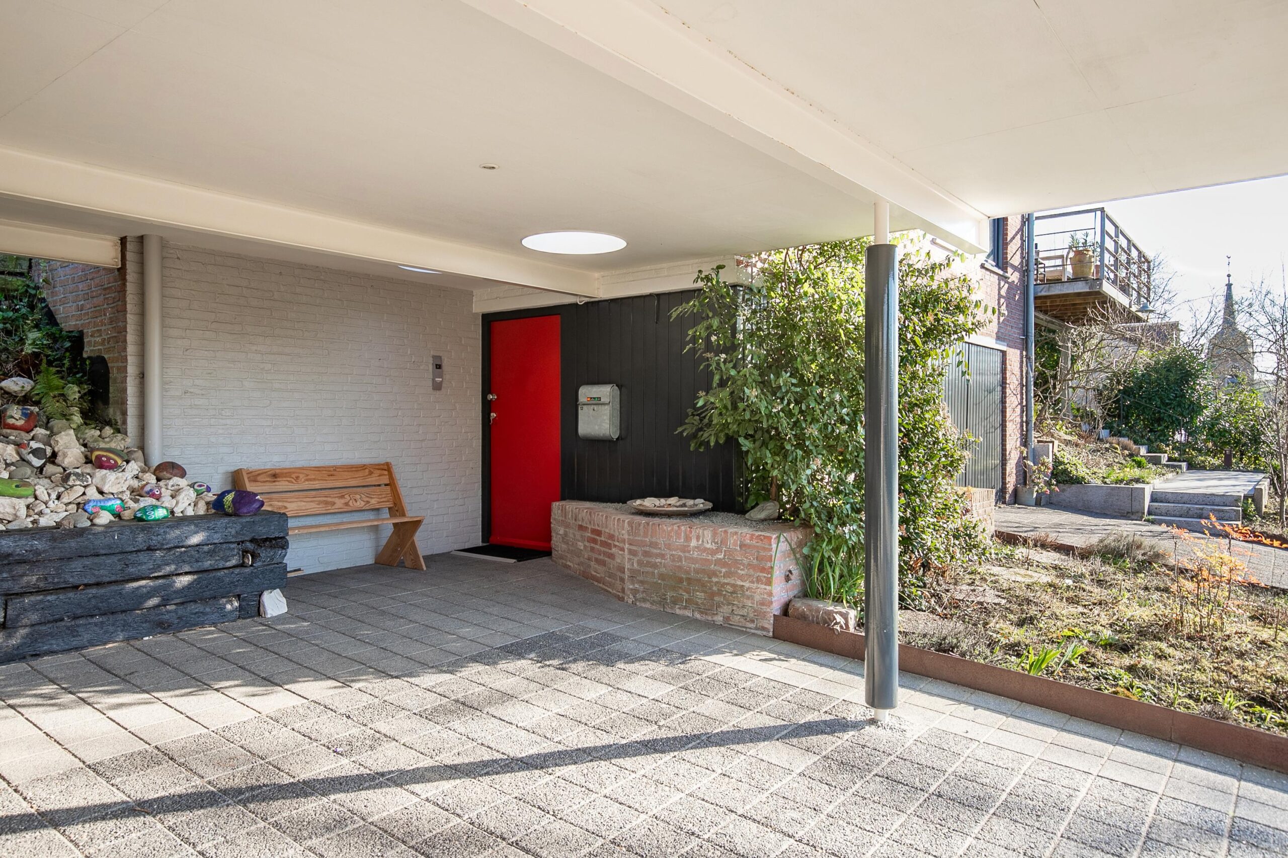 Aan de voorzijde van het woonhuis tegenover het straatje is een ruime parkeerstrook die op eigen grond is aangelegd. Aan weerszijde van de woning zijn opritten waarvan een toegang biedt tot de inpandig bereikbare garage en de ander tot een royale carport met toegang tot de entree van de woning. Een natuurstenen trap aan de zijkant gaat naar het terras op woonkamer-niveau. De ontvangsthal heeft een marmeren vloer, meterkast, garderobe en geeft toegang tot de garage met openslaande deuren en een verdeelhal naar de technische ruimte voor de HR-cv-installatie (hete lucht verwarming, 2013) en de elektrische boiler (huur).