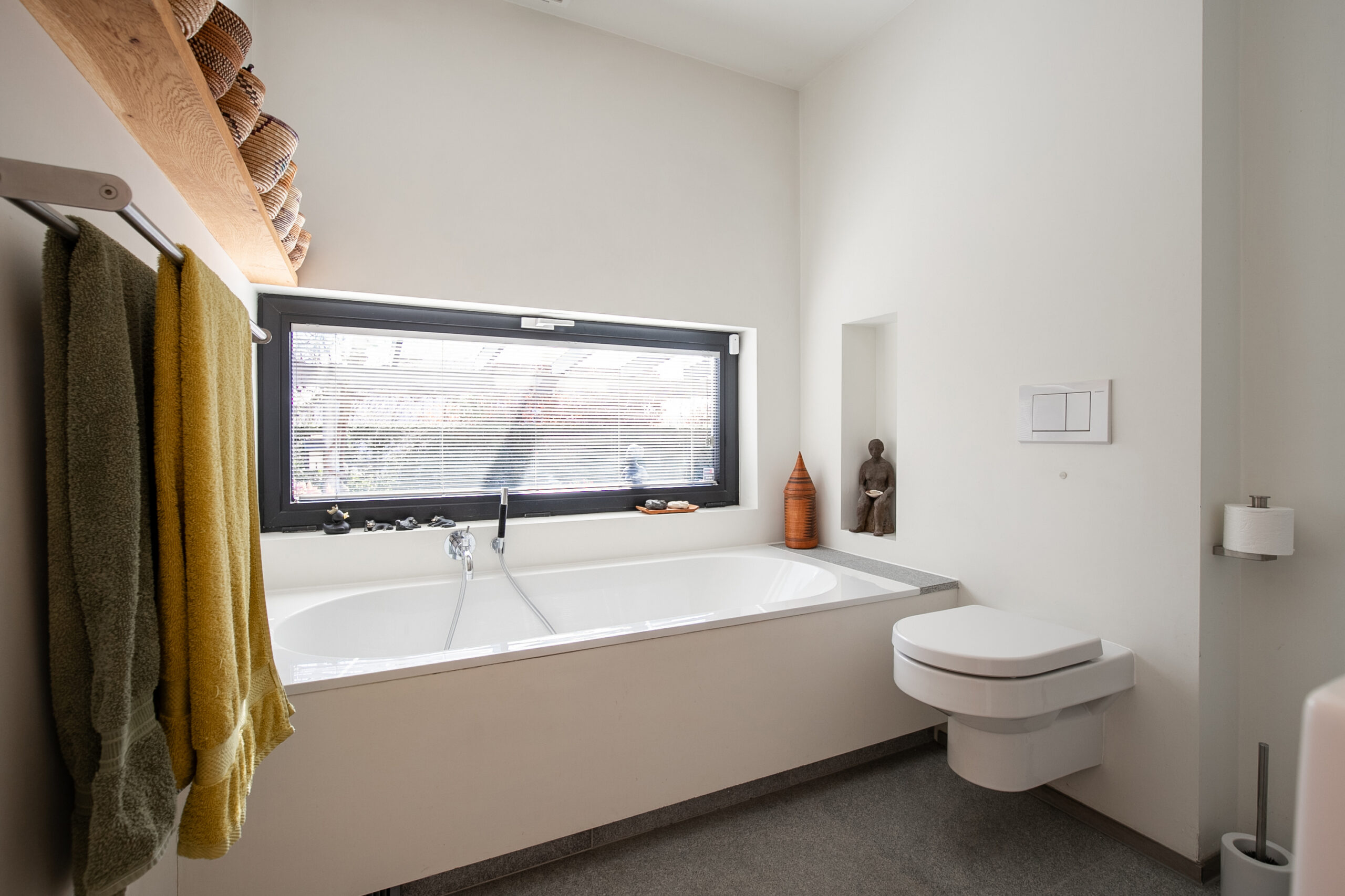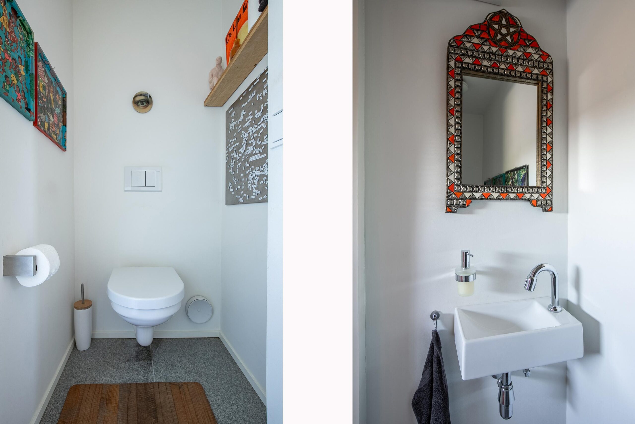 Toiletruimte met zwevend toilet en fontein.