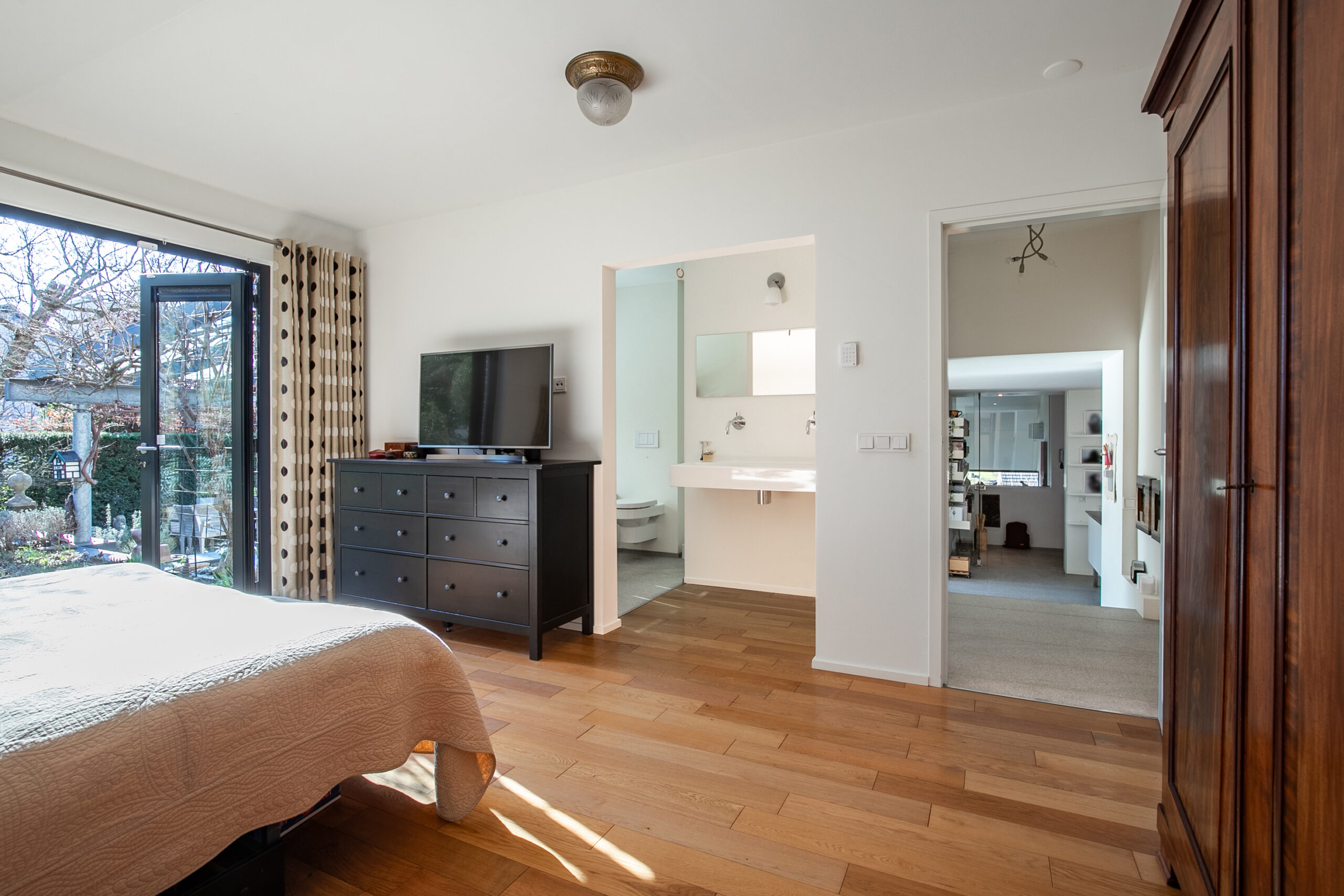 De overloop biedt ook toegang tot de ruime hoofdslaapkamer met een badkamer ensuite en een walk-in closet. De badkamer is voorzien van een inloop-douche, ligbad, tweepersoons wastafel en zwevend toilet. De slaapkamer en walk-in closet zijn voorzien van een eiken parketvloer.