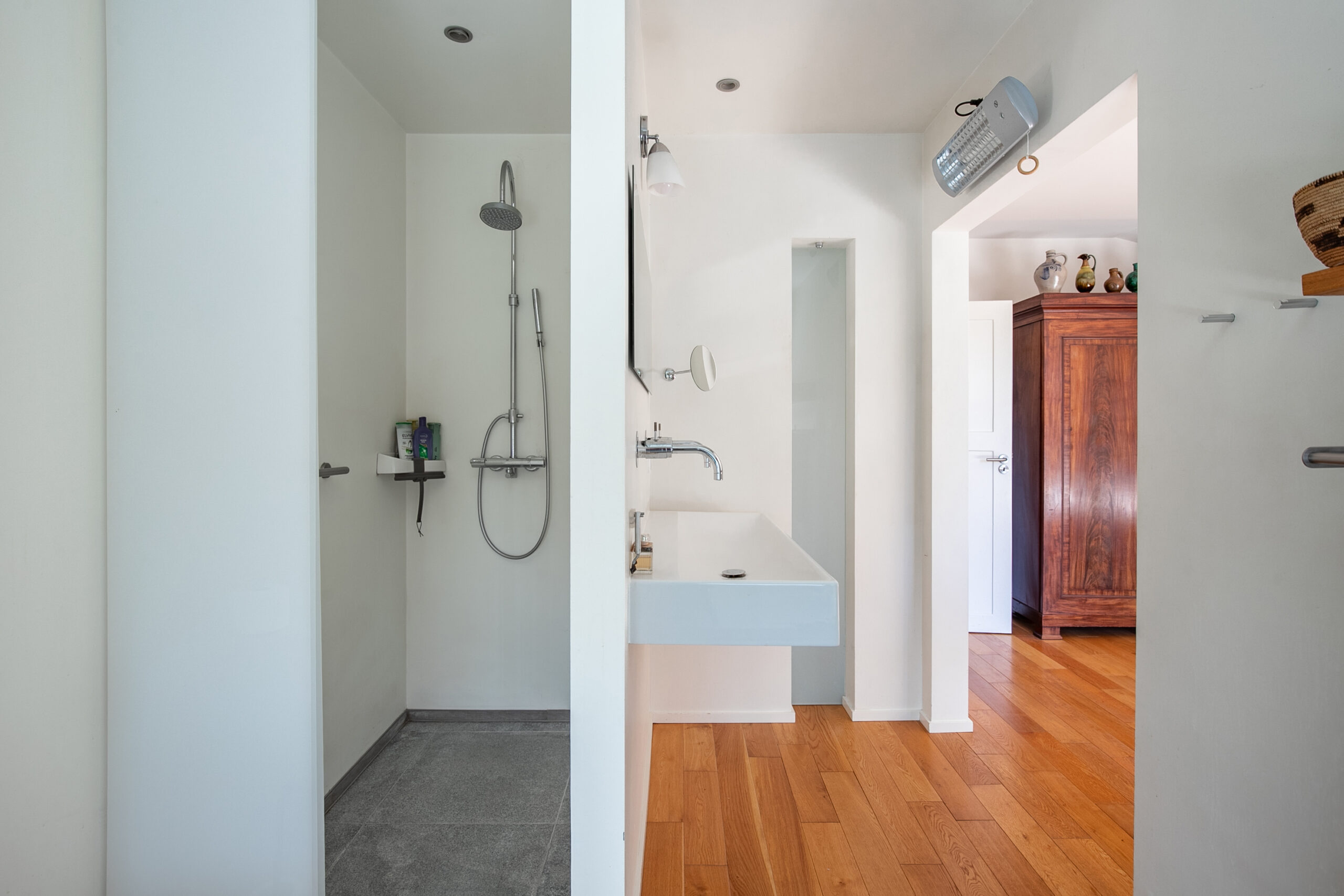 - Badkamervoorzieningen Ligbad, toilet, dubbele wastafel, wastafelmeubel, toilet, douche, wastafel