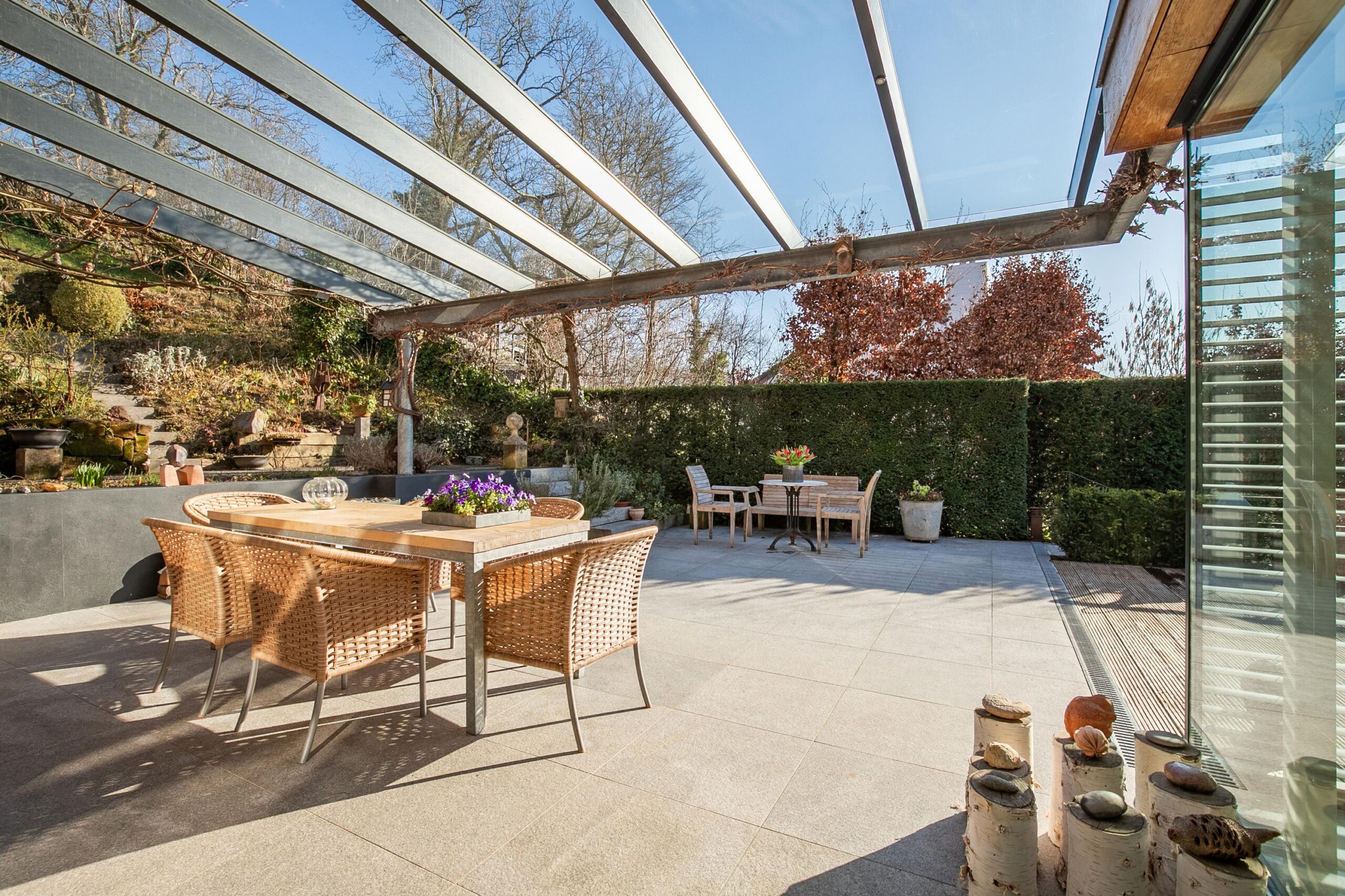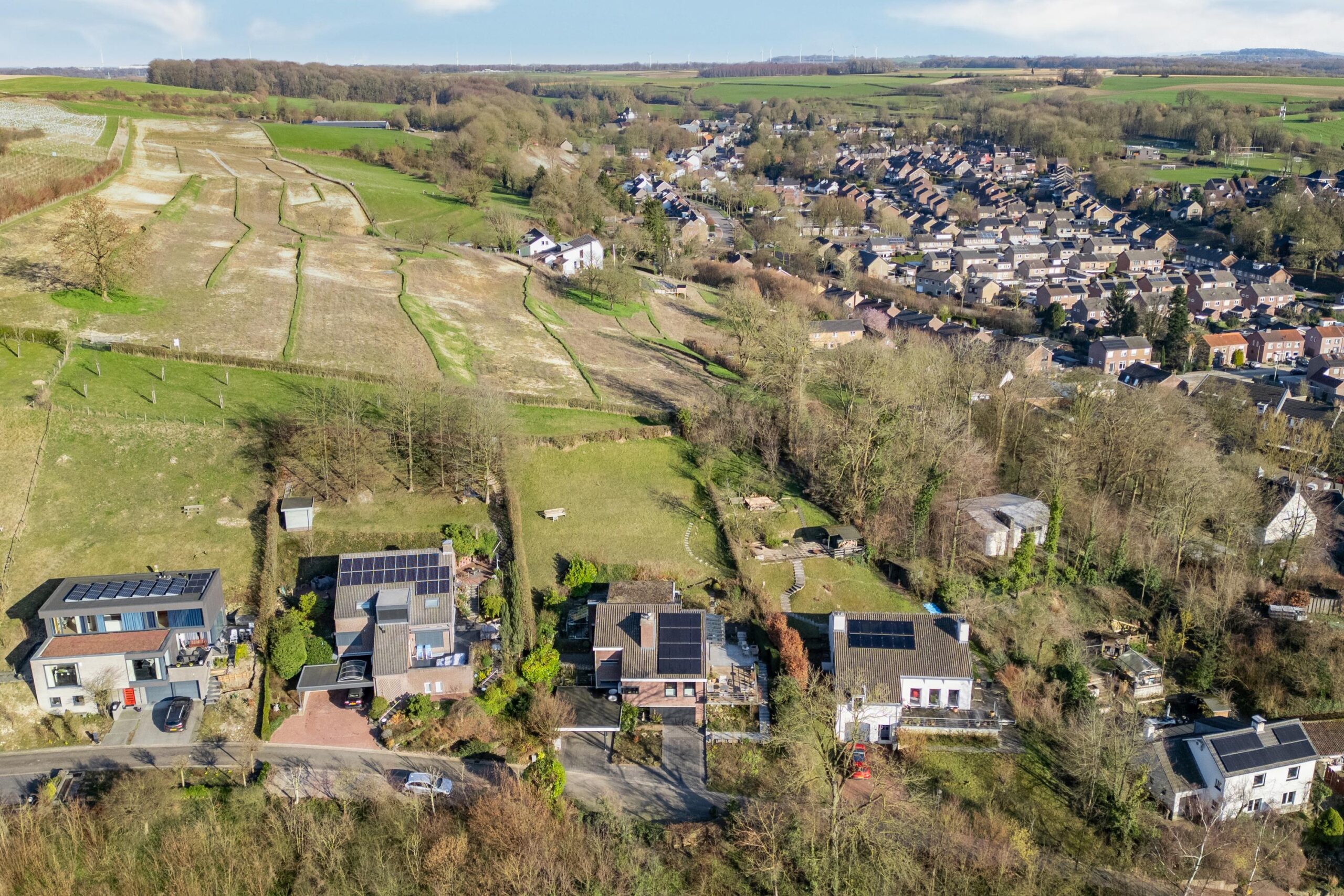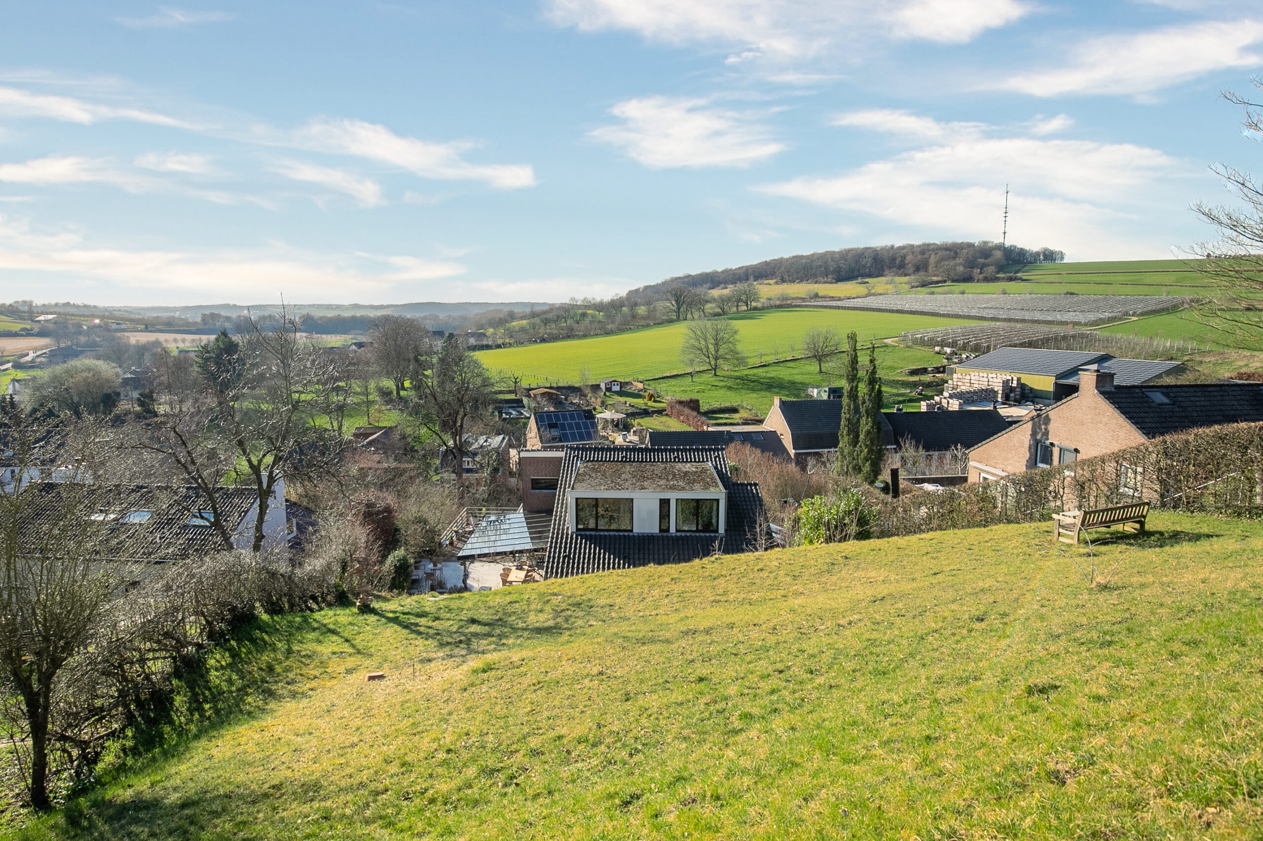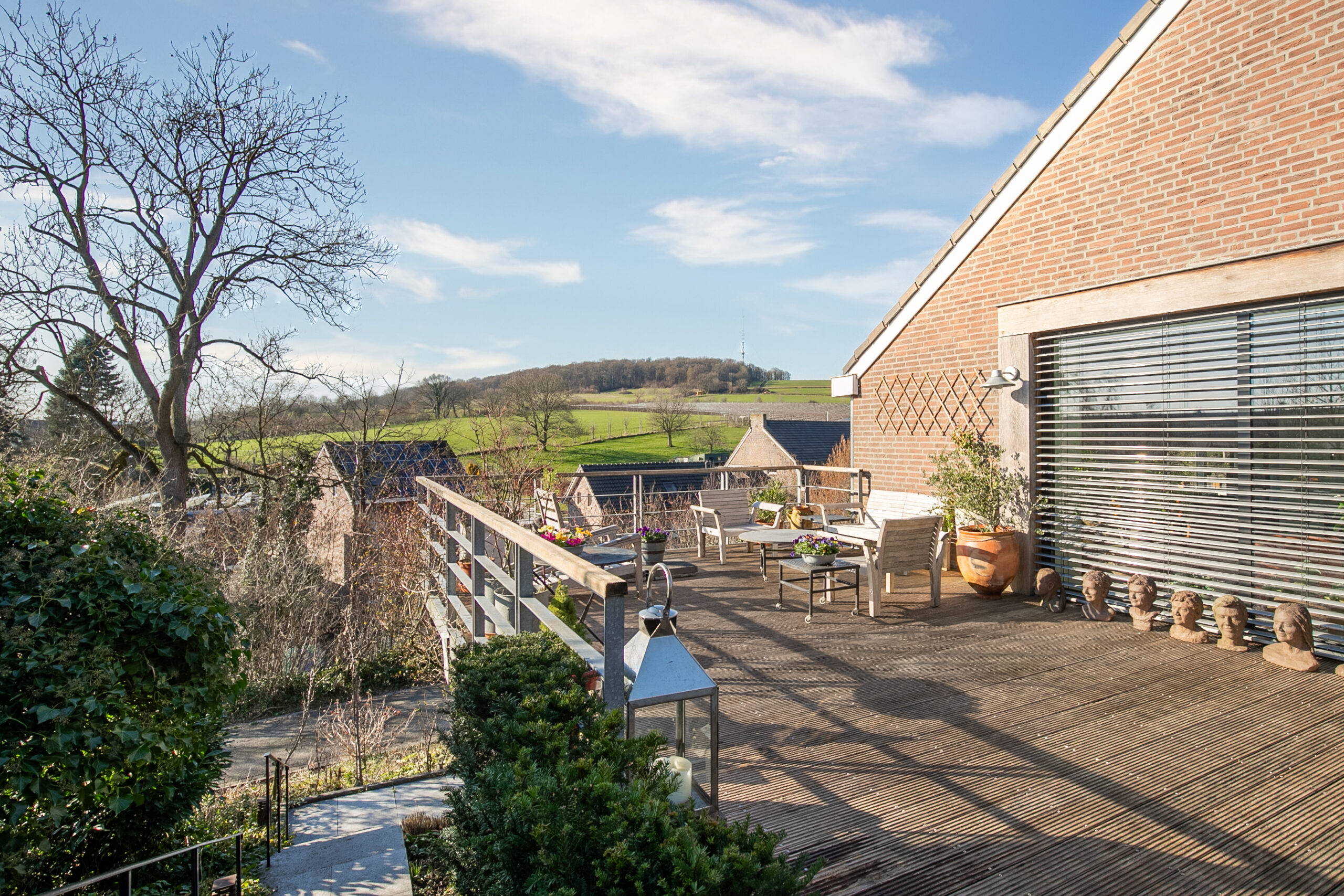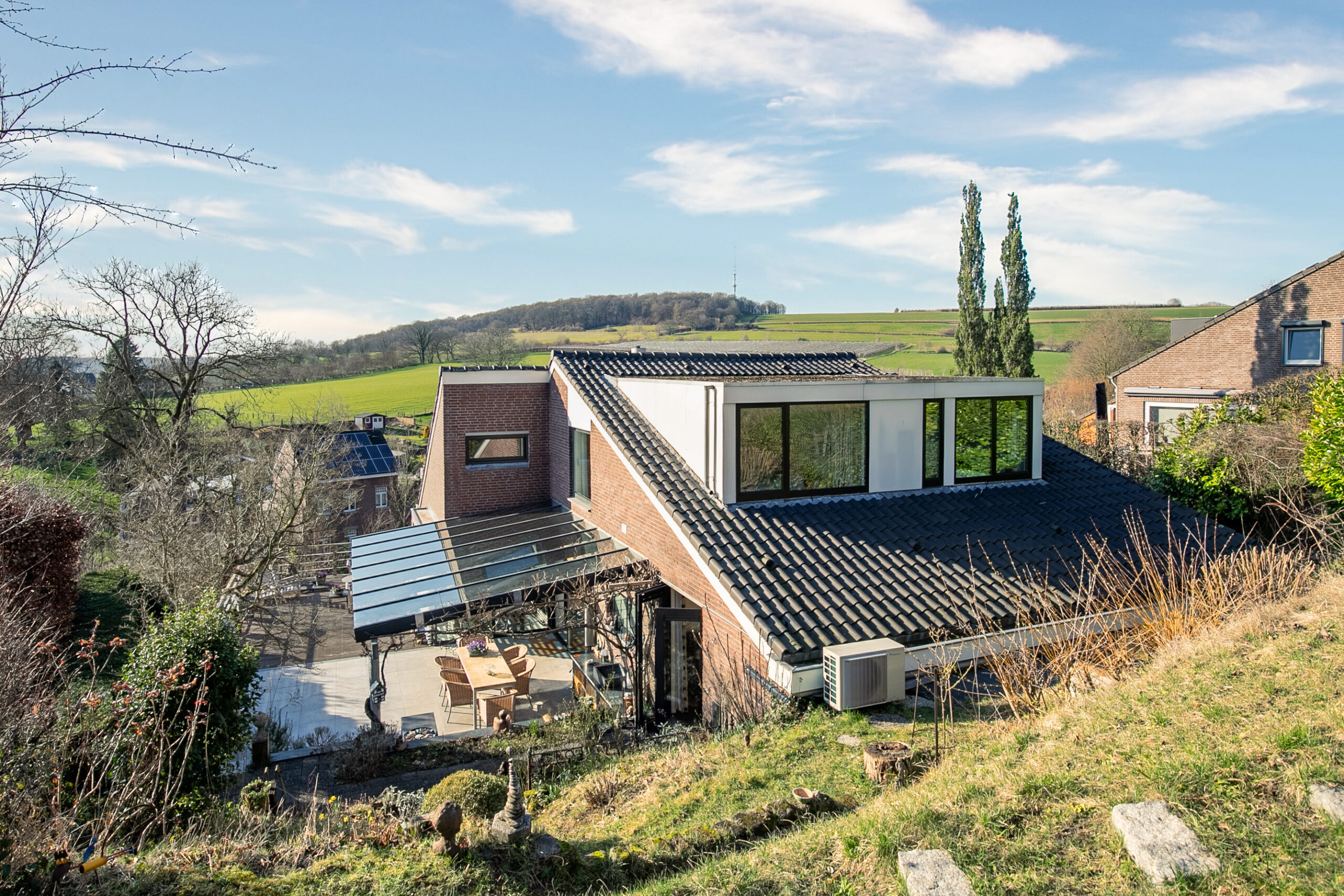 De woning is tegen de helling aan gebouwd en de eigenaren hebben de terrassen en tuin ingericht om optimaal te kunnen genieten van de omgeving. Er zijn heerlijke en zeer royale terrassen met graniet en hardhouten (Cumaru) vlonders direct grenzend aan de leefgedeeltes. Onder de ruime glazen overkapping is het ook bij minder goed weer mogelijk te genieten van de tuin. In de verte aan de horizon rijdt de stoomtrein van het miljoenen-lijntje. Zo af en toe stuurt die een stoot stoom de lucht in. Aan de achterzijde van de woning ligt een helling die in het voorjaar een ware beleving is door een prachtige natuurlijke bloemenzee. Er bloeien jaarlijks honderden wilde orchideeën en allerlei andere wilde bloemen die op verschillende tijden in bloei staan. De bank halverwege de tuin is heerlijk om te genieten van de vergezichten… Boven aan de achterzijde van de tuin is een uitgang met toegang tot een wandelpad in het Limburgs land.