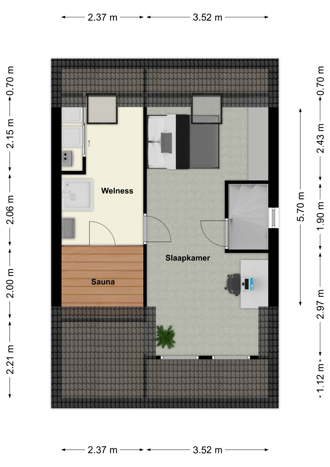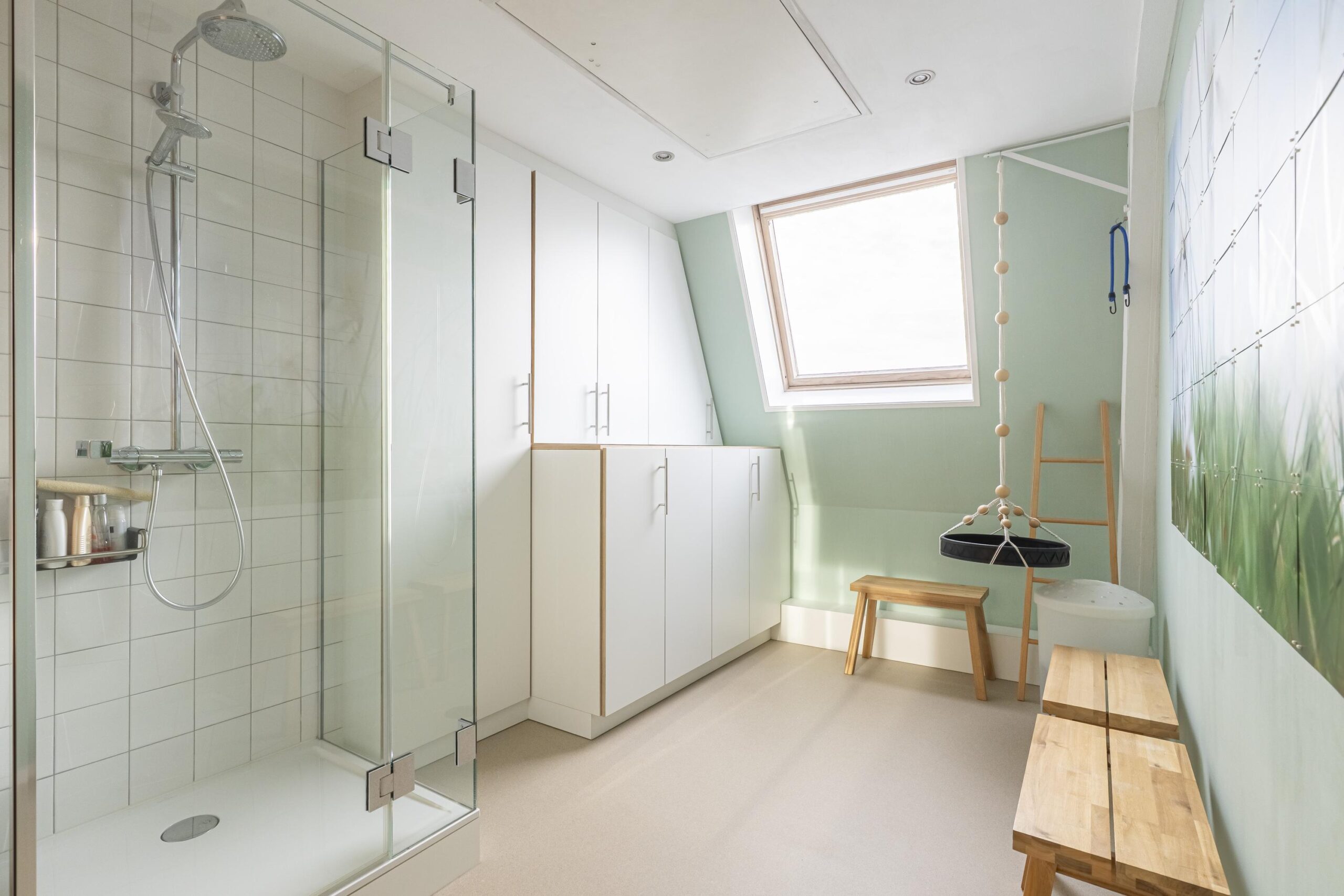 Middels vaste trap bereikbare zolderkamer (ca. 21 m2 met stahoogte > 1,50 meter) met vloerbedekking, ruime inbouwkast, groot Velux dakraam aan de achterzijde, ruime dakkapel aan de voorzijde en diverse toegangen tot bergruimte onder de schuine kap. Via de slaapkamer is de welness bereikbaar (ca. 12 m2) met troffelvloer, wastafelmeubel, douchecabine en luxe Klafs sauna/sanarium. Tevens is ook in deze ruimte een ruim dakraam gerealiseerd en in nette muurkasten bevinden zich de witgoedaansluitingen en opstelling Nefit combiketel (2013, eigendom).