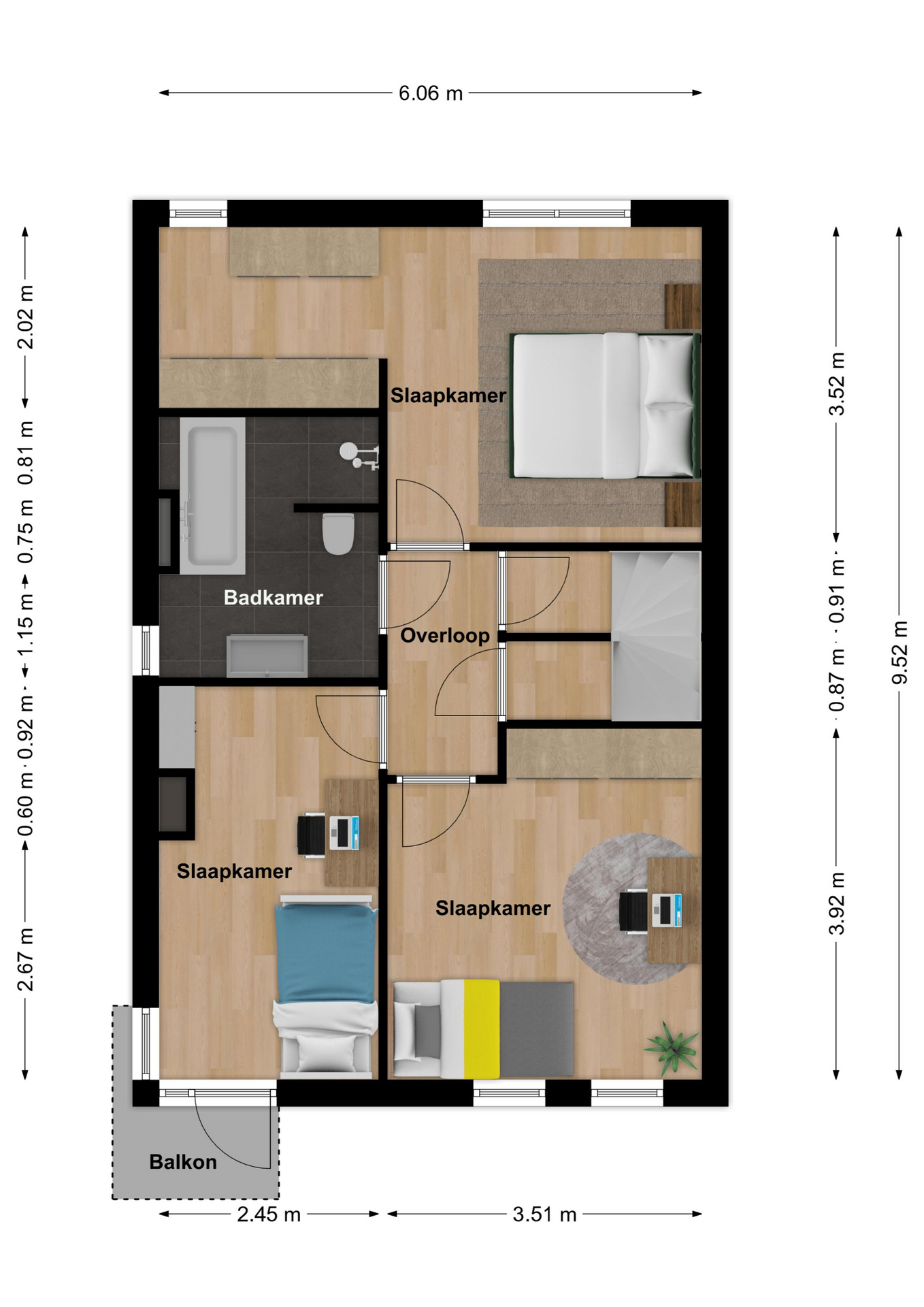 Overloop met parketvloer en stucwerk. Slaapkamer 1 aan de achterzijde (ca. 17,5 m2) met parketvloer, stucwerk en kleedgedeelte. Slaapkamer 2 en 3 aan de voorzijde (resp. ca. 13 en 10,5 m2) met eveneens parketvloer en stucwerk en tevens klein balkon bij de kleinste slaapkamer. De in 1992 gerealiseerde badkamer is ca. 7 m2 groot, is volledig betegeld en beschikt over een ligbad, douche, hangcloset, wastafel meubel met Corian blad en inbouwspots.