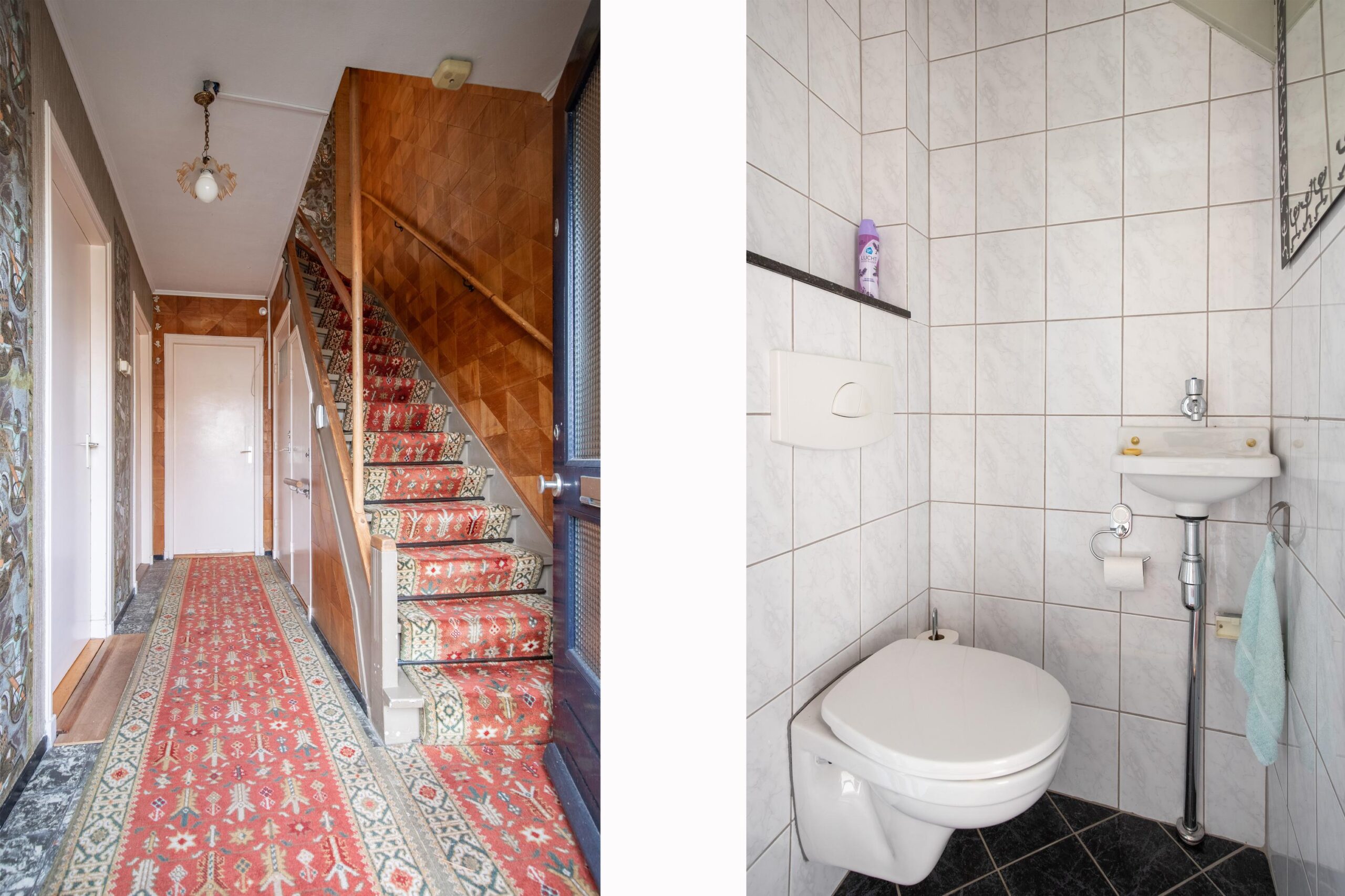 Entree. Hal met vernieuwde meterkast en geheel betegelde toiletruimte met zwevend toilet, fontein en mechanische