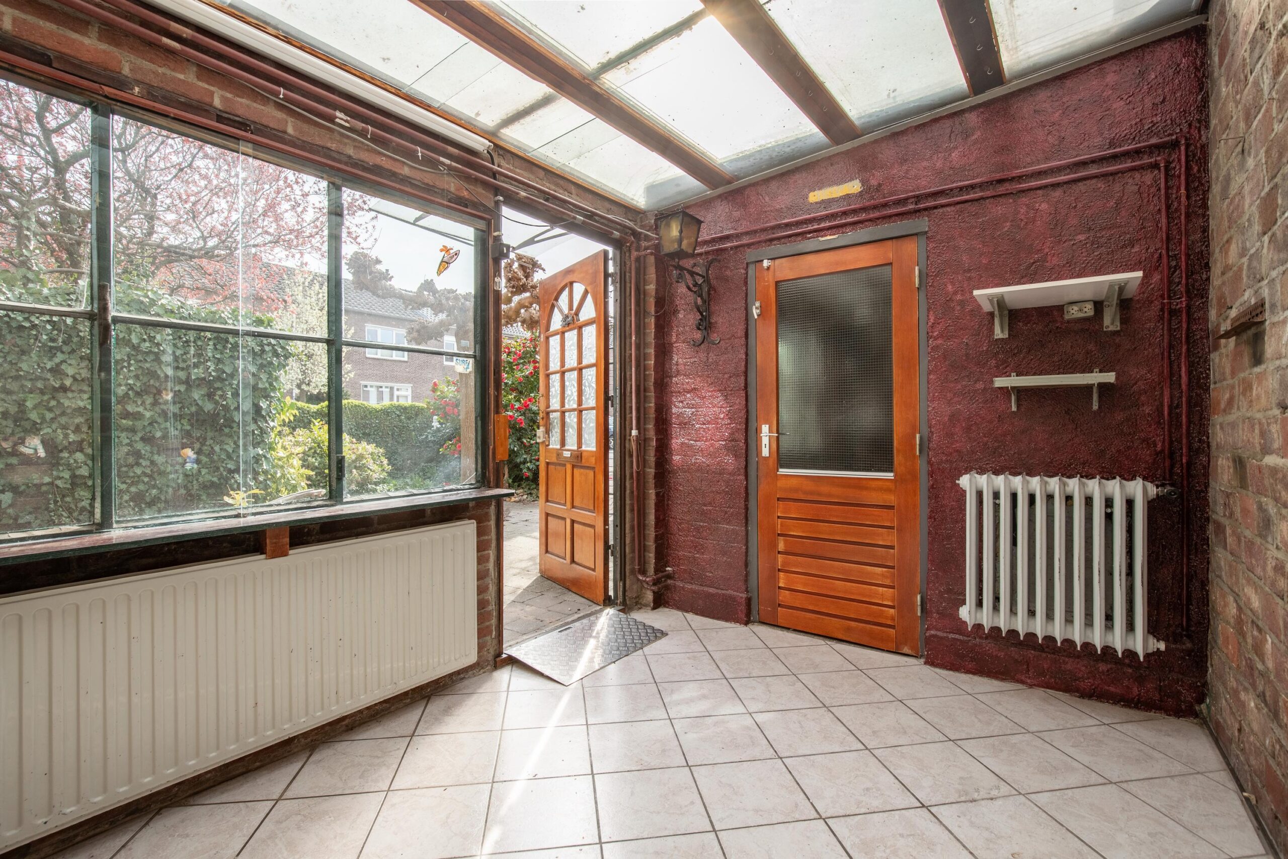 Via de serre toegang tot de zonnige achtertuin. De sfeervolle tuin is gedeeltelijk betegeld en voorzien van een zonnescherm.