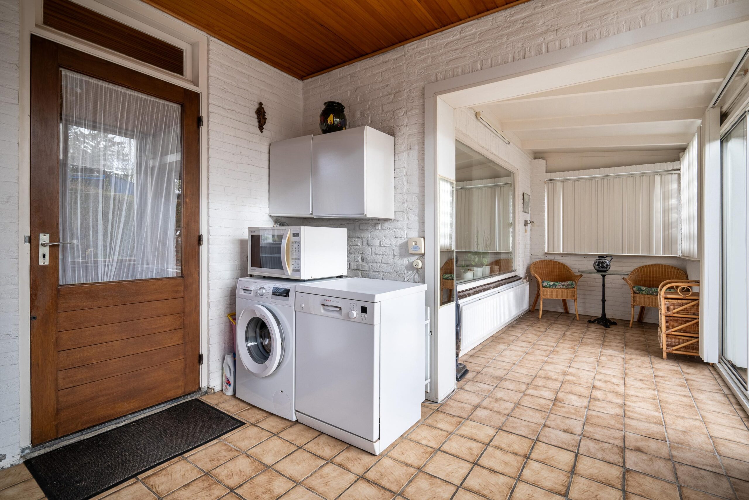 Aansluitend bevindt zich de open keuken, uitgevoerd in een authentieke eikenhouten hoekopstelling en voorzien van een koelkast, oven, keramische kookplaat en afzuigkap. Terwijl je kookt, kijk je vrij uit over de achterliggende velden, een uitzicht dat nooit verveelt! Vanuit de keuken loop je door naar de serre, een heerlijke verwarmde ruimte die het hele jaar door gebruikt kan worden. Dankzij de directe verbinding met de tuin, de oprit en de garage vormt deze serre een fijne uitbreiding van de leefruimte. Momenteel is hier tevens de opstelplaats voor de wasmachine en vaatwasser ingericht.