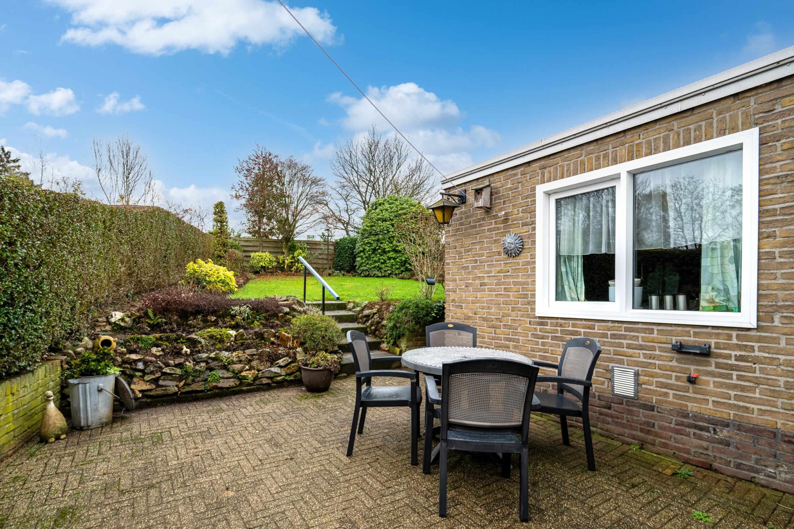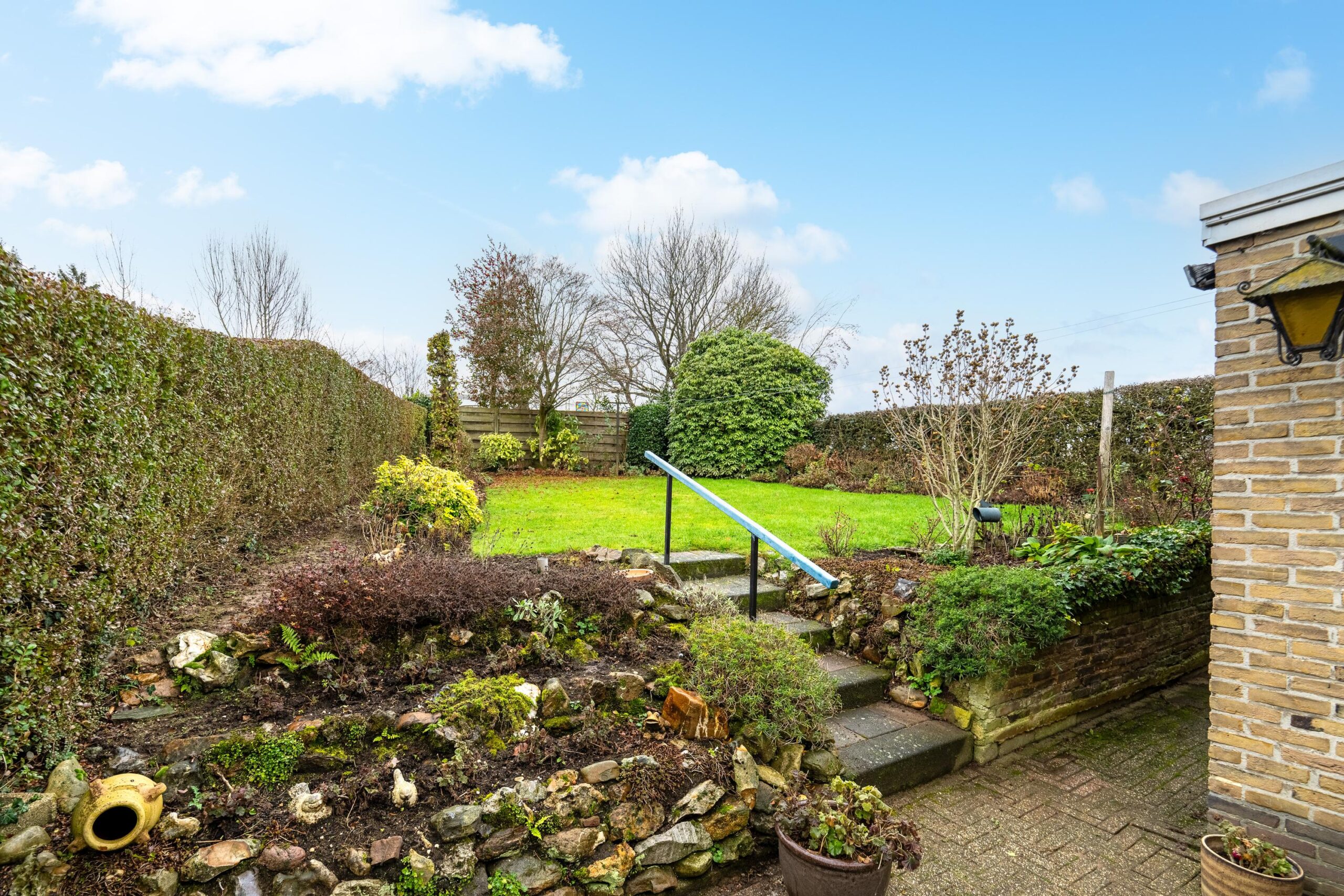 De tuin is zonnig gelegen op het zuiden en biedt daarmee van ’s ochtends vroeg tot laat in de avond een aangename plek om buiten te zijn. Het royale speelgazon maakt de tuin ideaal voor iedereen die graag van een groene, onderhoudsvriendelijke buitenruimte geniet. Aan de achterzijde is het vrije uitzicht over de landerijen werkelijk een grote meerwaarde: een gevoel van ruimte en rust dat je niet snel ergens anders vindt. Naast de garage bevindt zich een praktische berging die extra opbergruimte biedt en bovendien directe toegang geeft tot de oprit, waardoor de tuin ook via deze zijde gemakkelijk bereikbaar is.