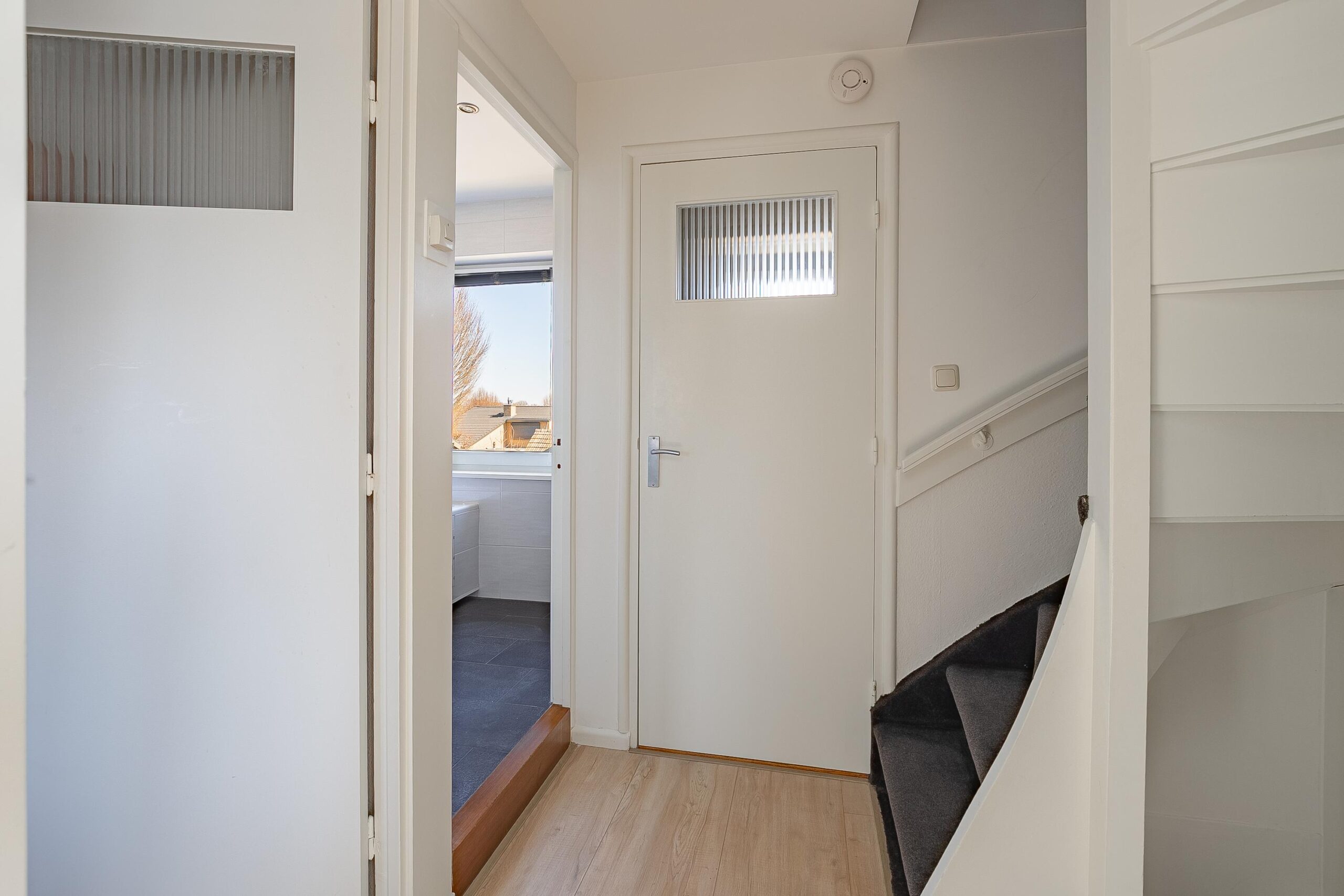 Overloop met toegang tot twee slaapkamers, badkamer, separate toiletruimte en trapopgang naar de tweede verdieping. De slaapkamers hebben een oppervlakte van circa 7,5 m² en 11,5 m². De moderne badkamer (ca. 5 m²) is compleet uitgevoerd met wastafelmeubel, douche en ligbad.