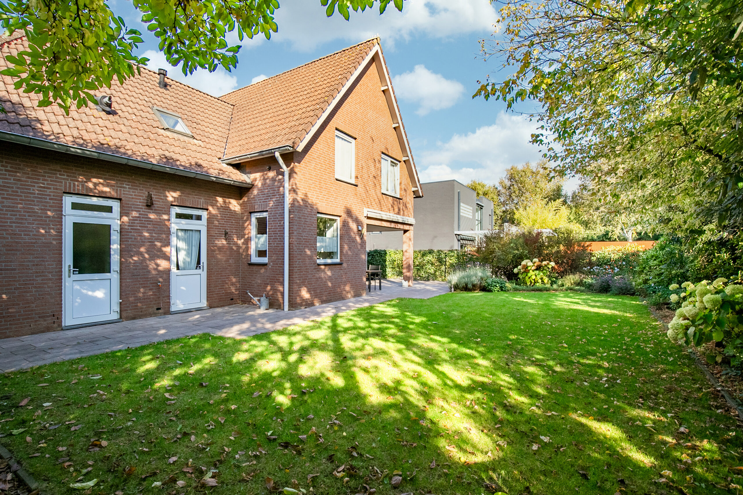 Aan de voor- en zijkant van de woning ligt een verzorgde tuin met een oprit die plaats biedt aan twee auto’s.
