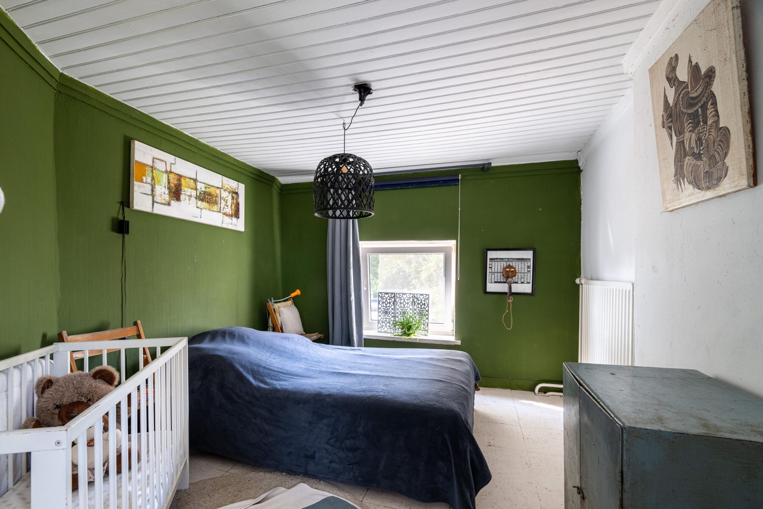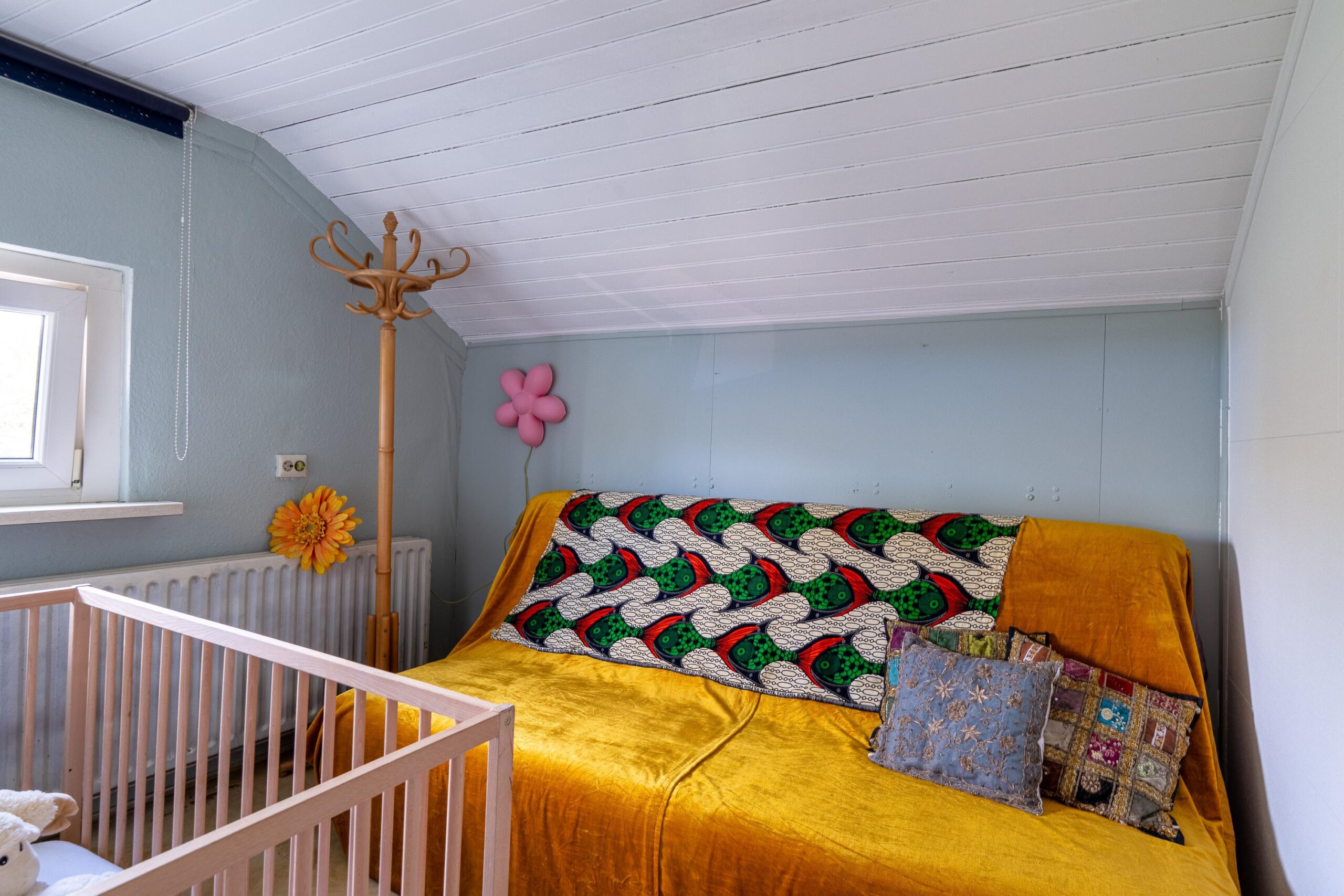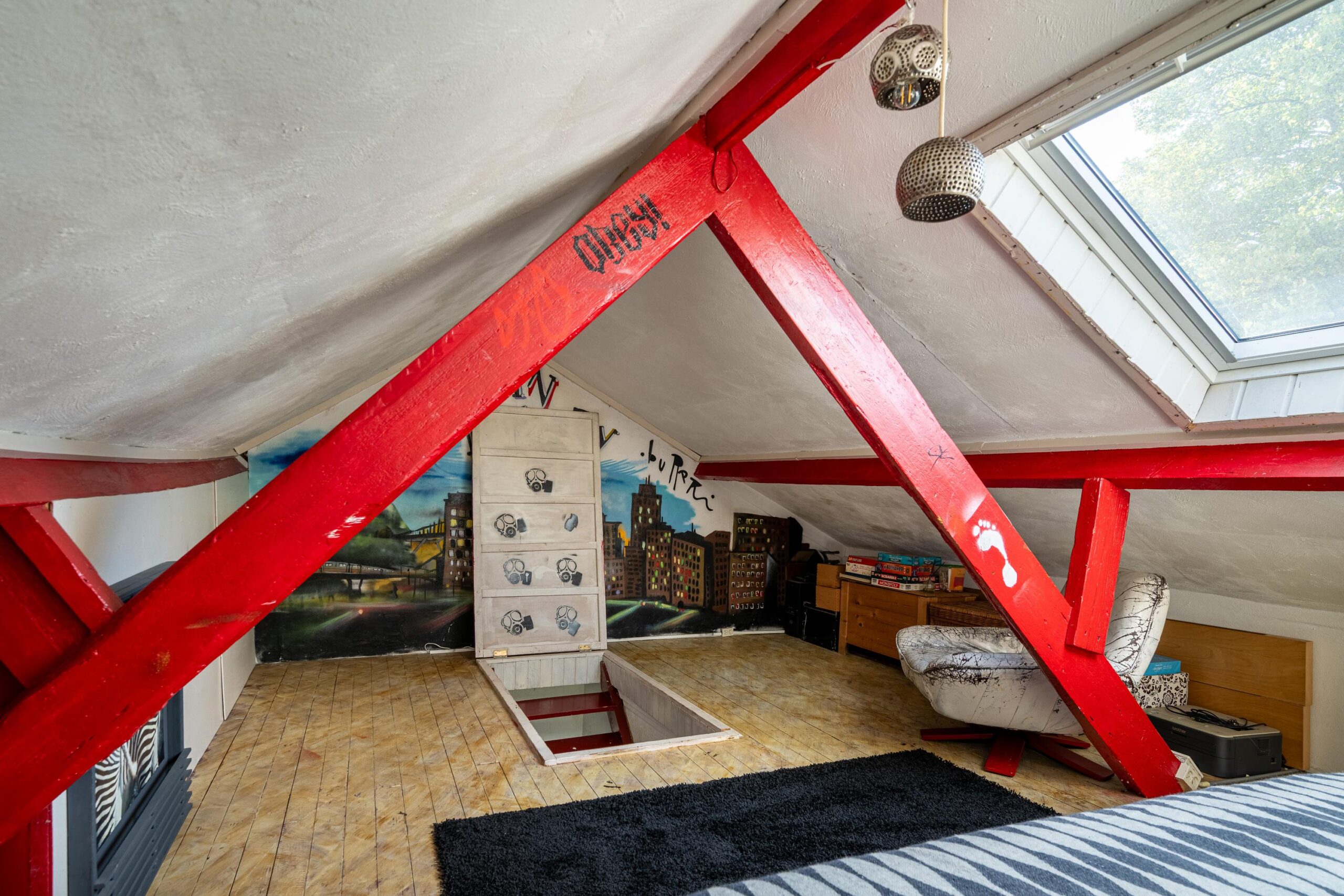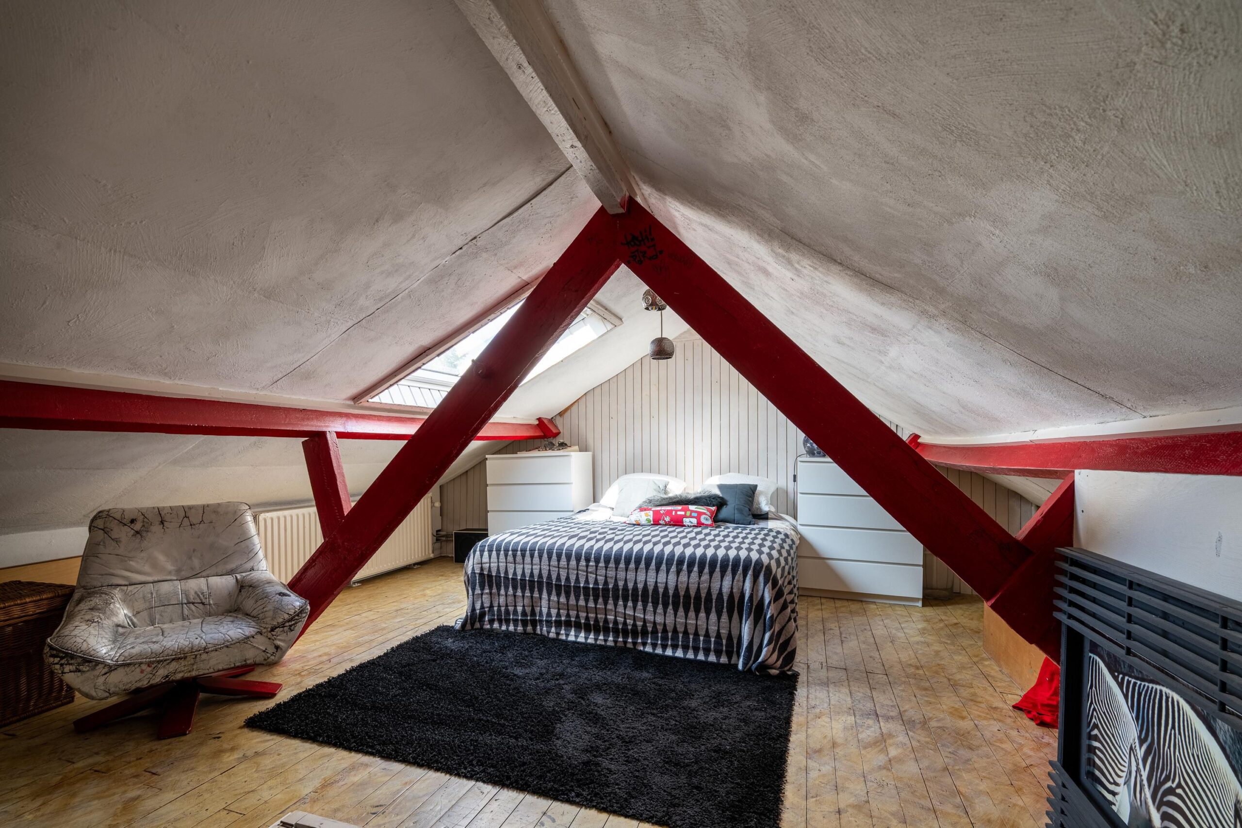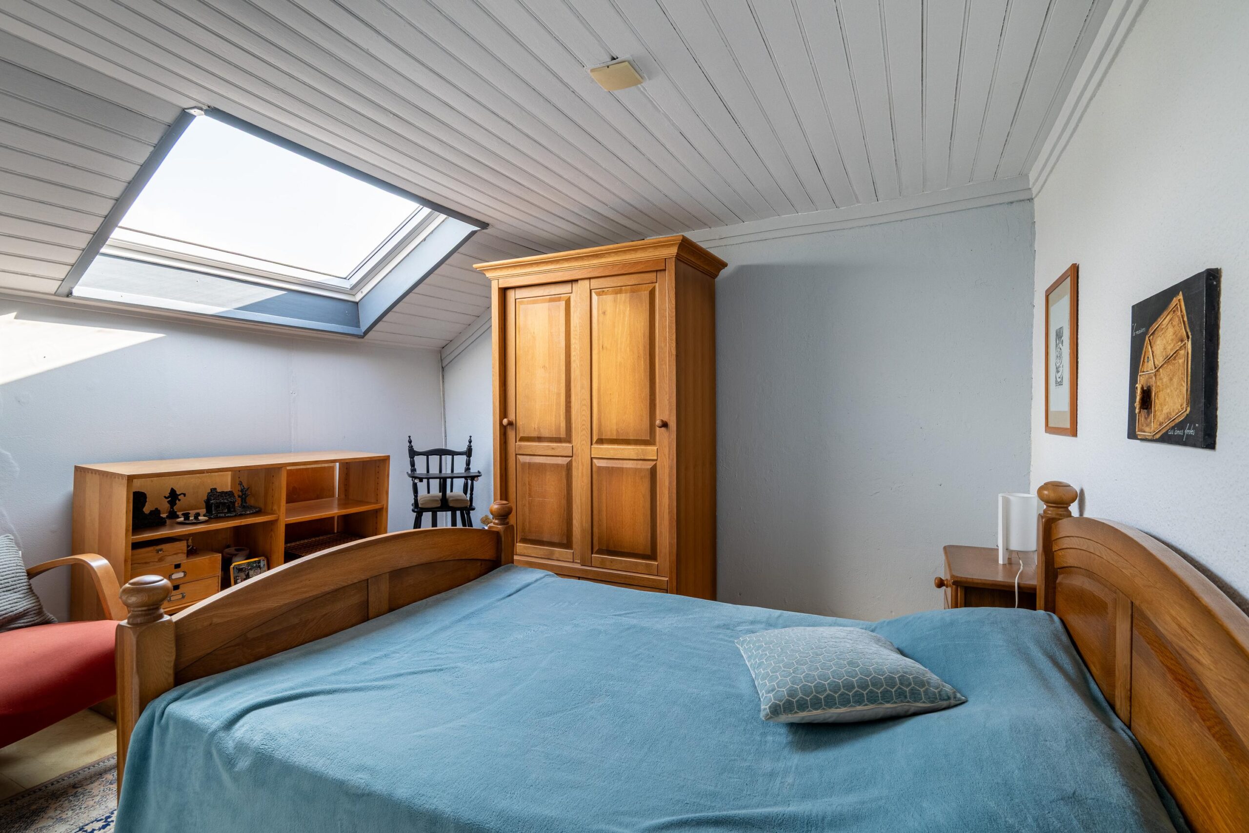 Via vaste trap bereikbare zolderverdieping, momenteel in gebruik als vijfde slaapkamer. De ruimte is voorzien van een Velux dakraam en beschikt over praktische bergruimte onder de dakspanten.