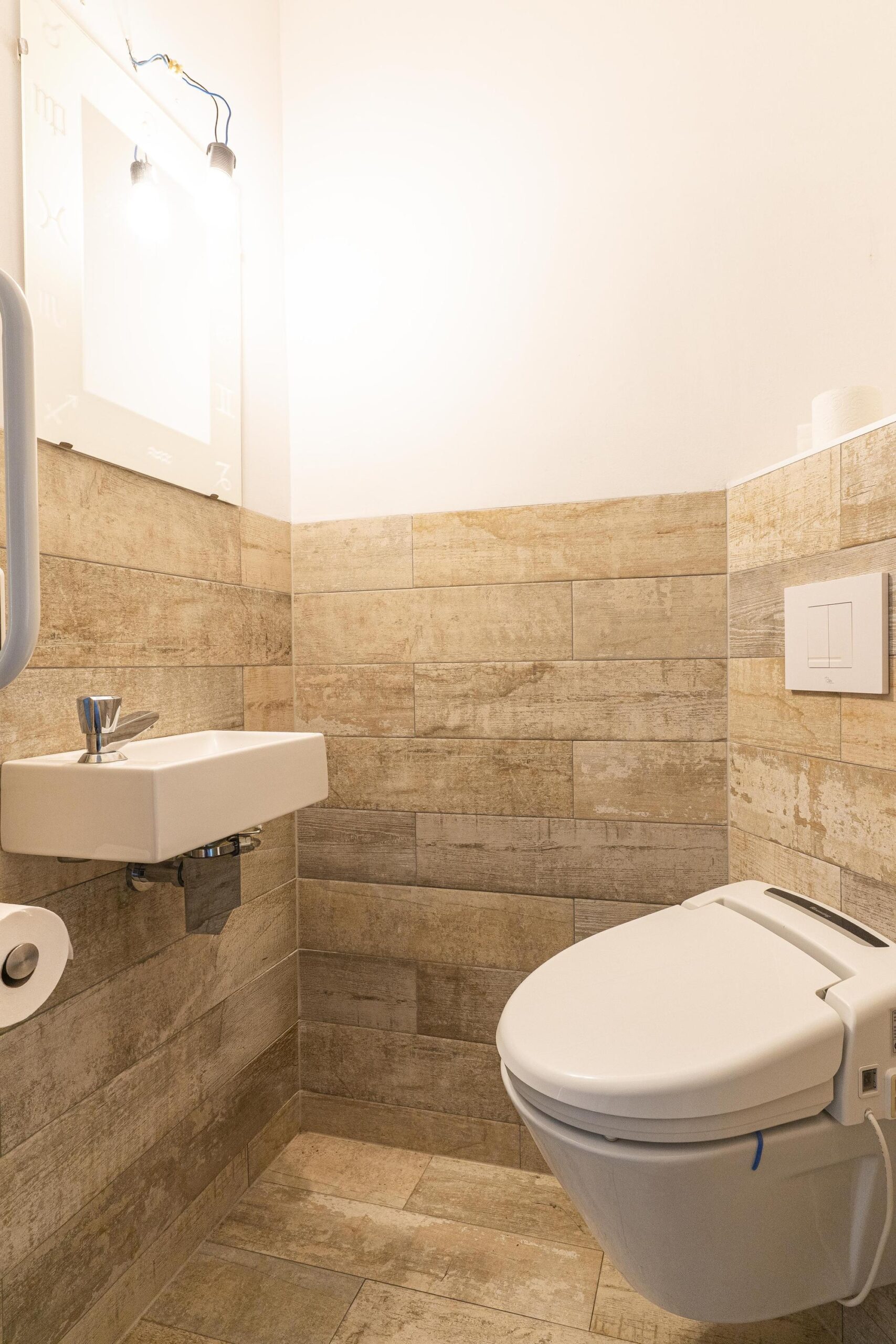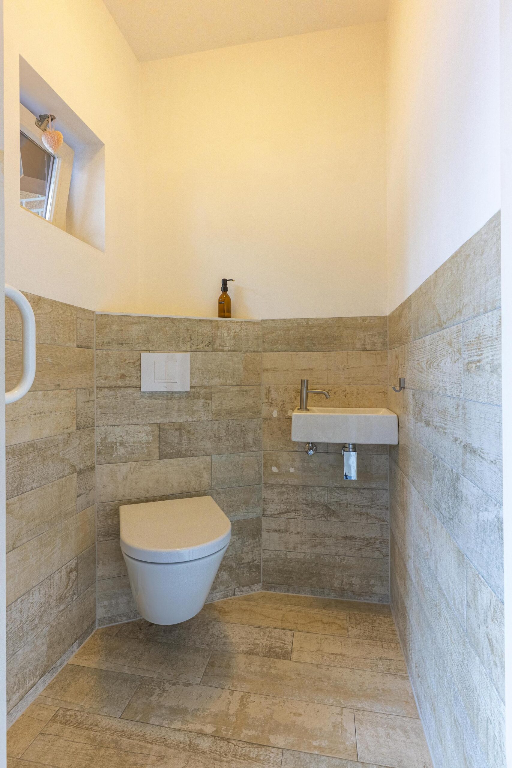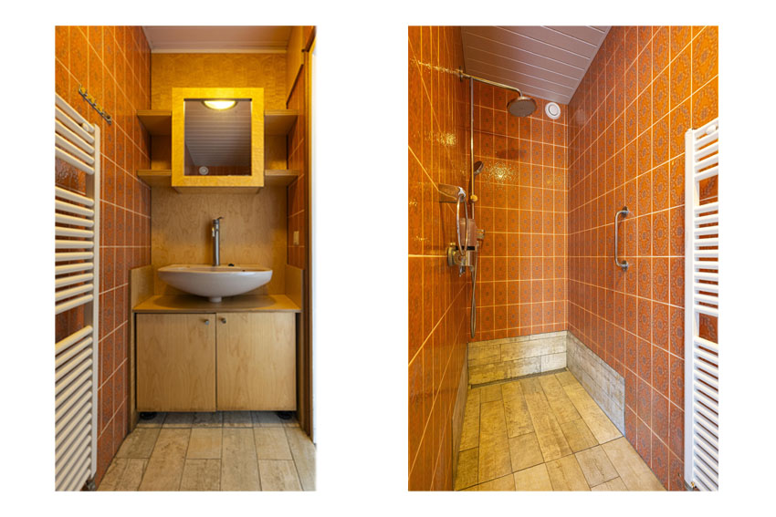 De geheel betegelde badkamer is voorzien van een vaste wastafel en inloopdouche. De riante leefkeuken is 6,52 m x 3,40 m (voorheen in gebruik als slaapkamer). De keuken is voorzien van de navolgende apparatuur: elektrische kookplaat, afzuigkap, spoelbak en koelkast. Vanuit de keuken heeft men middels een openslaande deur toegang naarhet terras en de tuin.
