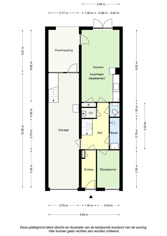 De entree biedt toegang naar de ruime hal. vanuit de hal heeft men toegang naar de slaapkamer, toiletruimte, badkamer, cv-ruimte, leefkeuken en garage.