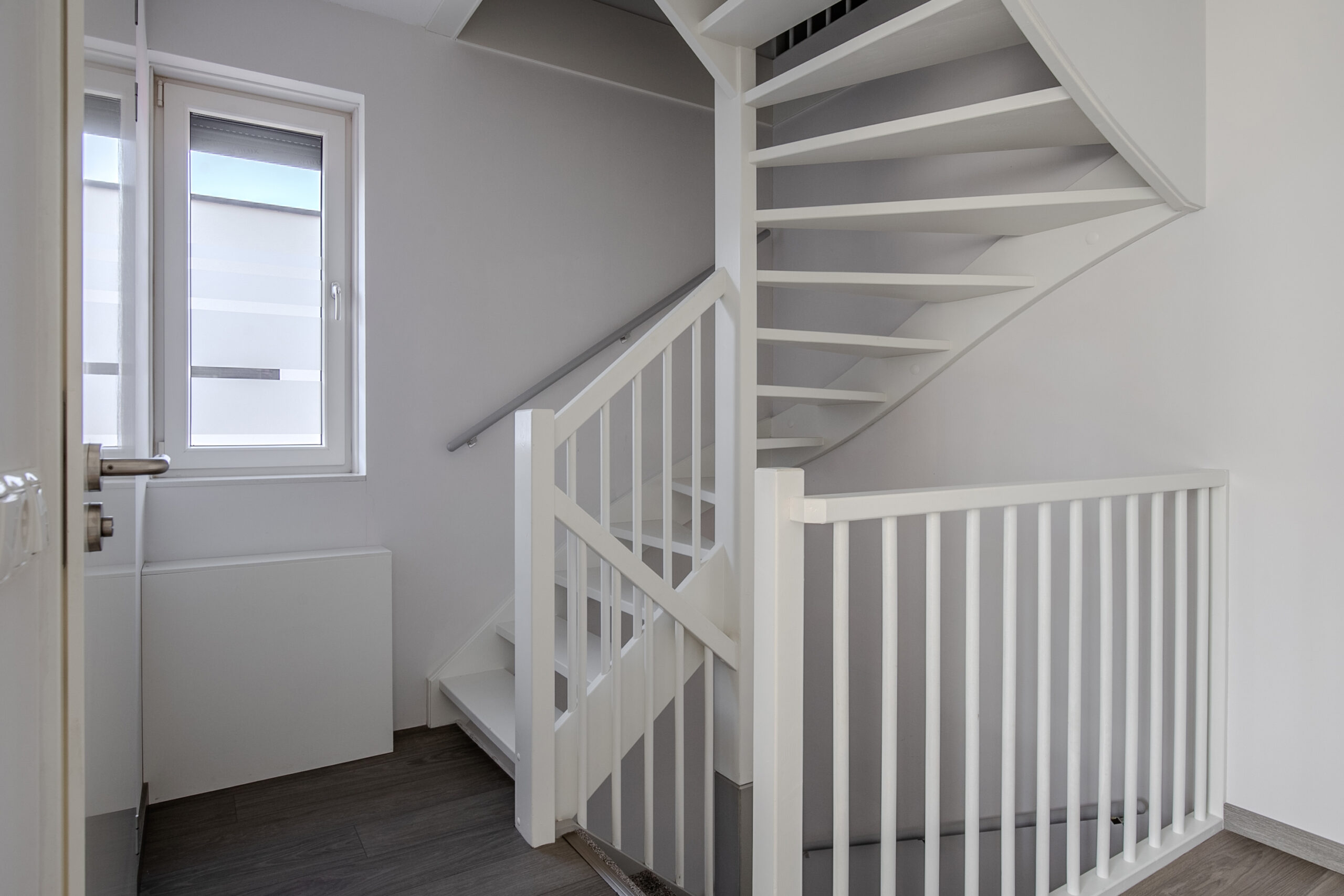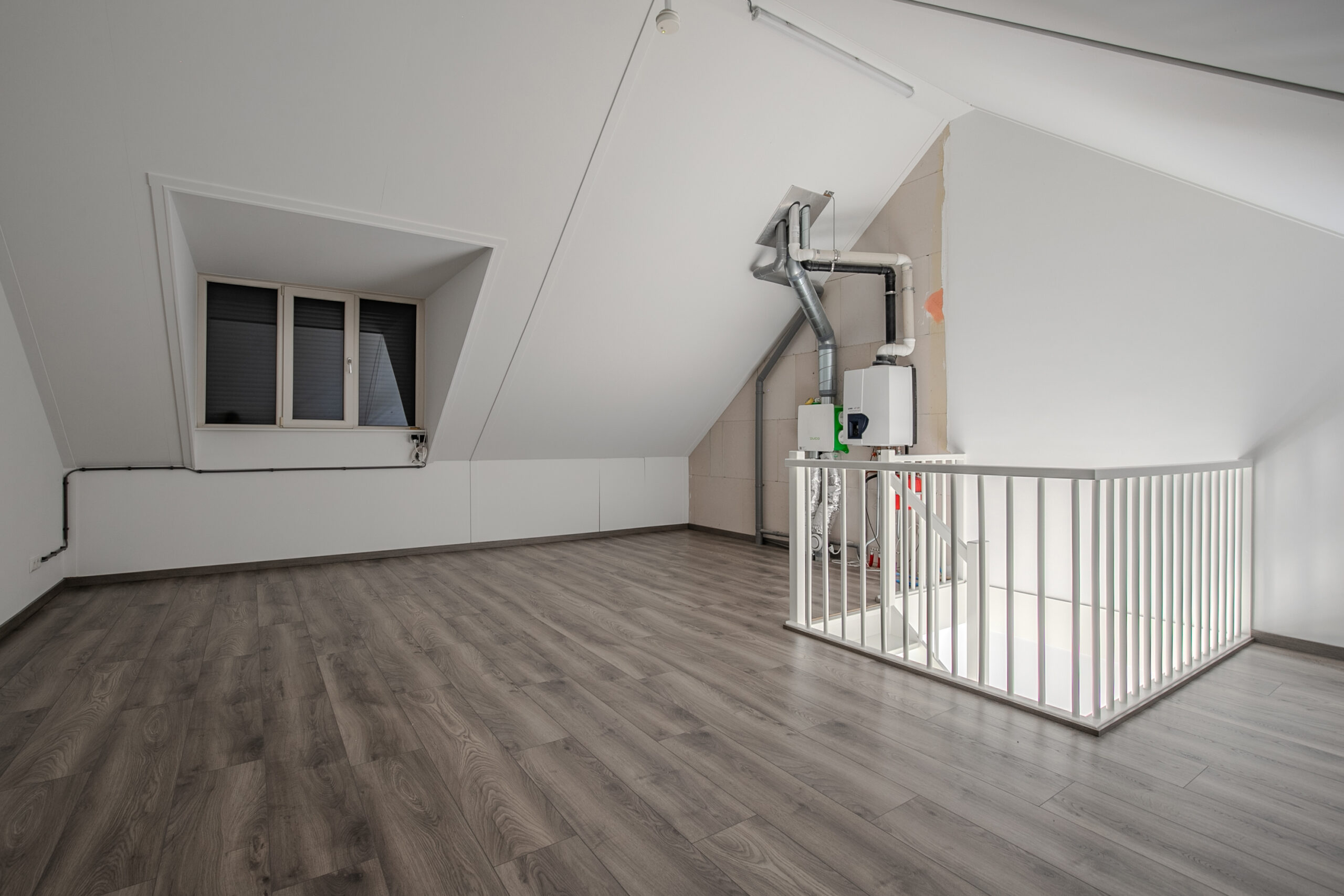 De verdieping beschikt over een groot dakkapel, waardoor de ruimte licht en luchtig aanvoelt. Daarnaast bevinden zich hier de opstelling van de Atag HR-combiketel (2018, eigendom) en het Duco ventilatiesysteem (2018).