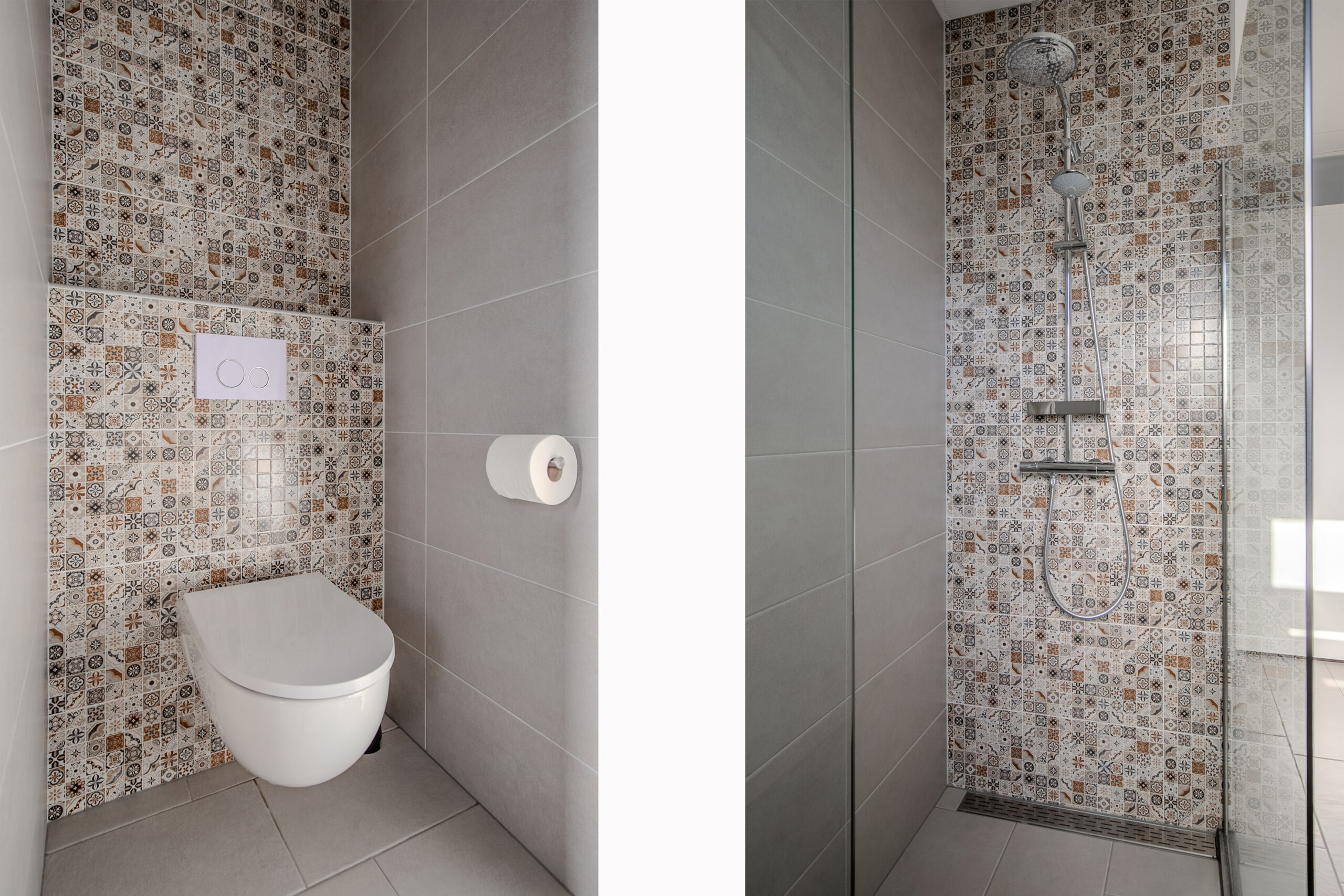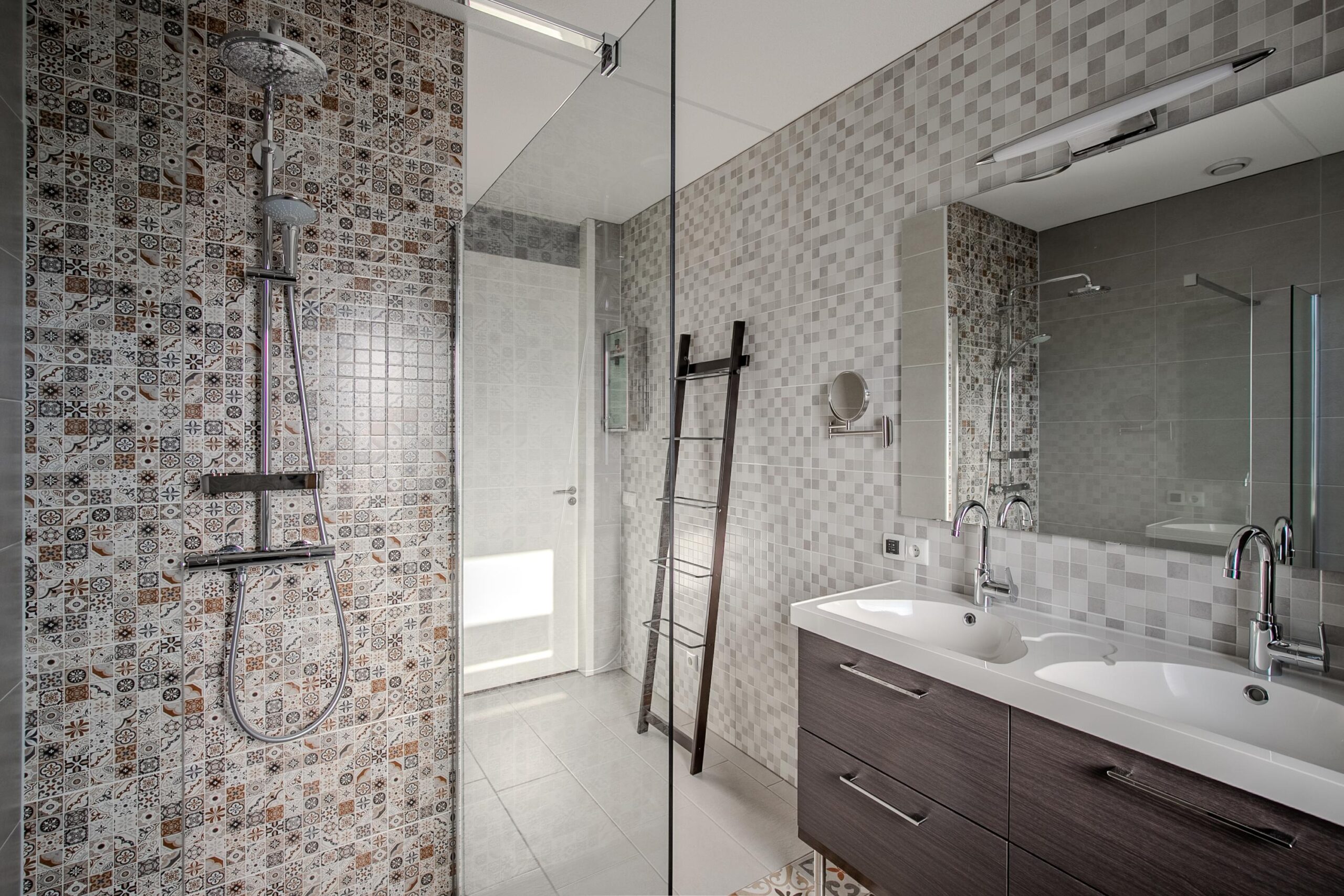 De badkamer is luxe uitgevoerd en volledig betegeld. De ruimte beschikt over een grote inloopdouche, zwevend toilet en een dubbele wastafel met modern meubel, spiegel en verlichting. Dankzij het tijdloze design en de hoogwaardige materialen is dit een stijlvolle en praktische ruimte waar comfort centraal staat.