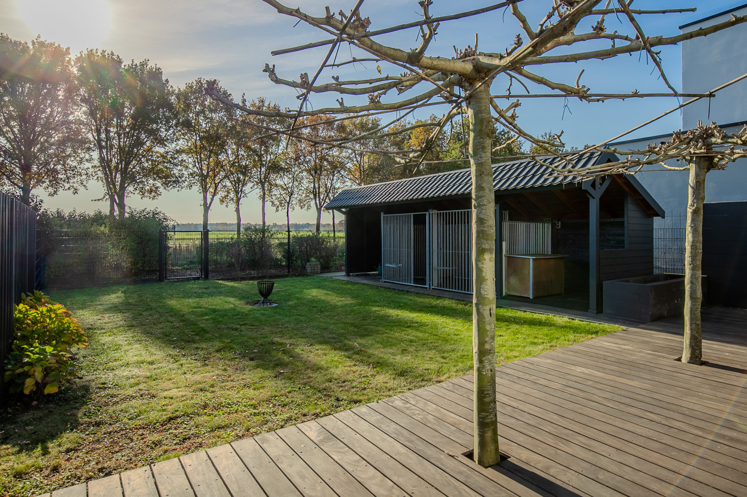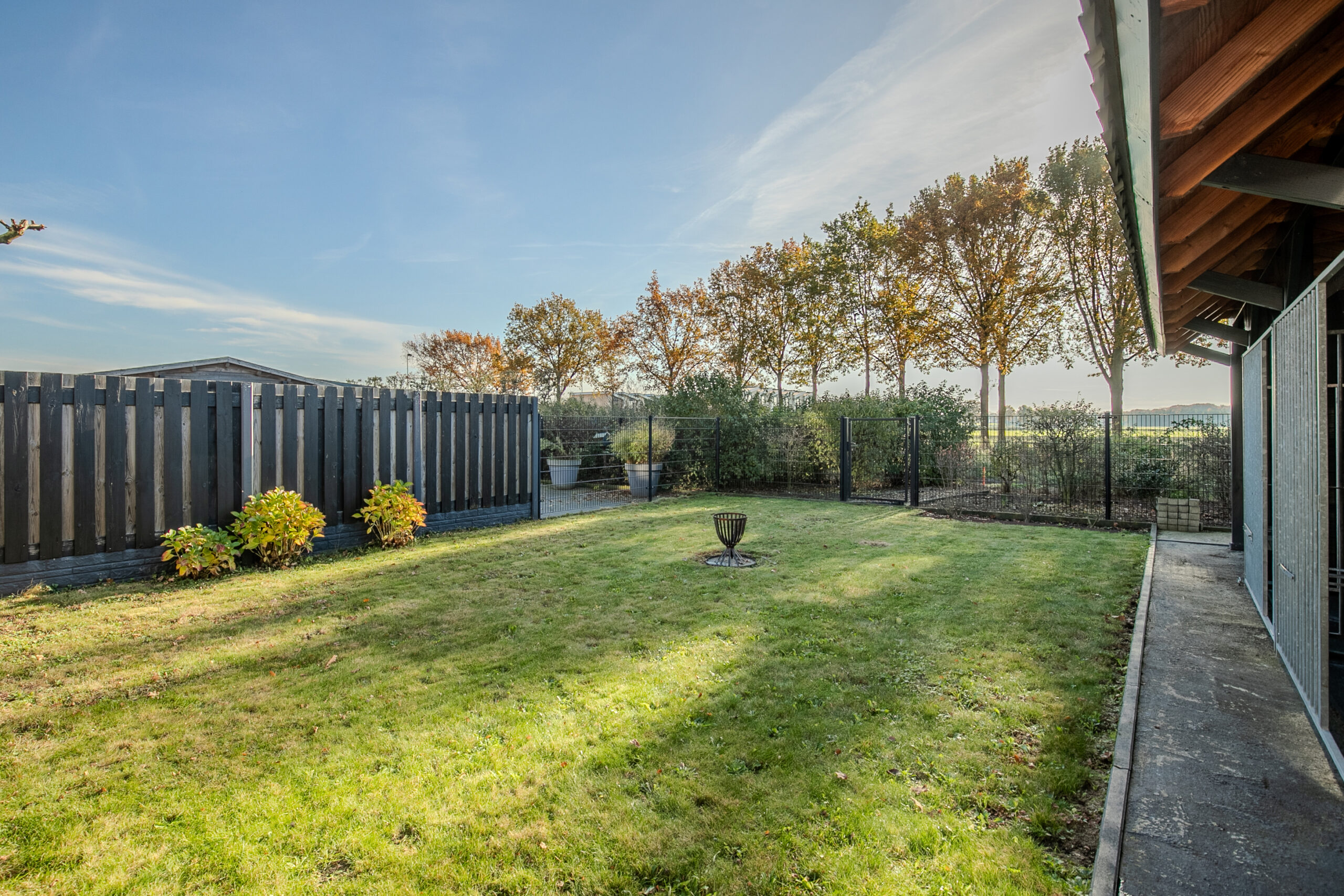 De achtertuin is een ware eyecatcher: smaakvol aangelegd met een terras van hardhouten planken, een gazon, gevarieerde beplanting en een achterom aan zowel de zijkant als de achterzijde. Achterin bevindt zich een royale houten overkapping met aparte berging en een gezellig zitgedeelte, ideaal voor lange zomeravonden of beschutte wintermomenten. De tuin ligt op het zuiden, waardoor je de hele dag kunt genieten van de zon en het adembenemende uitzicht over de landerijen.