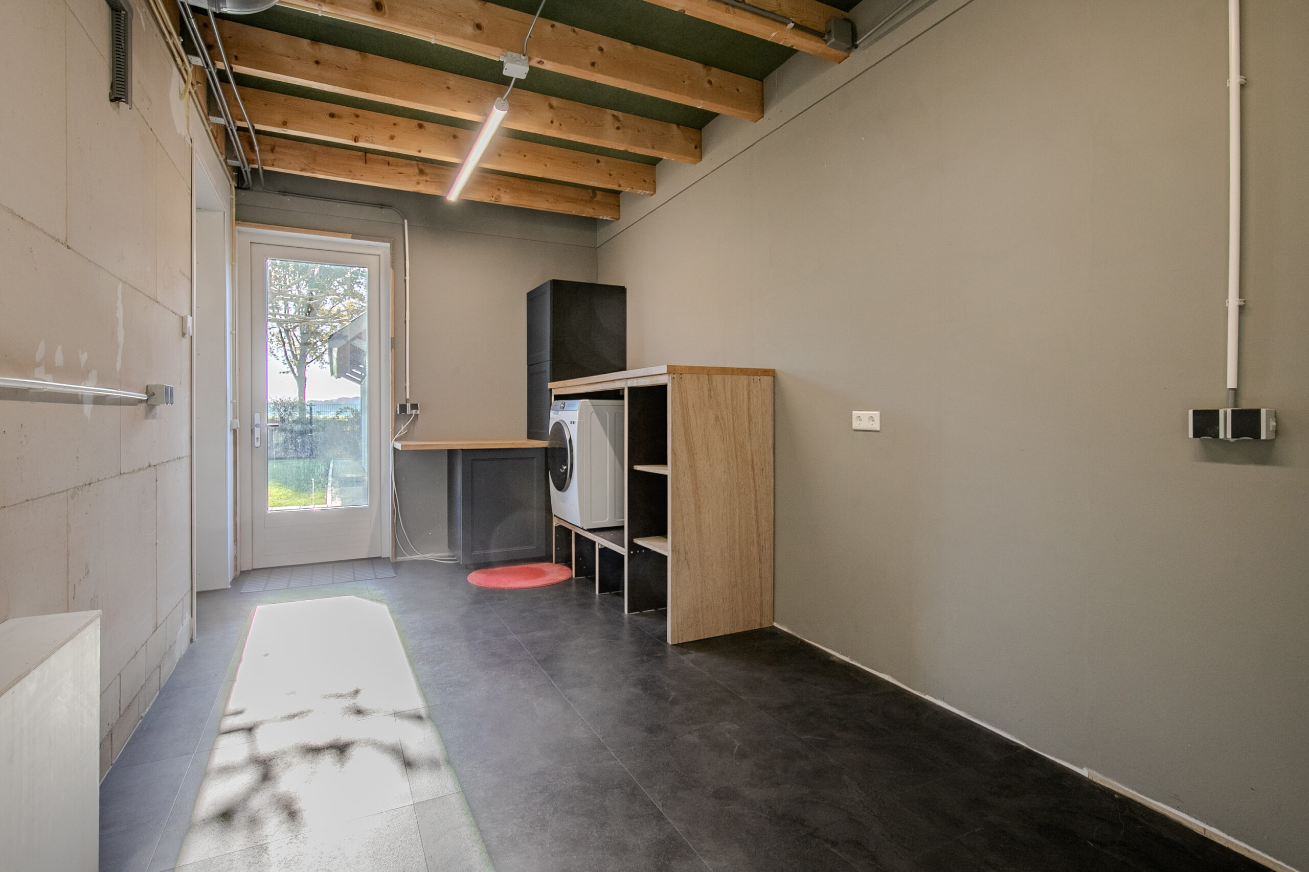 De inpandige, volledig geïsoleerde en verwarmde garage is bereikbaar vanuit de keuken en beschikt over kunststof garagedeuren, een pvc-vloer en een achterdeur naar de tuin. Deze ruimte kan multifunctioneel worden gebruikt — bijvoorbeeld als hobbyruimte, bijkeuken of werkplek.