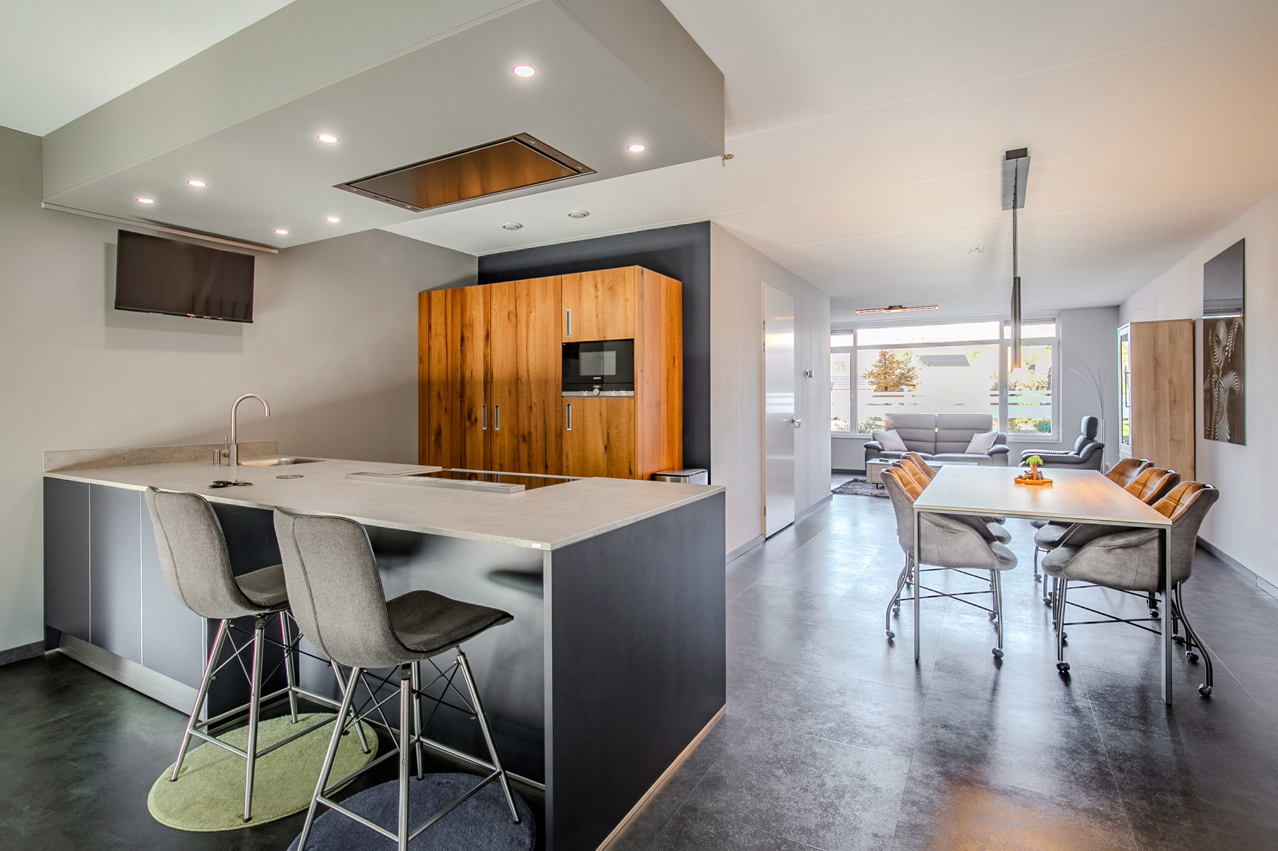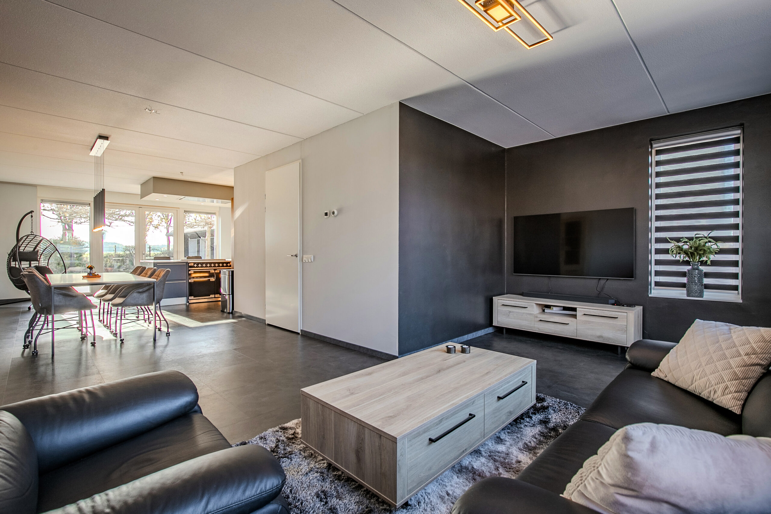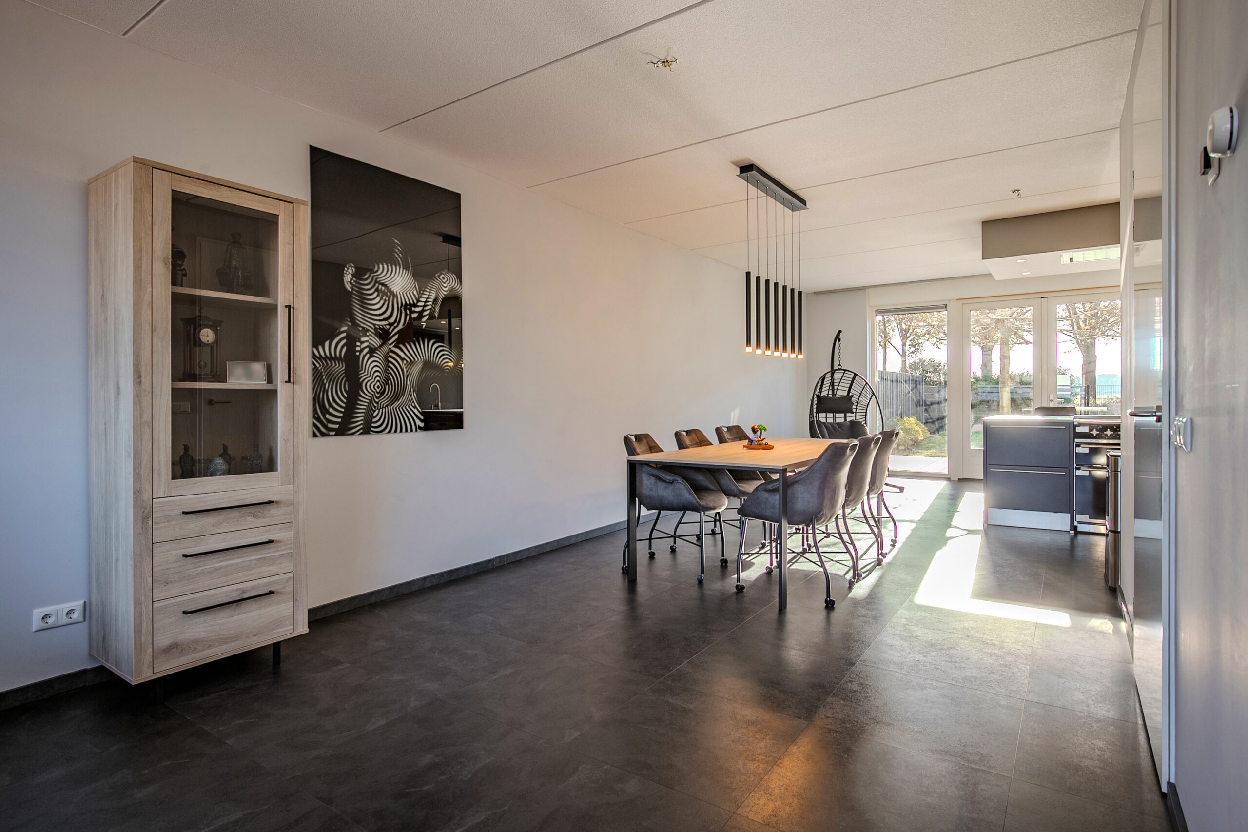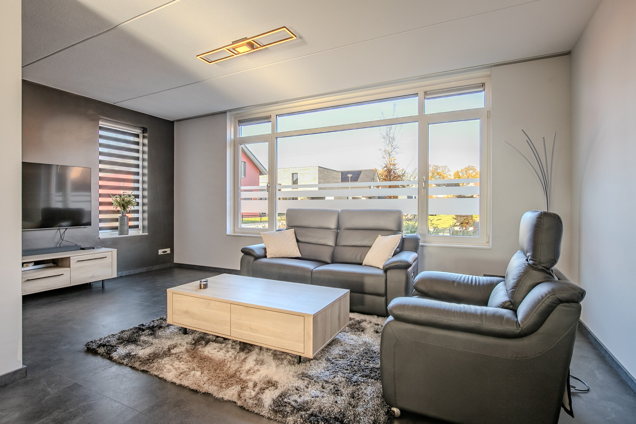 De ruime L-vormige woonkamer heeft grote raampartijen die zorgen voor een overvloed aan daglicht en een prettig uitzicht op zowel de voor- als achtertuin. De ruimte is afgewerkt met een onderhoudsvriendelijke pvc-vloer en voorzien van vloerverwarming, wat zorgt voor optimaal wooncomfort. Dankzij de open indeling is de woonkamer naadloos verbonden met de keuken en aanbouw, waardoor een gezellige en lichte leefruimte ontstaat.