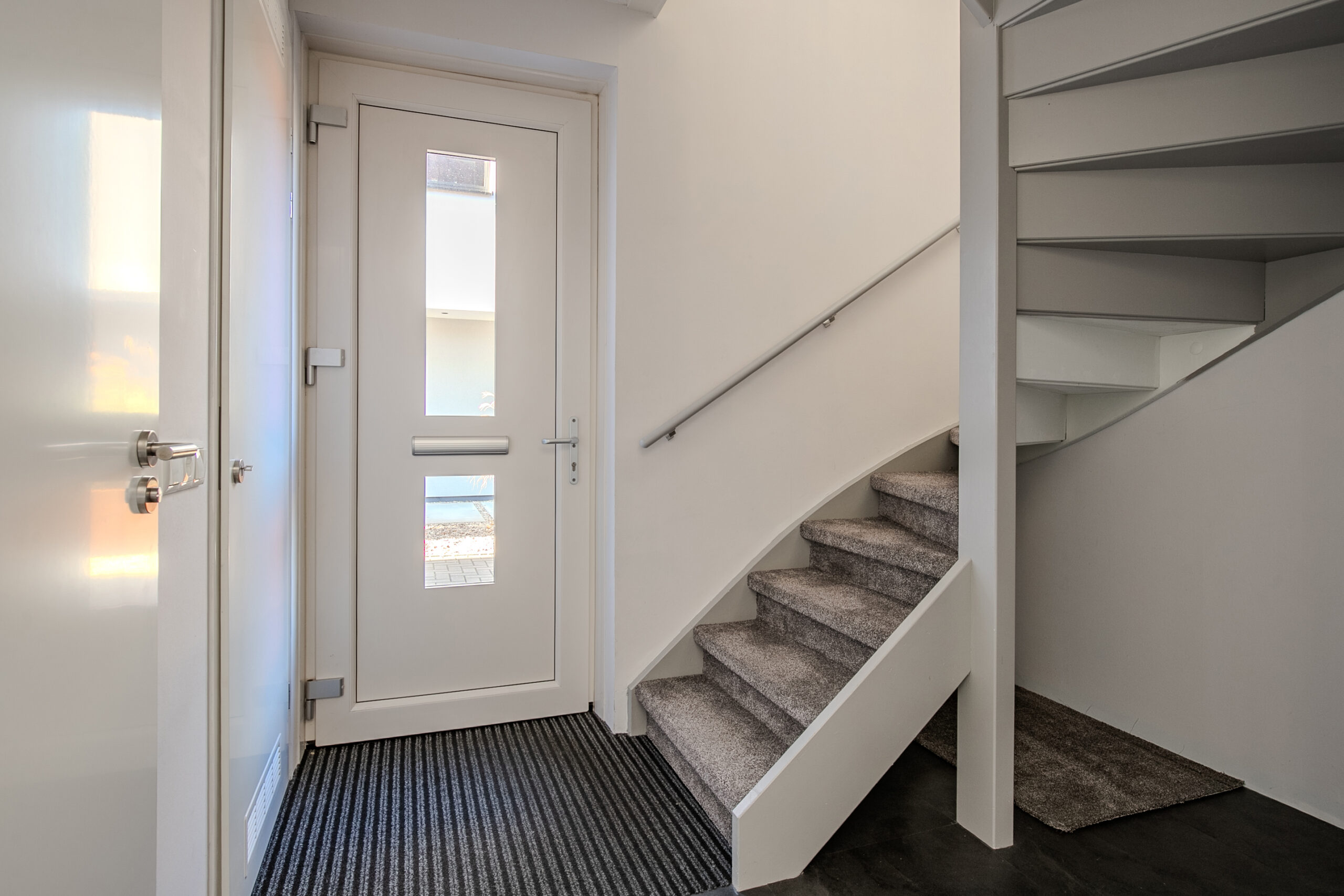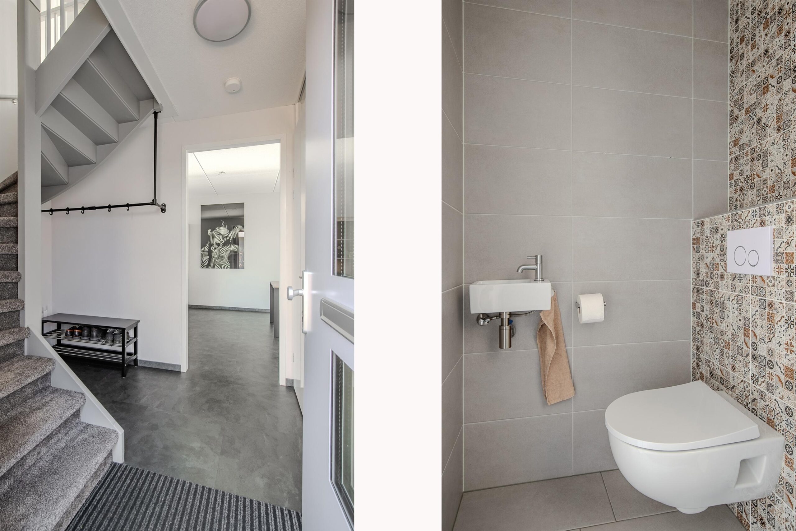 We betreden de woning in de ruime en lichte ontvangsthal, voorzien van een moderne pvc-vloer, trapopgang, meterkast en een betegeld gastentoilet met zwevend closet en fonteintje. De hal biedt toegang tot de woonkamer en ademt direct de verzorgde, moderne afwerking van de woning uit.