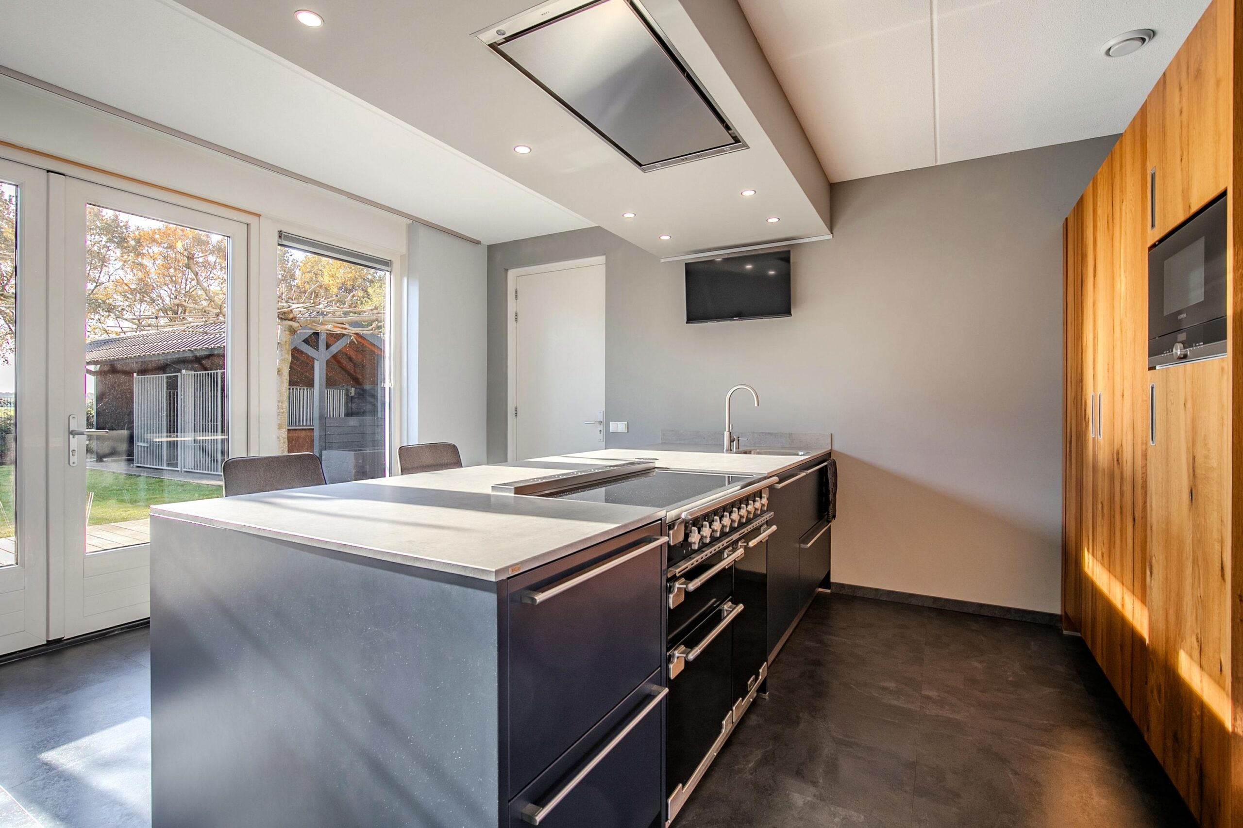 De open keuken met aanbouw is werkelijk het hart van het huis. Hier komt koken, samenzijn en genieten samen. De luxe keukenopstelling met kookeiland is uitgevoerd met hoogwaardige inbouwapparatuur: een vaatwasser, koelkast, magnetron, afzuigkap en een imposant “Falcon” fornuis met 5-pits inductiekookplaat, twee ovens en grill. Het keramische werkblad en de vele kastruimtes en lades bieden zowel stijl als functionaliteit.